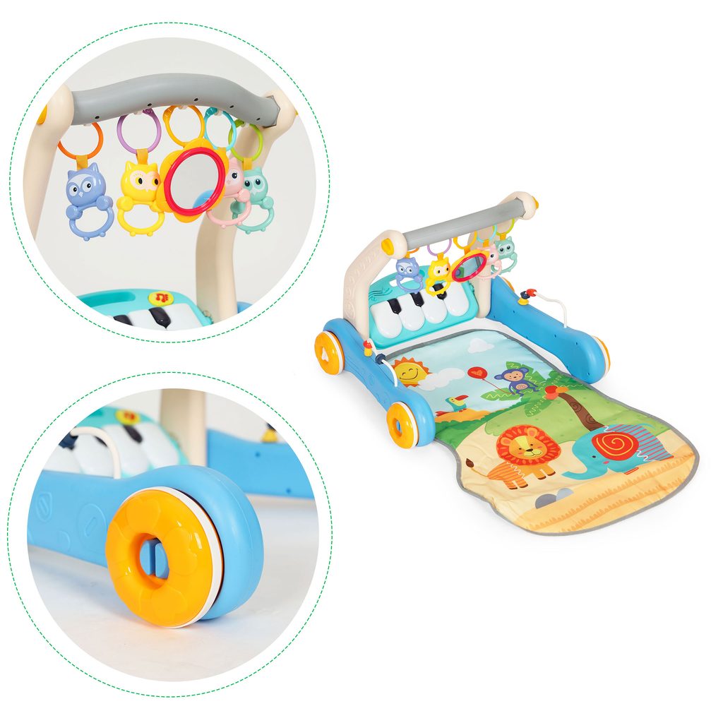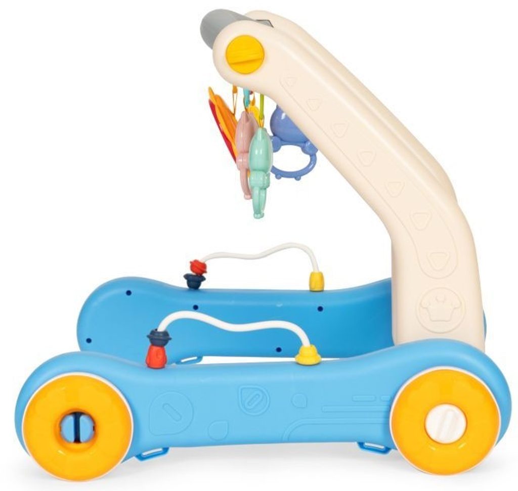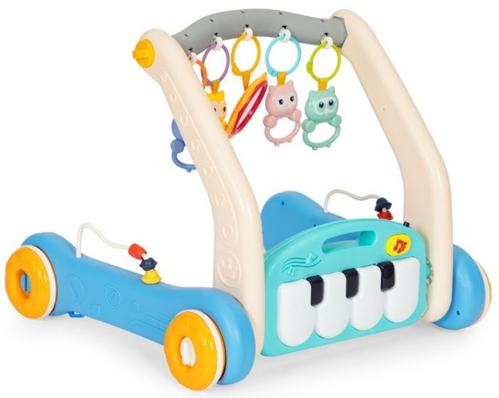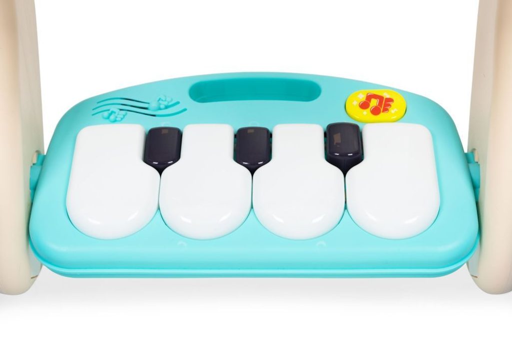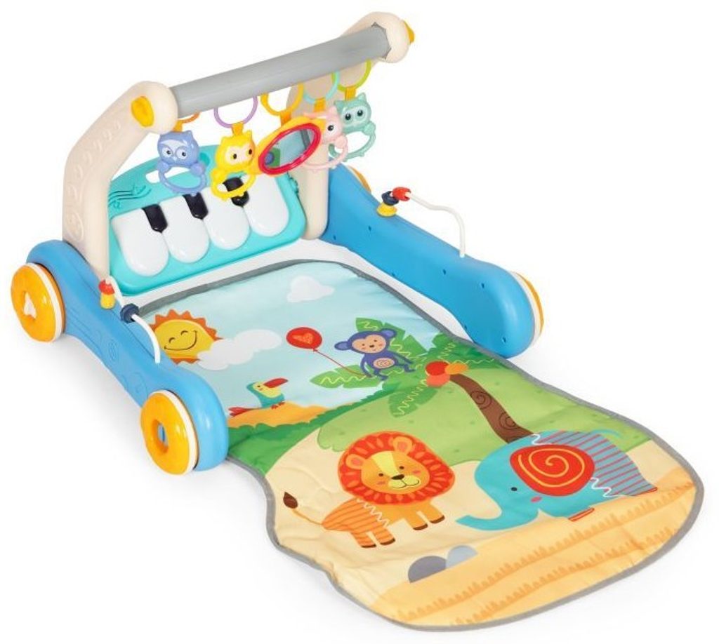 Chodítko s hrací dekou Haunger 2v1 Rack Walker je určeno Vašemu dítěti už od narození. Součástí deky je hrazdička, která slouží také jako madlo chodítka se zavěšenými chrastítky a malinkým zrcadlem a také pianko, které svítí a hraje melodie. Dítě si může v leže hrát s chrastítky a sledovat se u toho v zrcátku a pianko může být využito jako uspávací melodie. Na břiše se dítě naučí zvedat hlavičku a pozorovat věci kolem sebe, pomůže mu k prvním krůčkům a zároveň odděluje dítě od chladné podlahy.