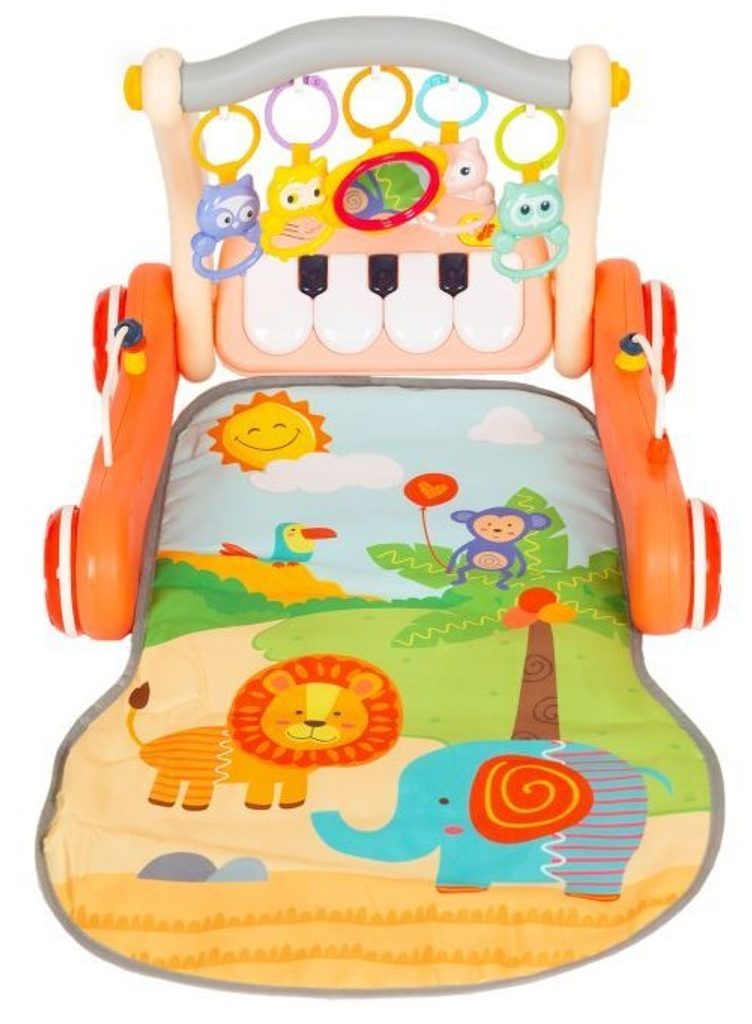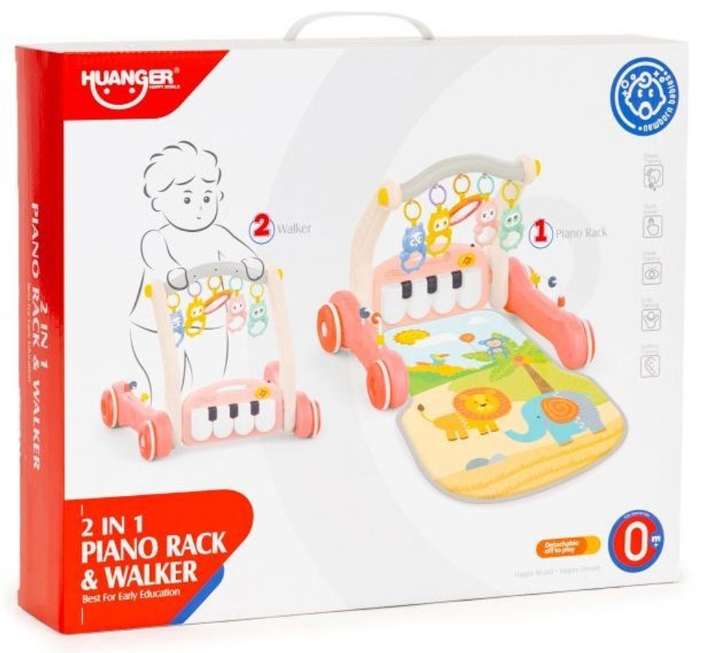Chodítko s hrací dekou Haunger 2v1 Rack Walker je určeno Vašemu dítěti už od narození. Součástí deky je hrazdička, která slouží také jako madlo chodítka se zavěšenými chrastítky a malinkým zrcadlem a také pianko, které svítí a hraje melodie. Dítě si může v leže hrát s chrastítky a sledovat se u toho v zrcátku a pianko může být využito jako uspávací melodie. Na břiše se dítě naučí zvedat hlavičku a pozorovat věci kolem sebe, pomůže mu k prvním krůčkům a zároveň odděluje dítě od chladné podlahy.