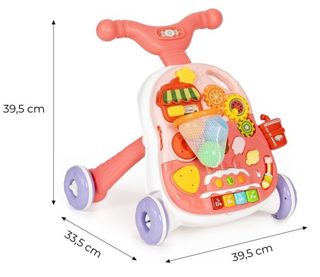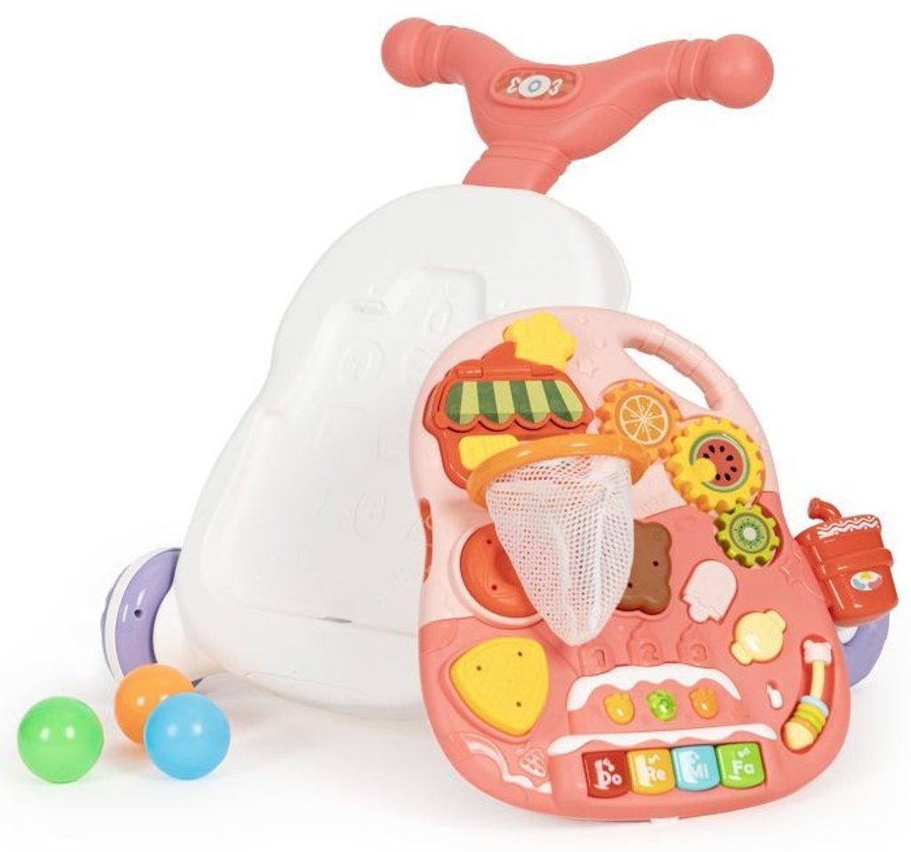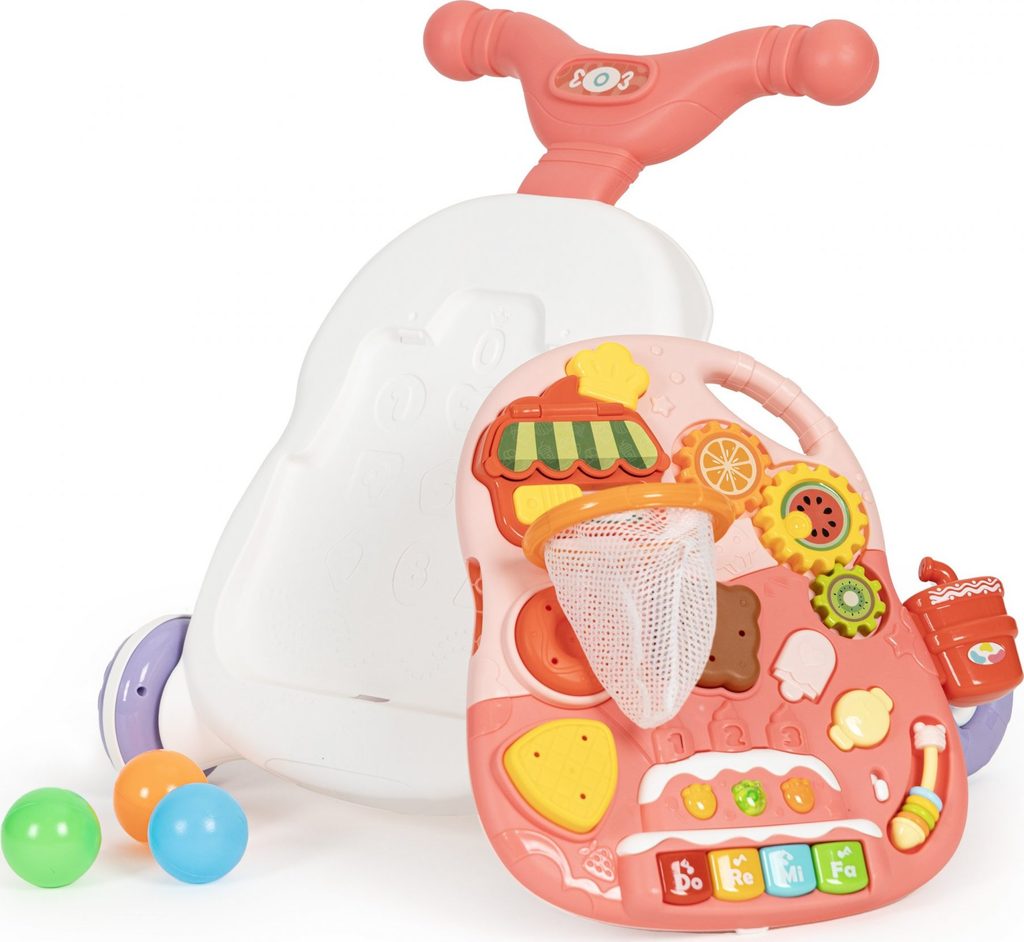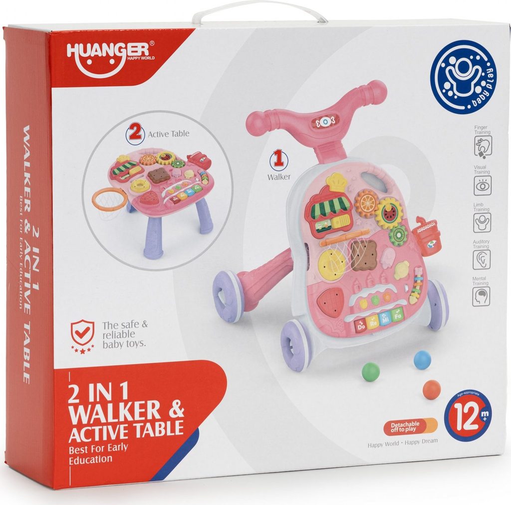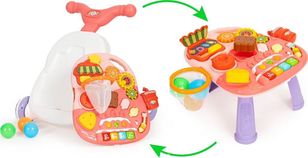 Dětské multifunkční chodítko Active Table 2v1 pro ty nejmenší děti, edukační centrum. Lze ho využít jako samostatné chodítko nebo hudební stoleček pro sedící děti. Panel je vybaven piánem s podsvícenými klávesami, otevírací mušlí, košíkovou se 3 míčky, otáčivými ozubenými kolečky a spoustou dalších zábavných prvků. V horní části chodítka je umístěn držák pomocí kterého dítě snadno udrží rovnováhu a nespadne na zem. Kolečka mají protiskluzovou úpravu a brzdu. Určeno pro děti od 12 měsíců věku a je ideální hračkou pro nauku prvních krůčků.