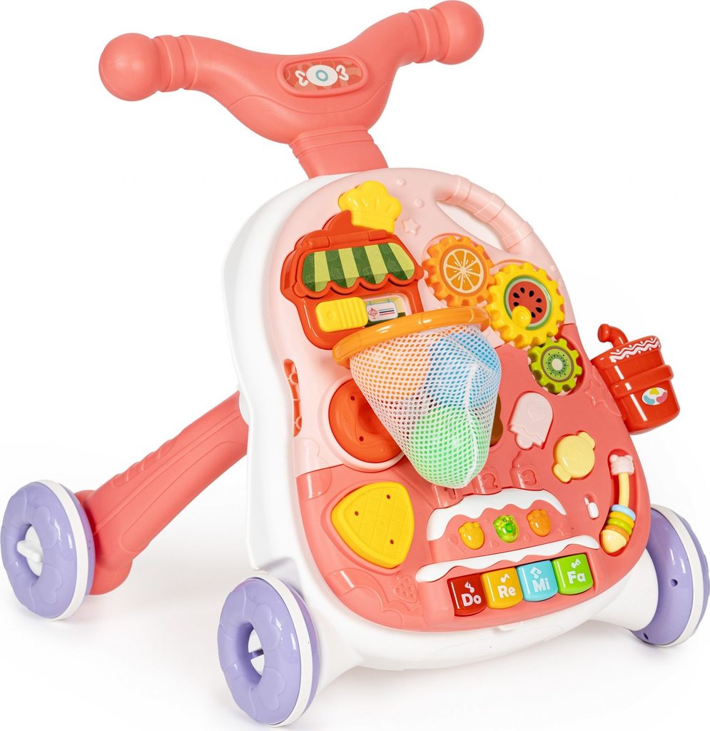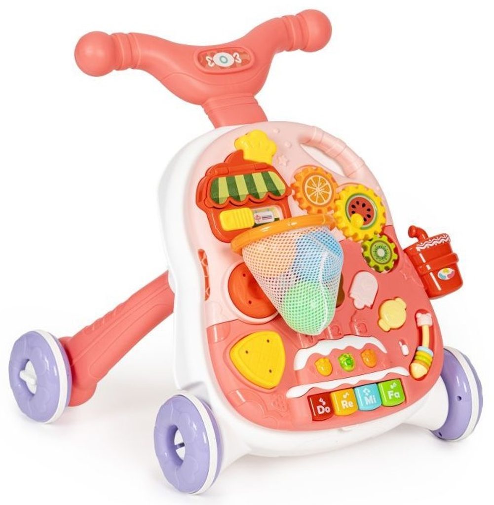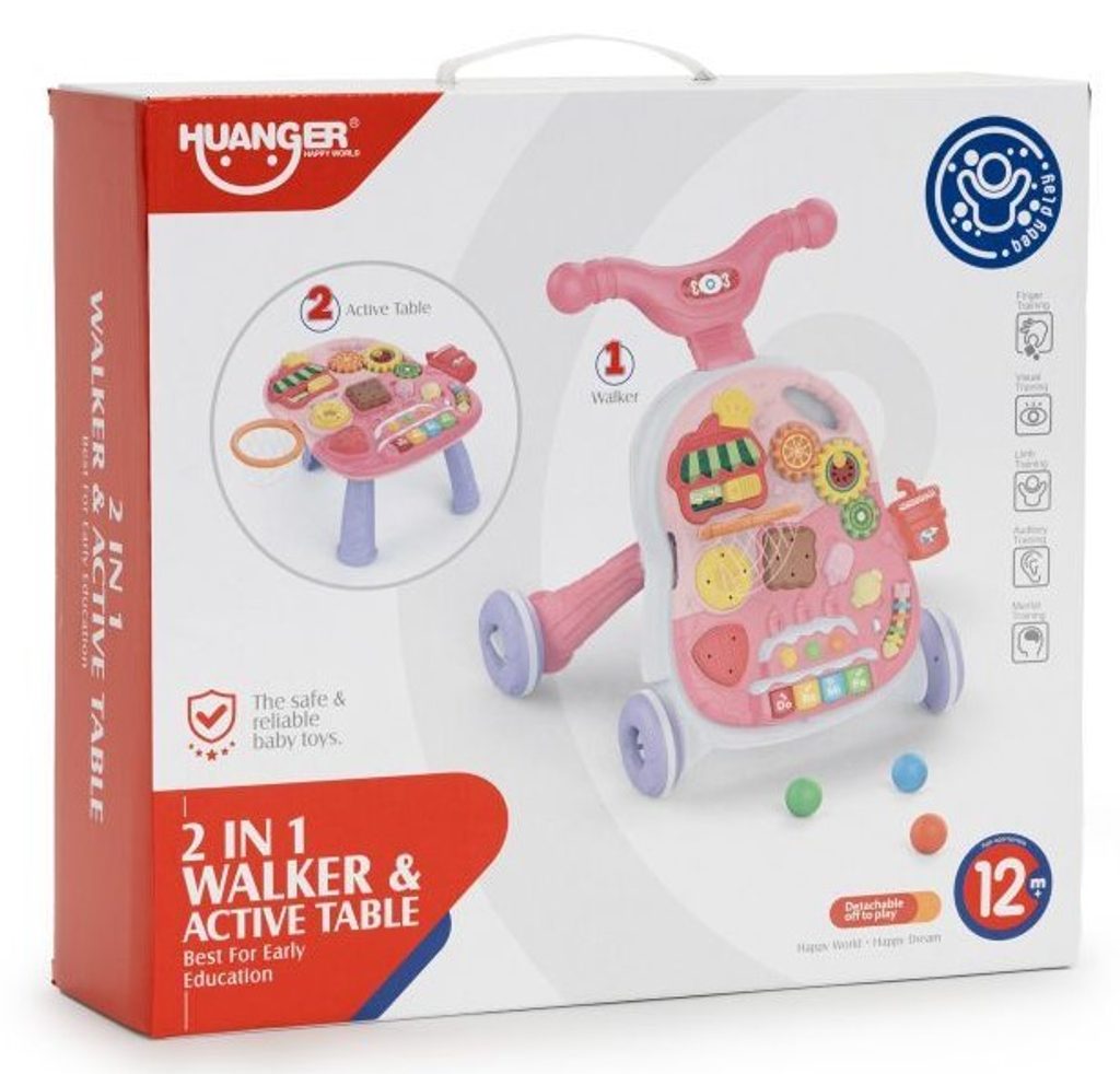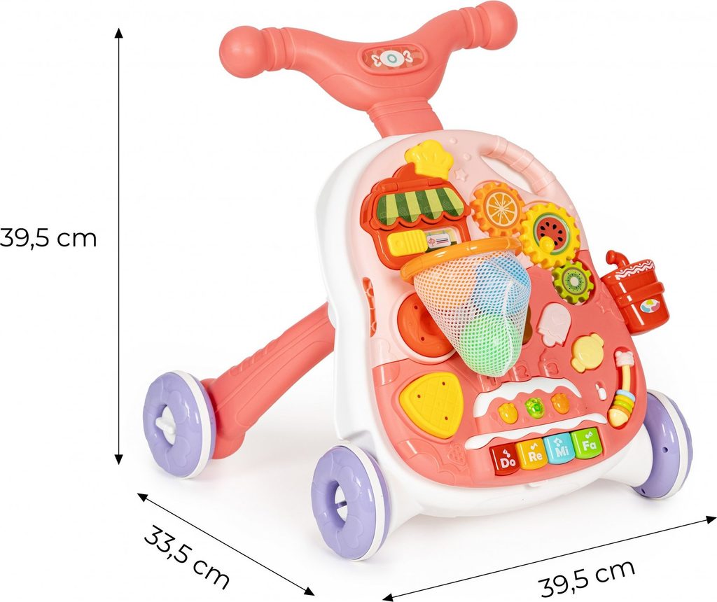 Dětské multifunkční chodítko Active Table 2v1 pro ty nejmenší děti, edukační centrum. Lze ho využít jako samostatné chodítko nebo hudební stoleček pro sedící děti. Panel je vybaven piánem s podsvícenými klávesami, otevírací mušlí, košíkovou se 3 míčky, otáčivými ozubenými kolečky a spoustou dalších zábavných prvků. V horní části chodítka je umístěn držák pomocí kterého dítě snadno udrží rovnováhu a nespadne na zem. Kolečka mají protiskluzovou úpravu a brzdu. Určeno pro děti od 12 měsíců věku a je ideální hračkou pro nauku prvních krůčků.