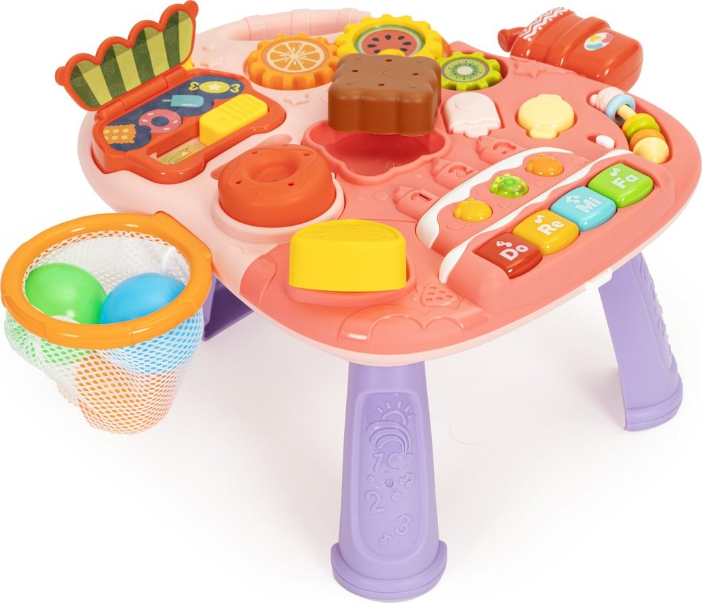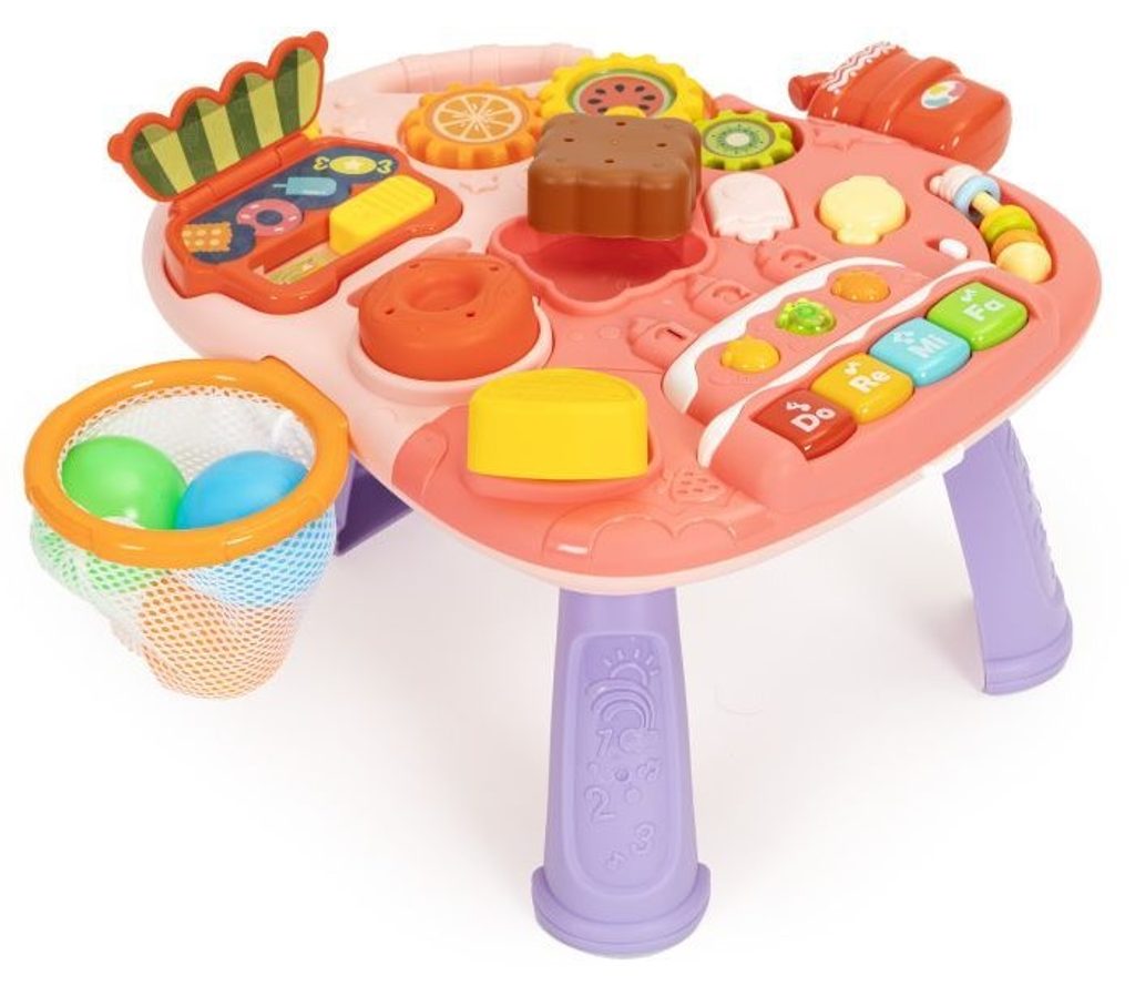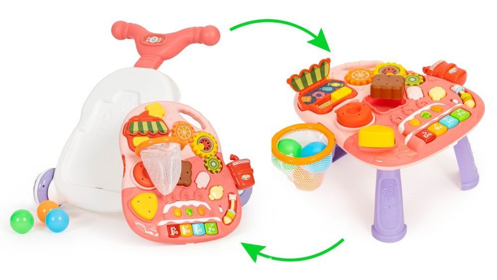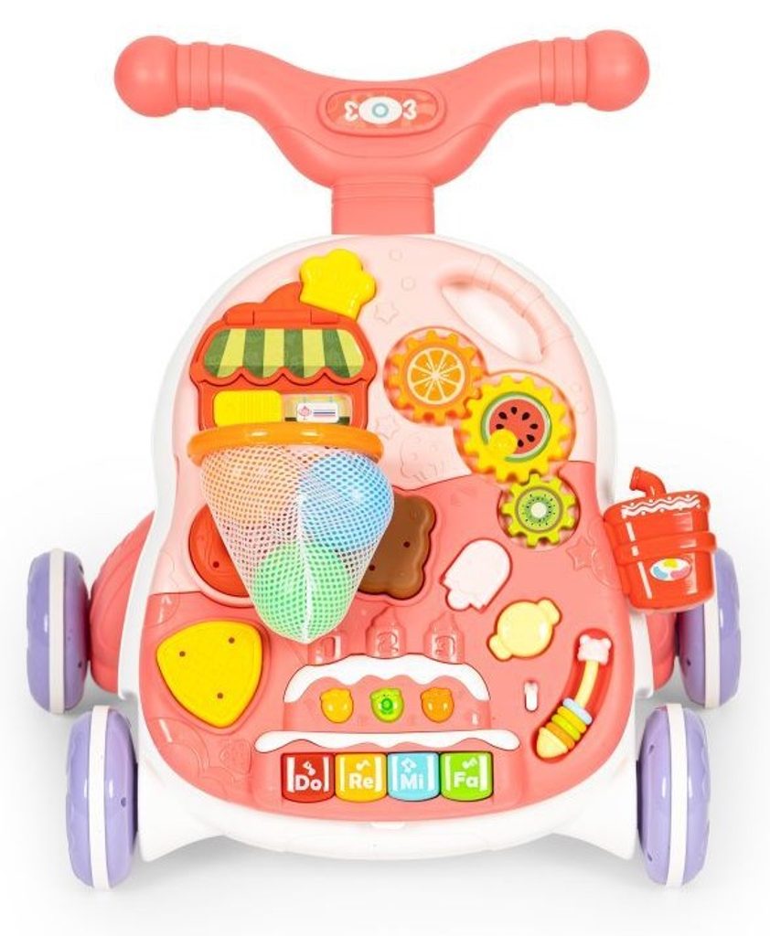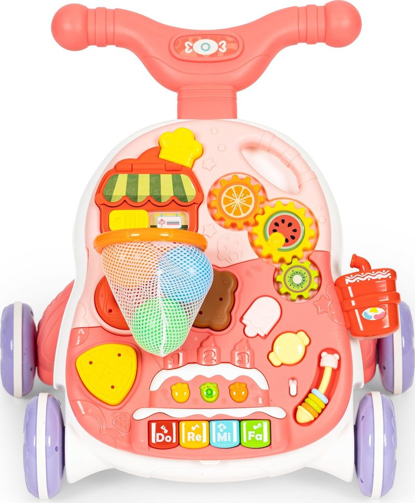 Dětské multifunkční chodítko Active Table 2v1 pro ty nejmenší děti, edukační centrum. Lze ho využít jako samostatné chodítko nebo hudební stoleček pro sedící děti. Panel je vybaven piánem s podsvícenými klávesami, otevírací mušlí, košíkovou se 3 míčky, otáčivými ozubenými kolečky a spoustou dalších zábavných prvků. V horní části chodítka je umístěn držák pomocí kterého dítě snadno udrží rovnováhu a nespadne na zem. Kolečka mají protiskluzovou úpravu a brzdu. Určeno pro děti od 12 měsíců věku a je ideální hračkou pro nauku prvních krůčků.