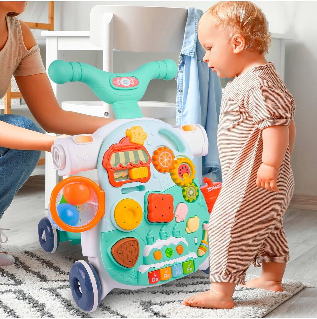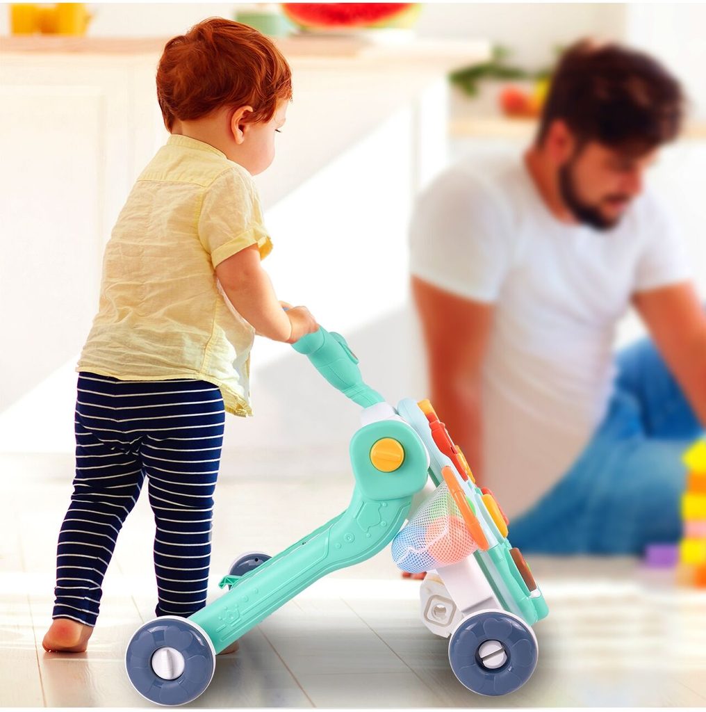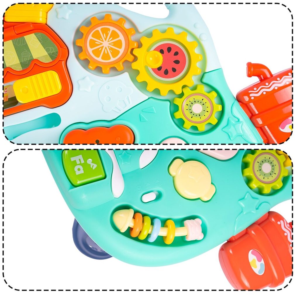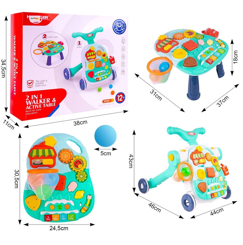 Dětské multifunkční chodítko Active Table 2v1 pro ty nejmenší děti, edukační centrum. Lze ho využít jako samostatné chodítko nebo hudební stoleček pro sedící děti. Panel je vybaven piánem s podsvícenými klávesami, otevírací mušlí, košíkovou se 3 míčky, otáčivými ozubenými kolečky a spoustou dalších zábavných prvků. V horní části chodítka je umístěn držák pomocí kterého dítě snadno udrží rovnováhu a nespadne na zem. Kolečka mají protiskluzovou úpravu a brzdu. Určeno pro děti od 12 měsíců věku a je ideální hračkou pro nauku prvních krůčků.