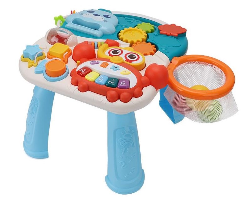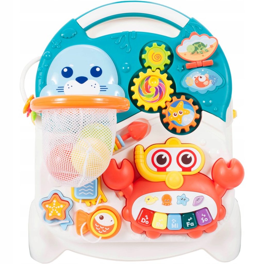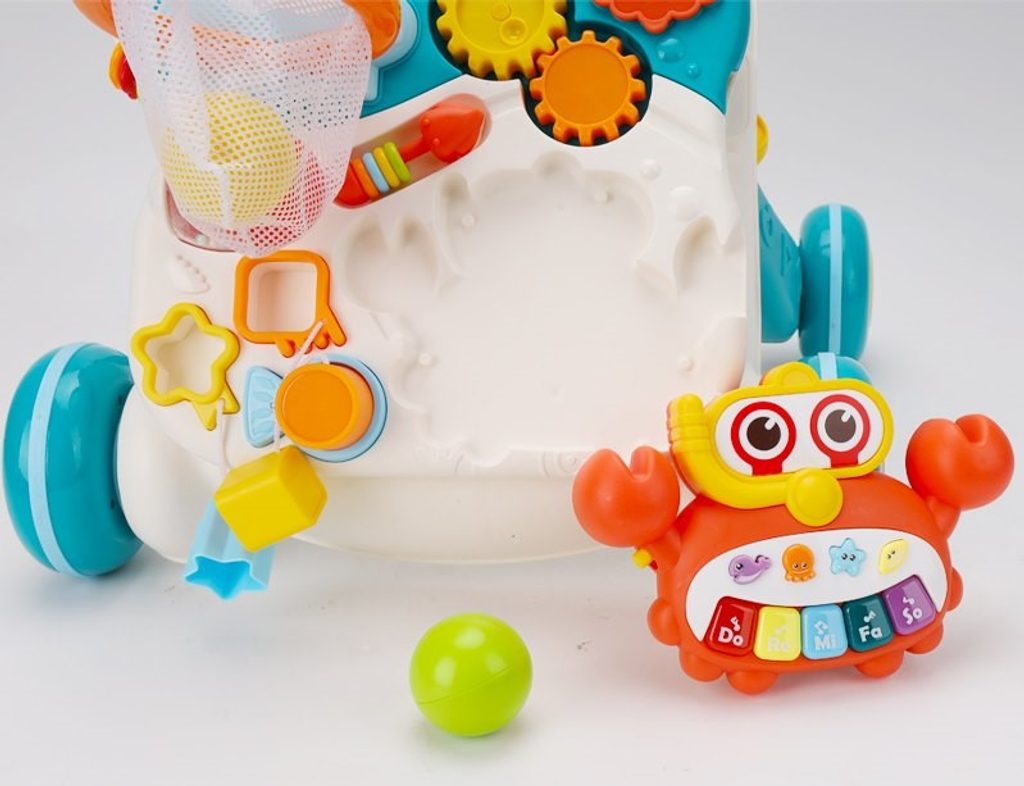 Dětské multifunkční chodítko Active Table 2v1 pro ty nejmenší děti, edukační centrum. Lze ho využít jako samostatné chodítko nebo hudební stoleček pro sedící děti. Panel je vybaven odnímatelným piánem s podsvícenými klávesami ve tvaru kraba, otočnou knížečkou ve tvaru mušle s obrázky zvířátek, košíkovou se 3 míčky, otáčivými ozubenými kolečky a spoustou dalších zábavných prvků. V horní části chodítka je umístěn držák pomocí kterého dítě snadno udrží rovnováhu a nespadne na zem. Kolečka mají protiskluzovou úpravu a brzdu. Určeno pro děti od 12 měsíců věku a je ideální hračkou pro nauku prvních krůčků.
