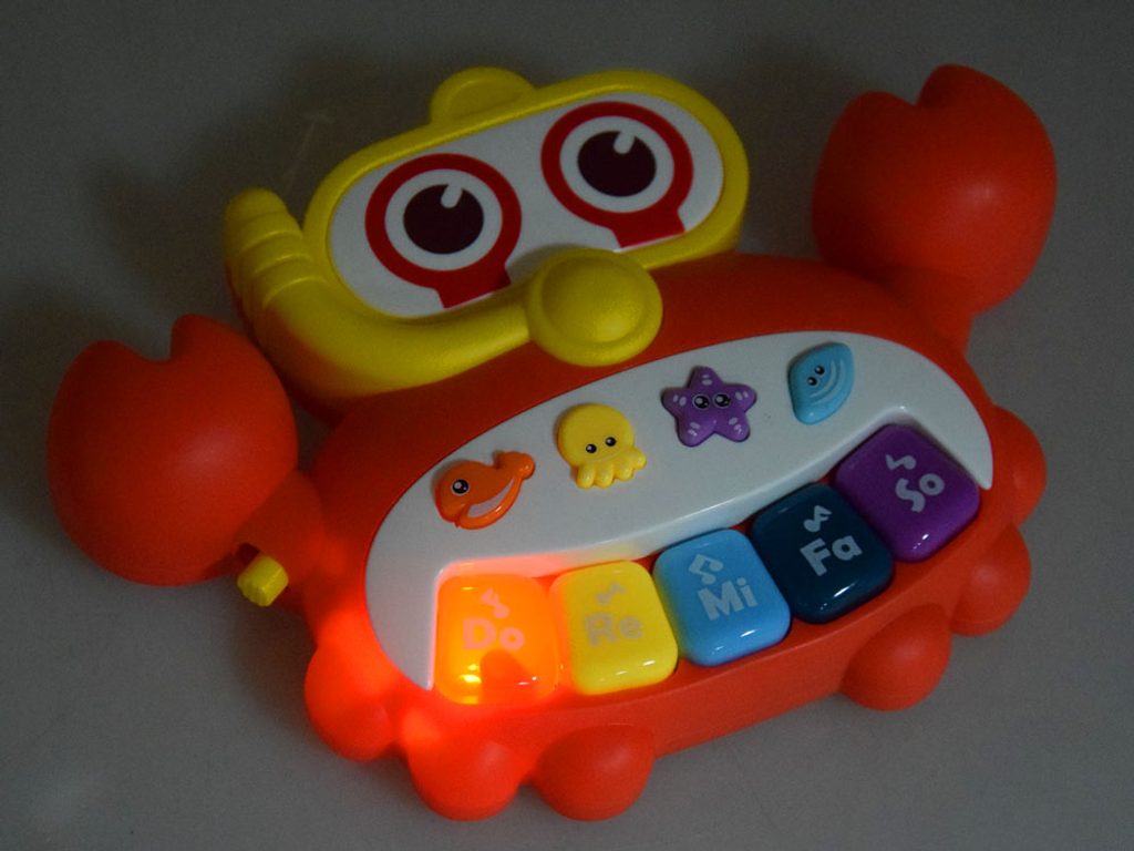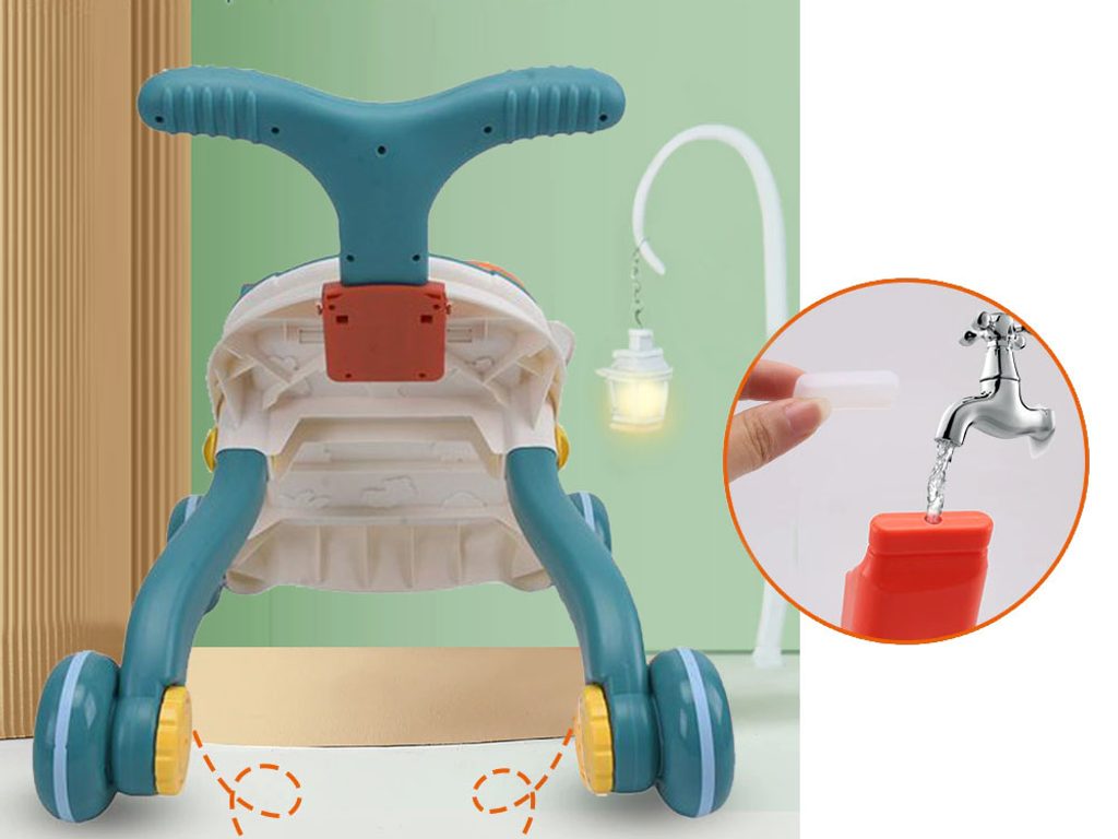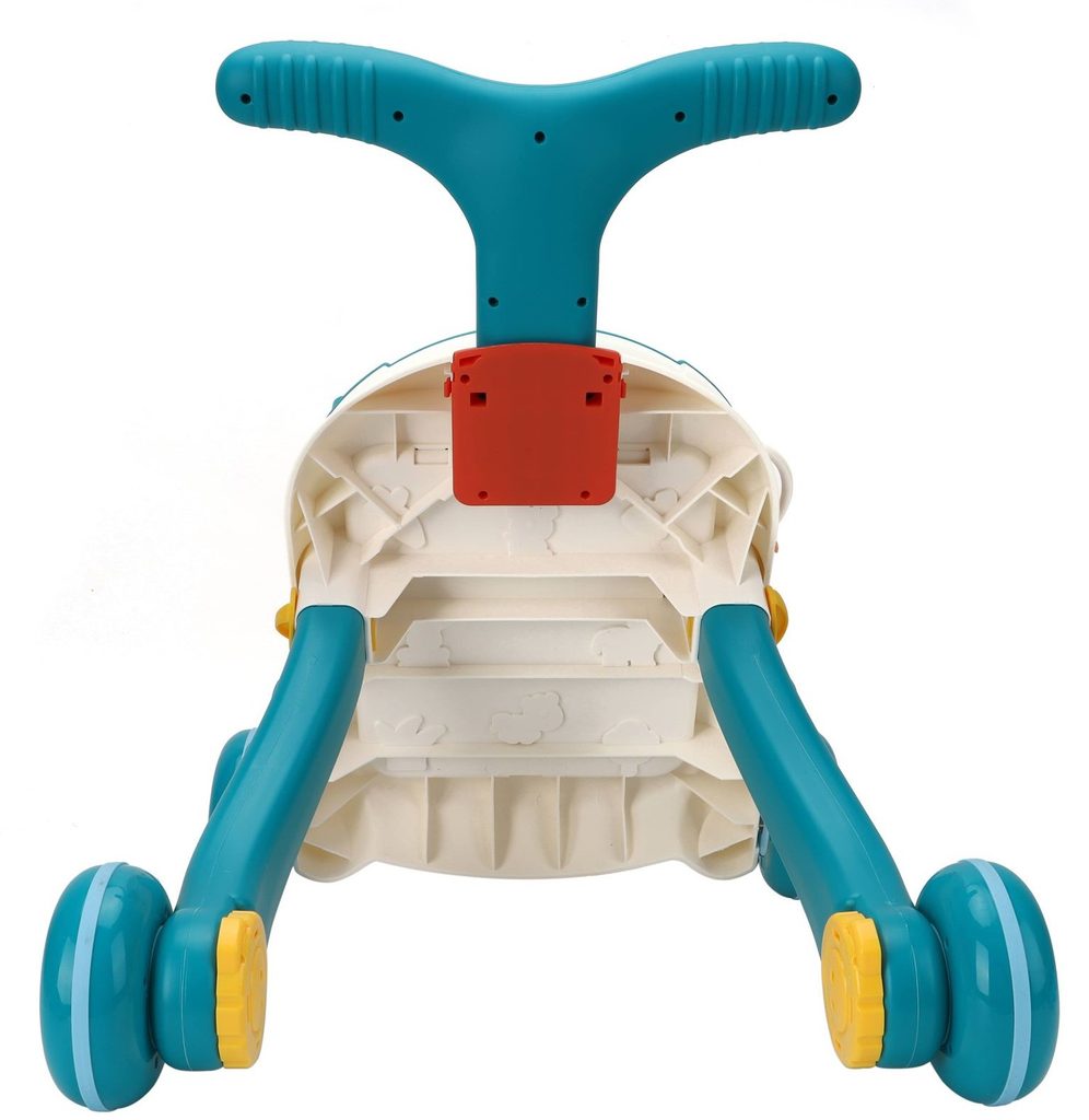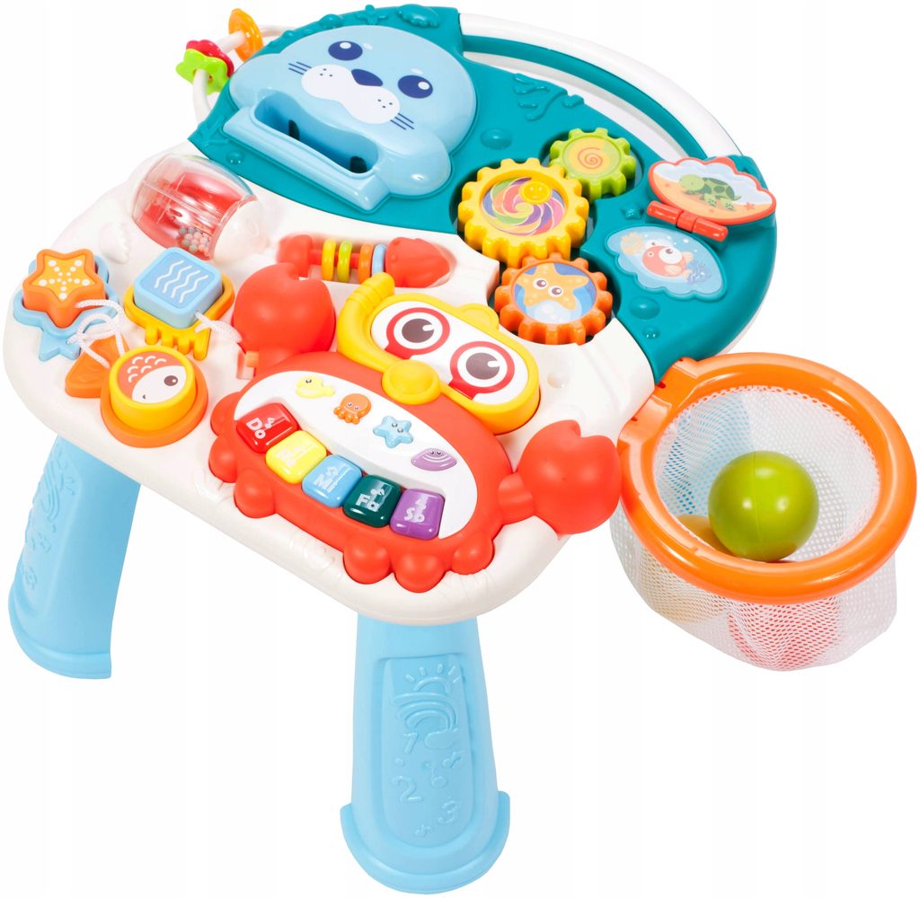Dětské multifunkční chodítko Active Table 2v1 pro ty nejmenší děti, edukační centrum. Lze ho využít jako samostatné chodítko nebo hudební stoleček pro sedící děti. Panel je vybaven odnímatelným piánem s podsvícenými klávesami ve tvaru kraba, otočnou knížečkou ve tvaru mušle s obrázky zvířátek, košíkovou se 3 míčky, otáčivými ozubenými kolečky a spoustou dalších zábavných prvků. V horní části chodítka je umístěn držák pomocí kterého dítě snadno udrží rovnováhu a nespadne na zem. Kolečka mají protiskluzovou úpravu a brzdu. Určeno pro děti od 12 měsíců věku a je ideální hračkou pro nauku prvních krůčků.