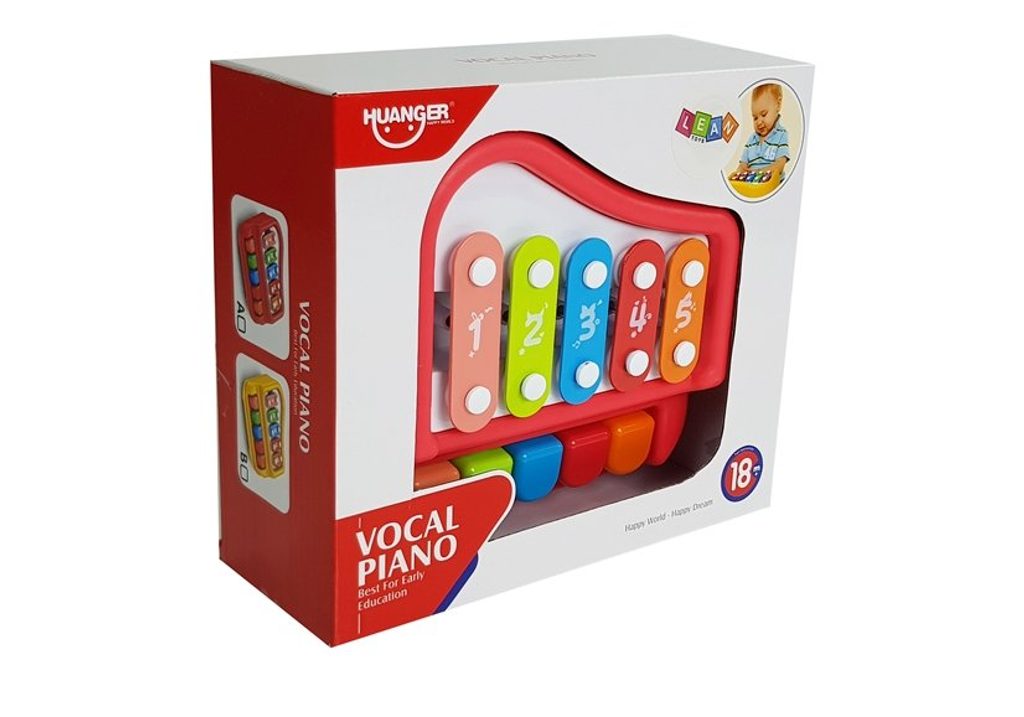 Haunger dětské cimbálky Vocal Piano jsou určeny pro ty nejmenší děti. V horní části je umístěno 6 barevných destiček s vyobrazenými číslicemi na které lze hrát pomocí dvou přiložených paliček. V přední části je potom umístěno 6 barevných klávesnic. Součástí balení je také 6 barevných kartiček s vyobrazenými melodiemi. Cimbálky jsou ideální hračkou pro rozvoj manuálních schopností, zraku, logického myšlení, rozpoznávání barev a číslic. Hračka je určena pro děti od 18 měsíců věku.