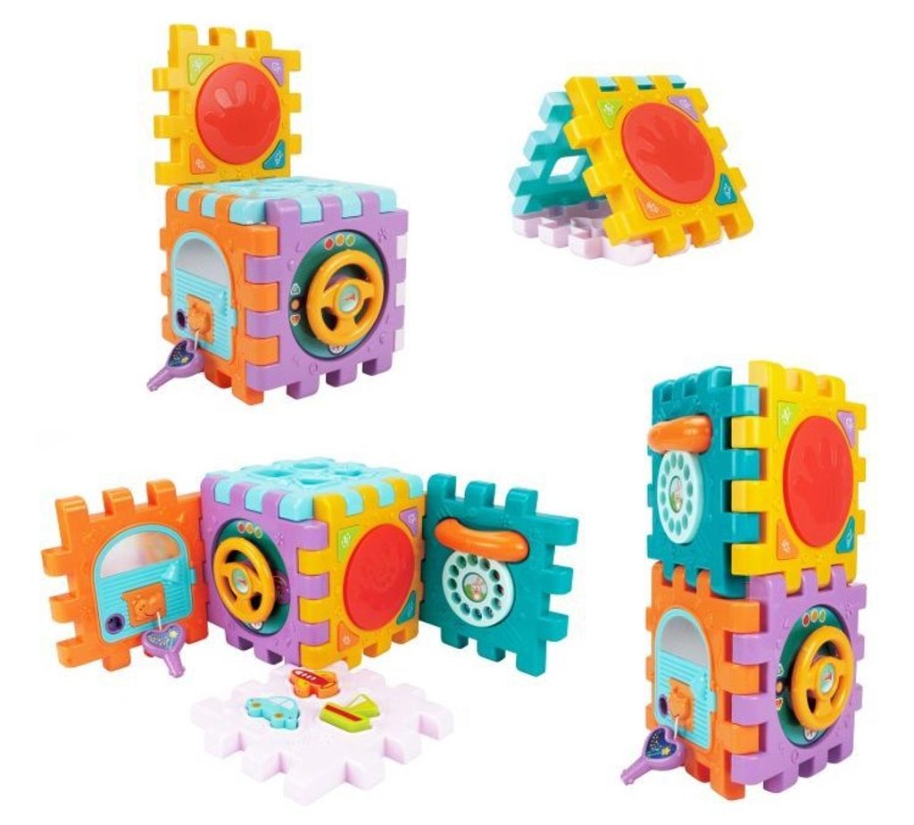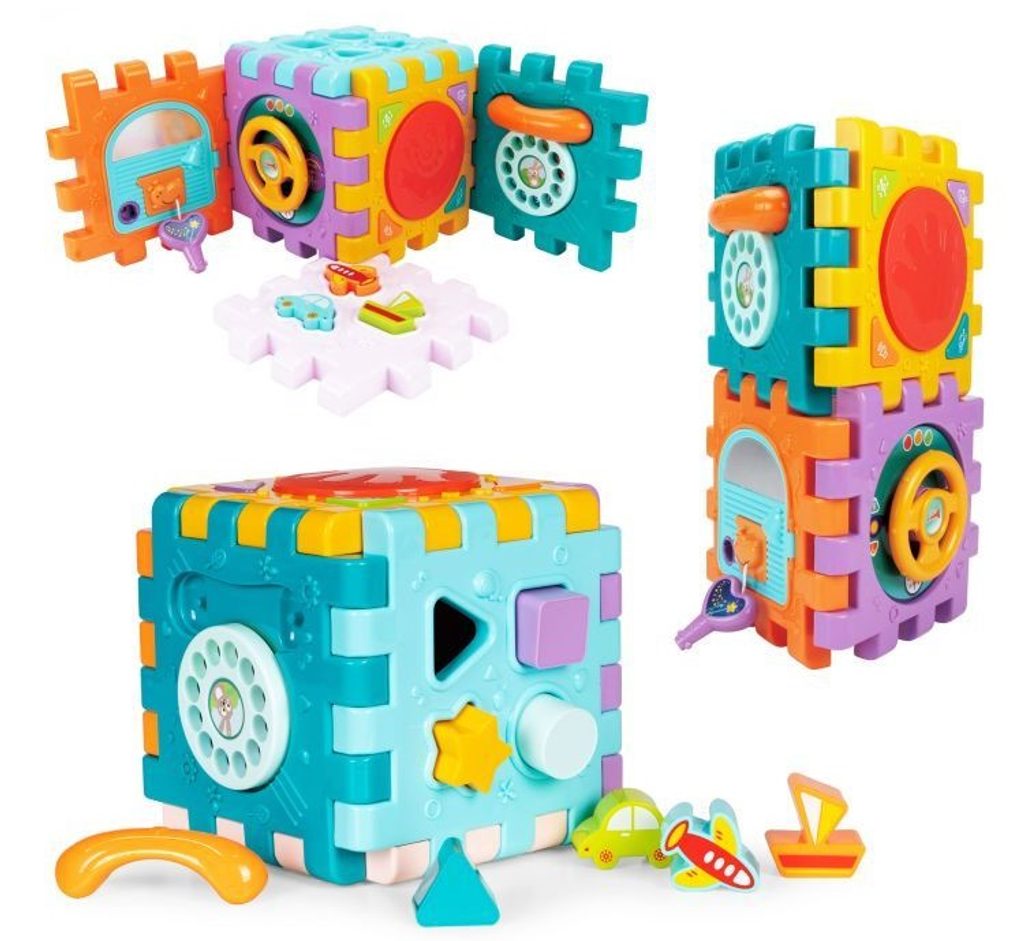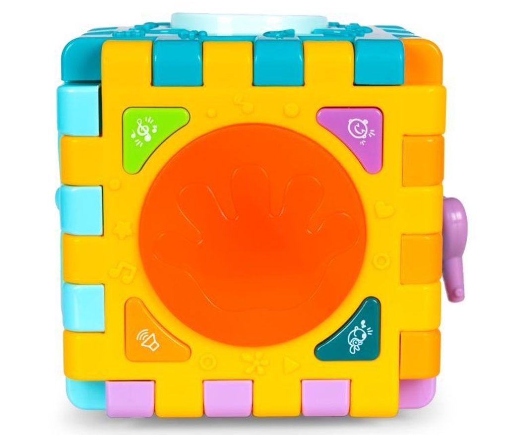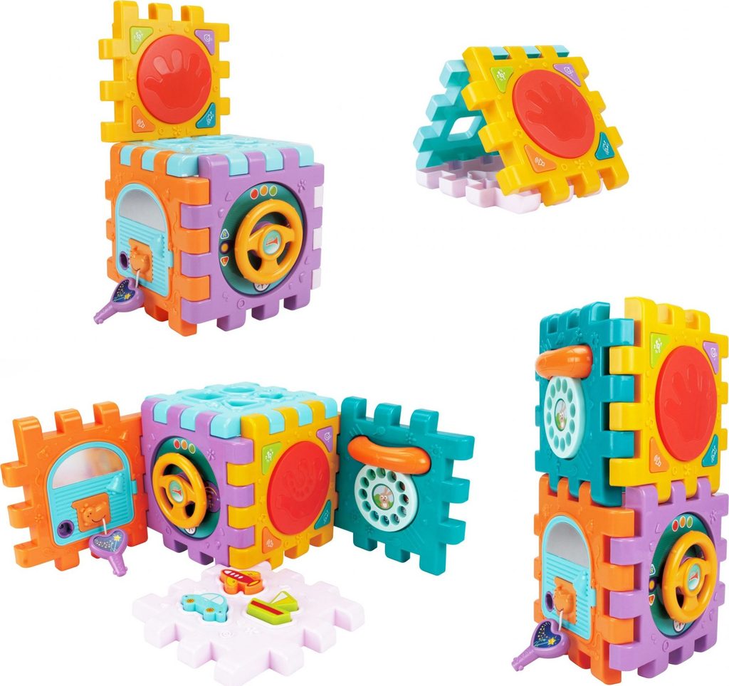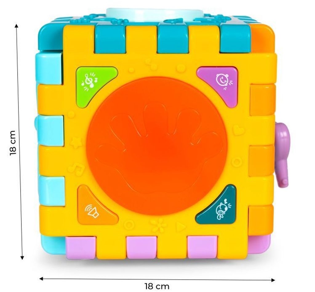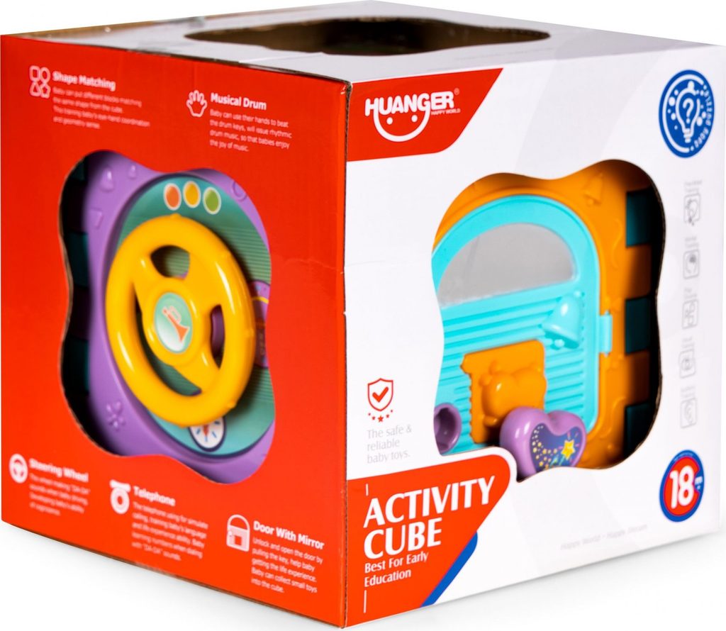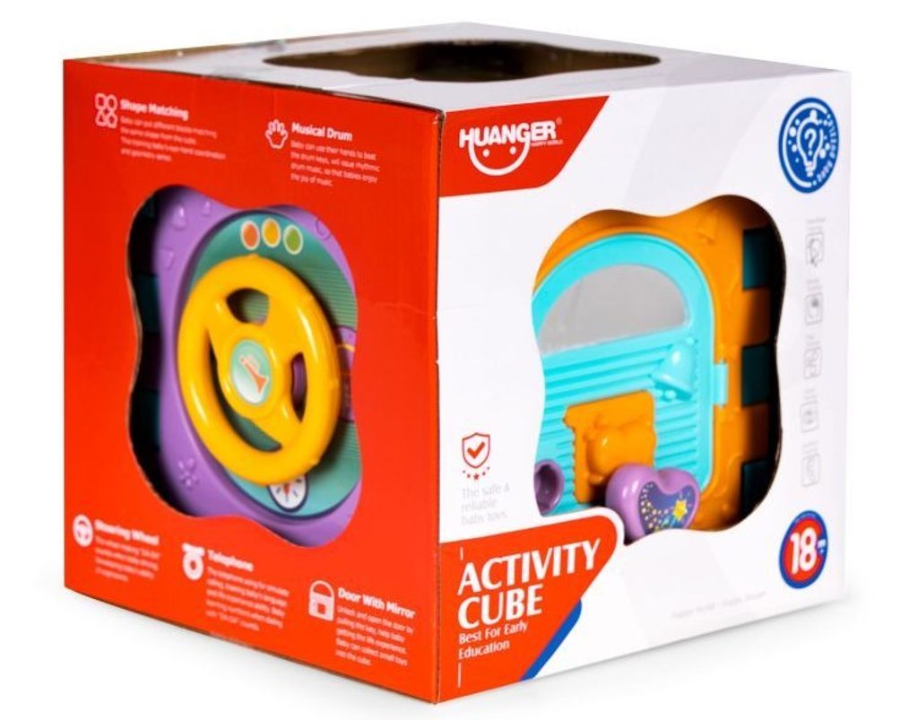 Haunger edukační multikostka Activity Cube pro ty nejmenší děti. Skládá se z 6 velkých puzzle a 7 barevných kostek v různých tvarech. Každá stěna kostky má jinou barvu a plní jinou funkci. Kostka je ideální hračkou pro rozvoj dětské motoriky, hmatu, zraku, logického myšlení, rozpoznávání barev a tvarů. Hračka je určena pro děti od 18 měsíců věku.