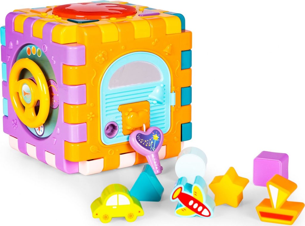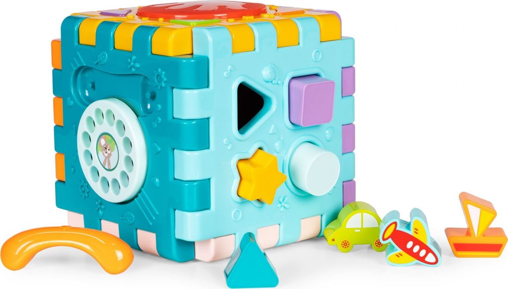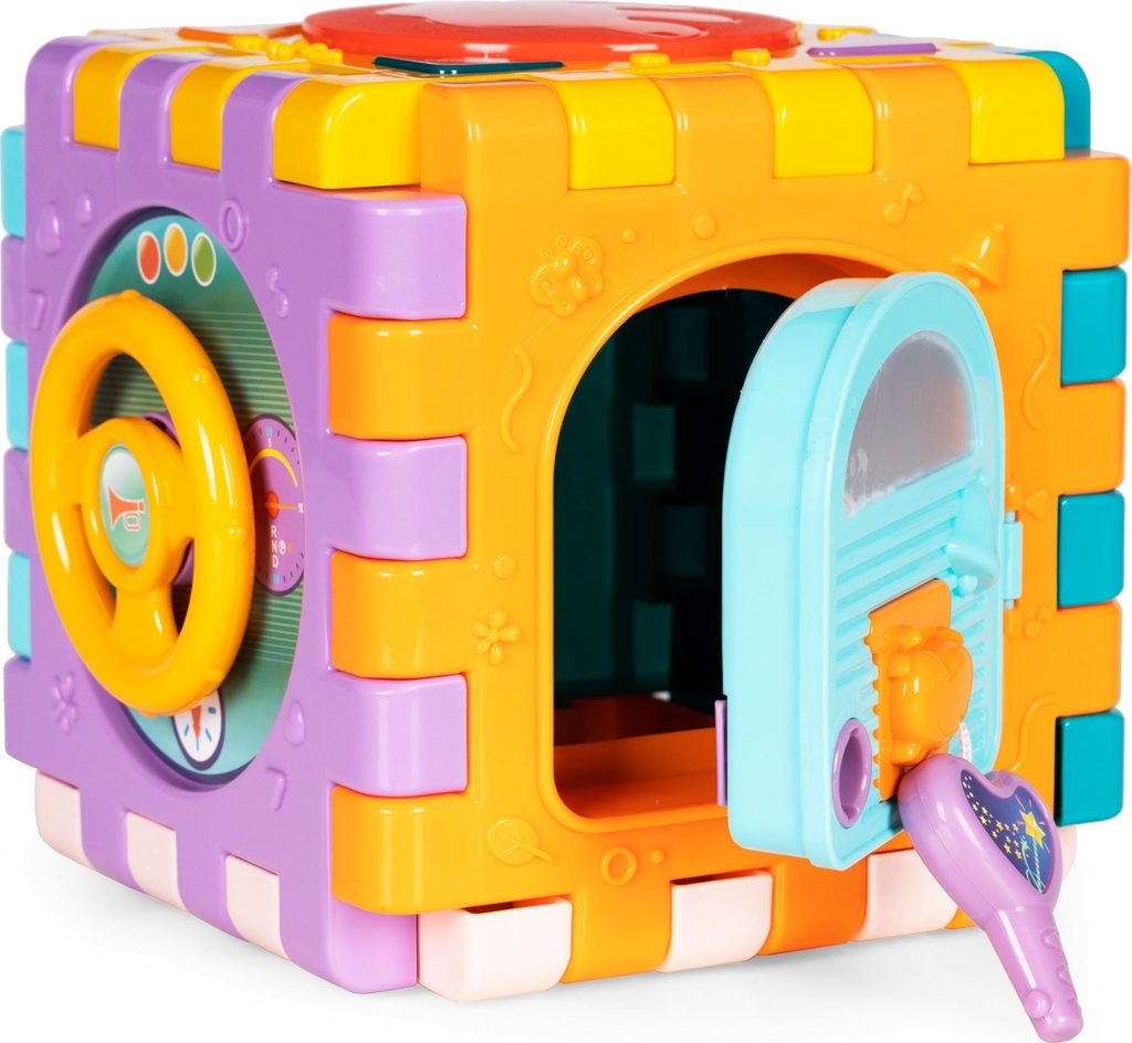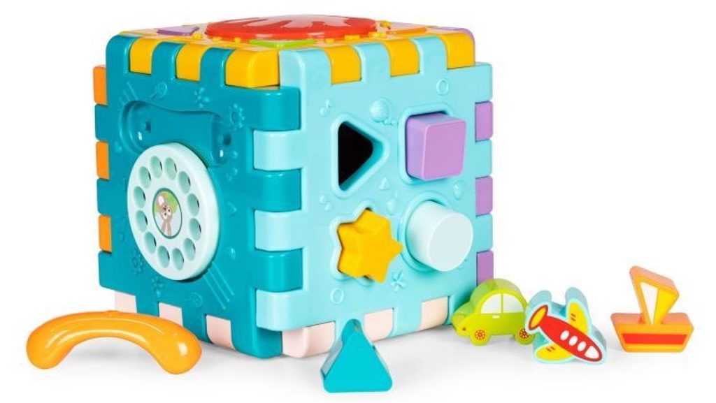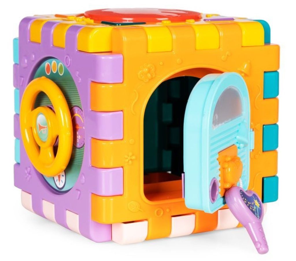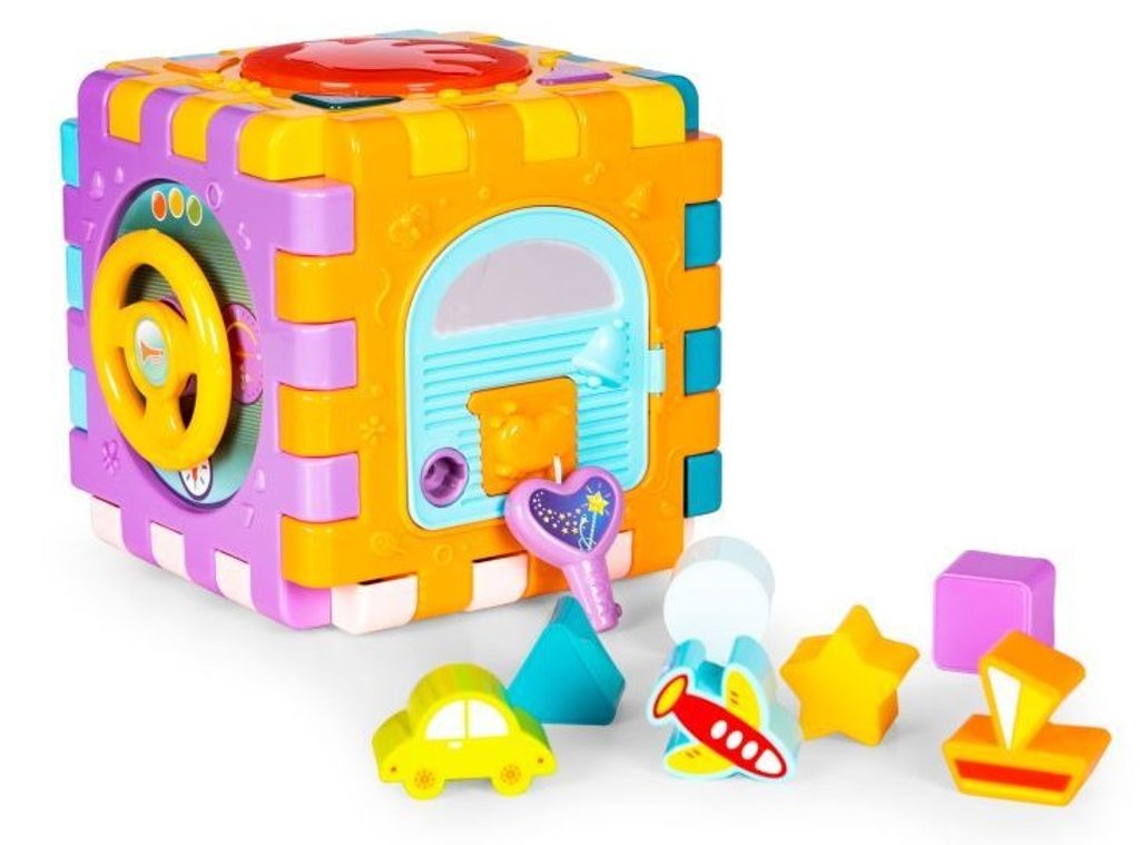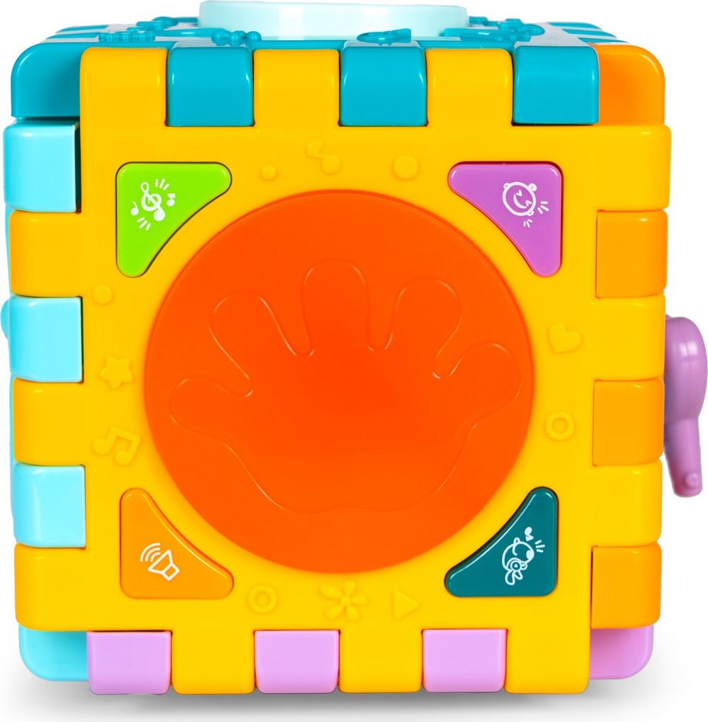 Haunger edukační multikostka Activity Cube pro ty nejmenší děti. Skládá se z 6 velkých puzzle a 7 barevných kostek v různých tvarech. Každá stěna kostky má jinou barvu a plní jinou funkci. Kostka je ideální hračkou pro rozvoj dětské motoriky, hmatu, zraku, logického myšlení, rozpoznávání barev a tvarů. Hračka je určena pro děti od 18 měsíců věku.