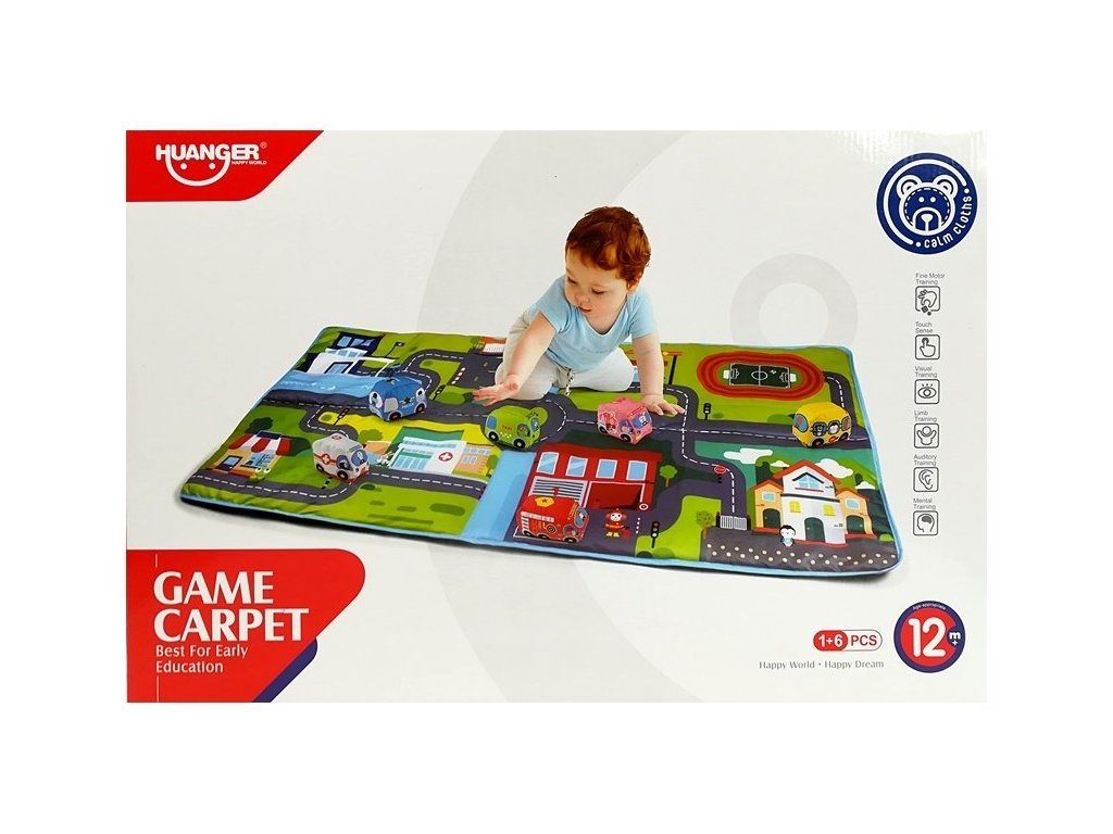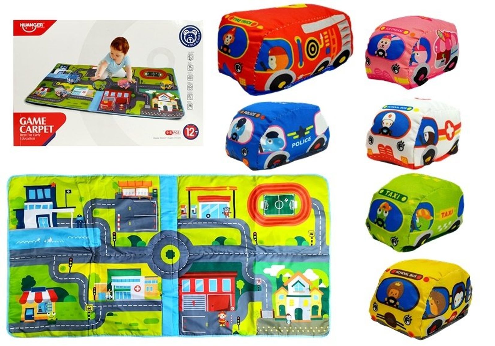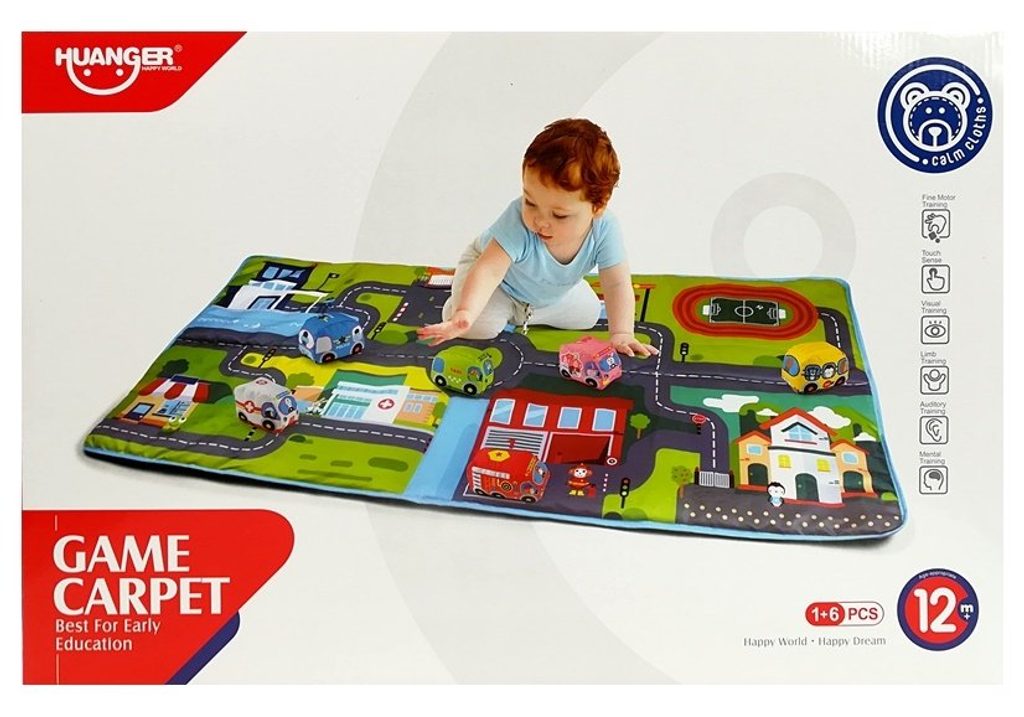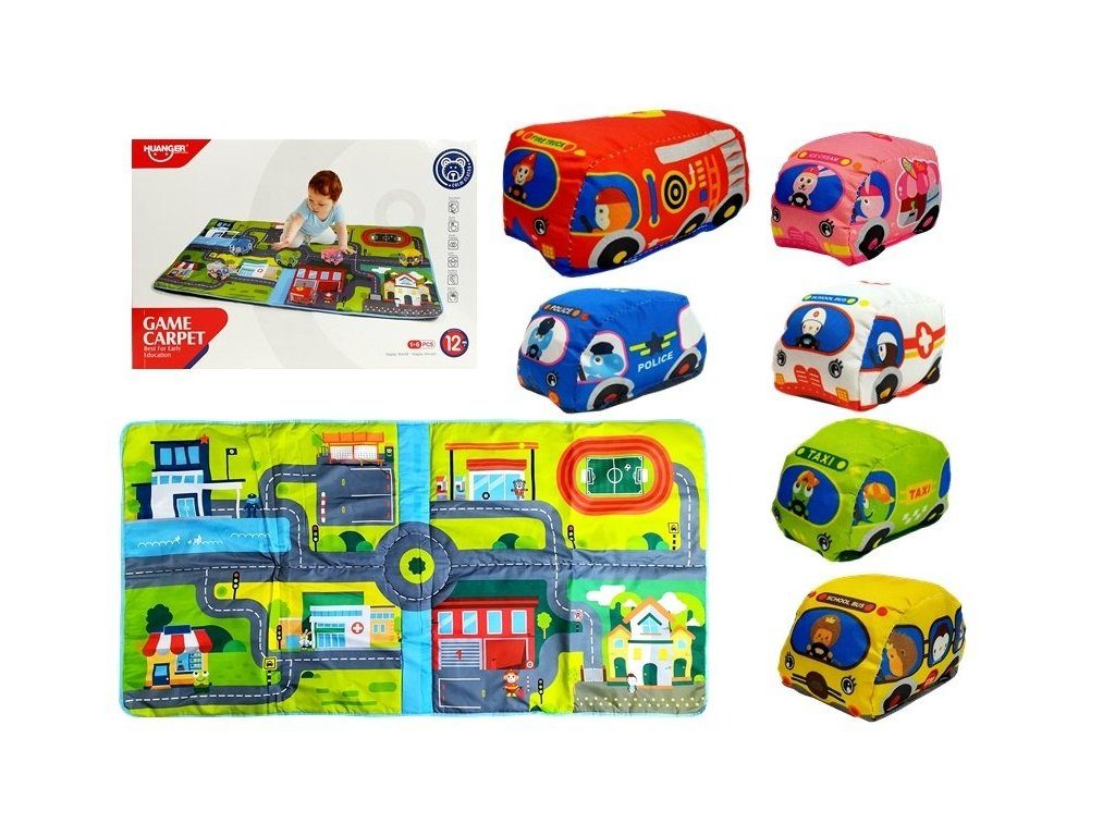 Barevná hrací deka Haunger Game Carpet je určena pro děti od 12 měsíců věku. Měkká deka má rozměry 152x80 cm. Součástí balení je 6 měkkých látkových autíček s výplní, které vydávají různé zvuky. Autobus, policejní auto a taxík šustí, zmrzlinový vůz a sanitka vydávají zvuk zvonku a hasičské auto imituje troubení.