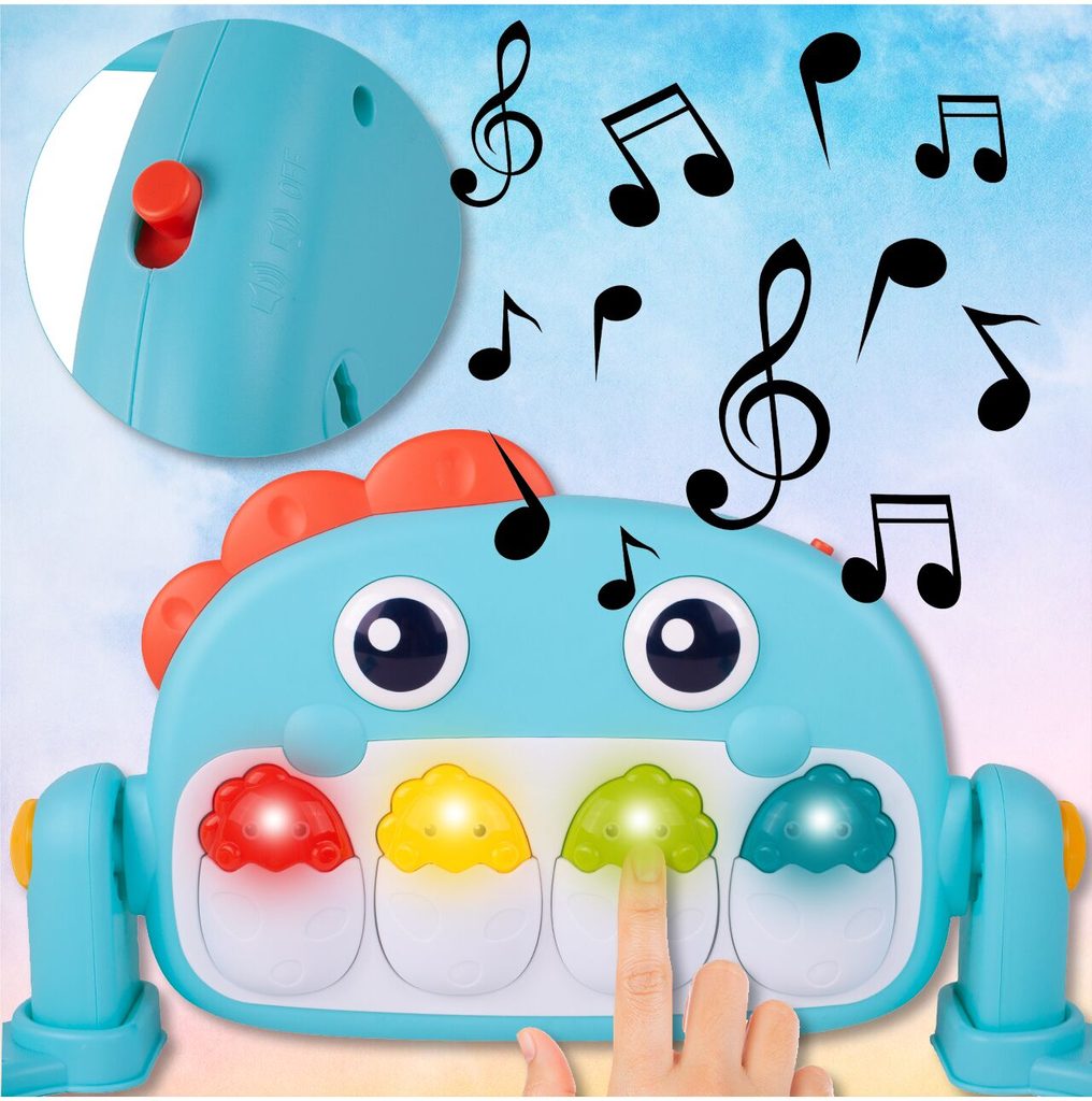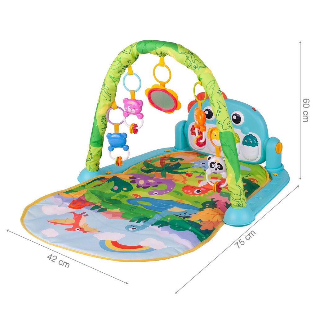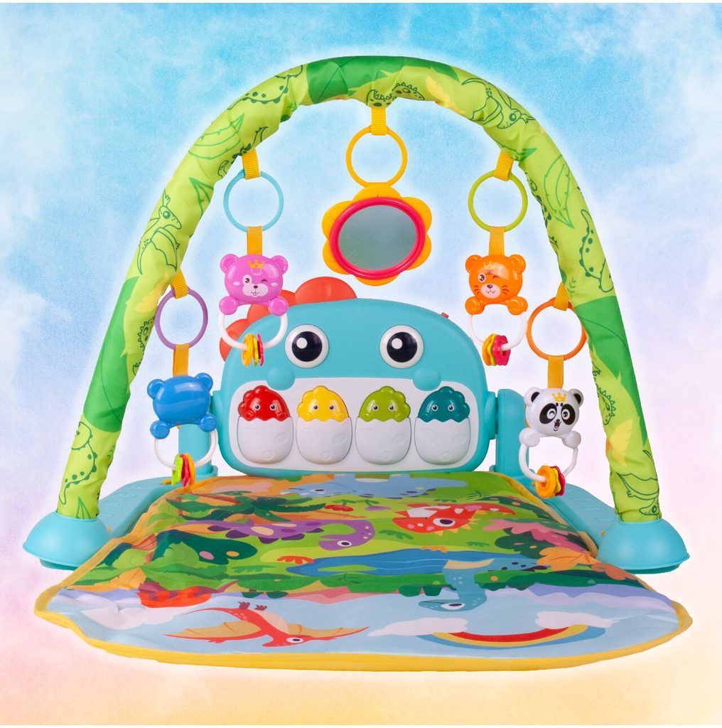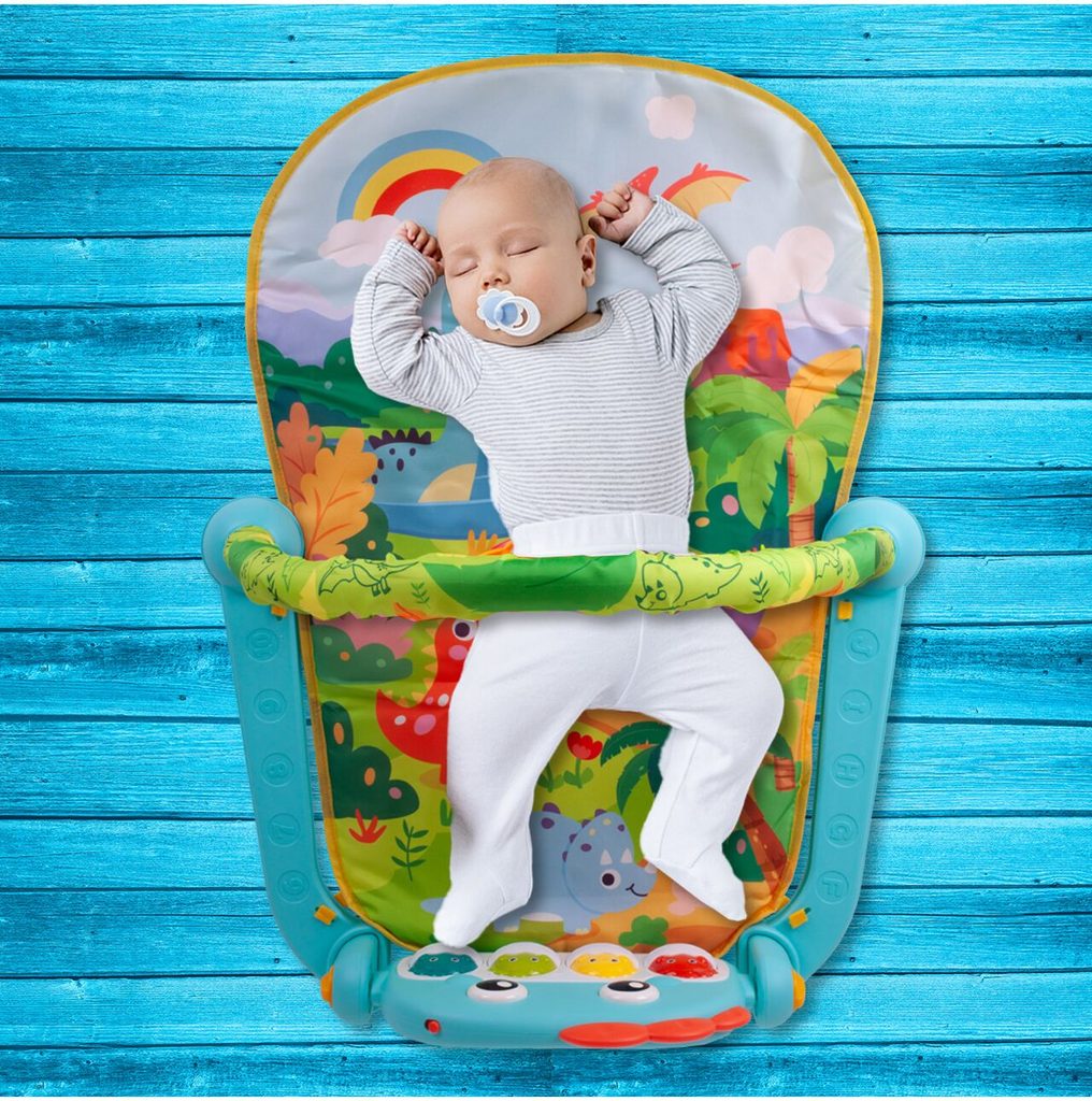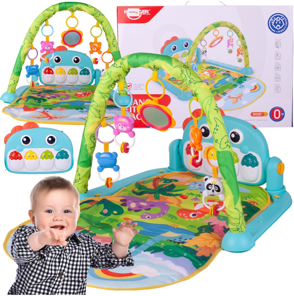 Barevná hrací deka Haunger 3v1 Dino je určena Vašemu dítěti už od narození. Součástí deky je hrazdička se zavěšenými chrastítky a malinkým zrcadlem a také pianko, které svítí a hraje melodie. Dítě si může v leže hrát s chrastítky a sledovat se u toho v zrcátku a pianko může být využito jako uspávací melodie (0-12 měsíců). Na břiše se dítě naučí zvedat hlavičku a pozorovat věci kolem sebe, pomůže mu k prvním krůčkům a zároveň odděluje dítě od chladné podlahy (6-18 měsíců). Pokud již dítě samostatně sedí může hrát na pianko nebo ho využít jako interaktivní stoleček. Zároveň se tím prohlubuje motorika dítěte, rozvíjí se sluch a zrak (6-36 měsíců).