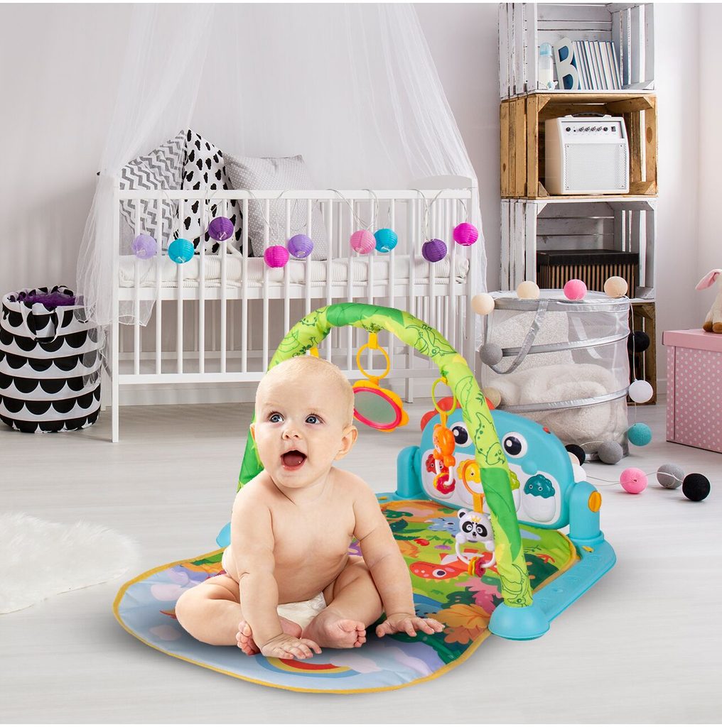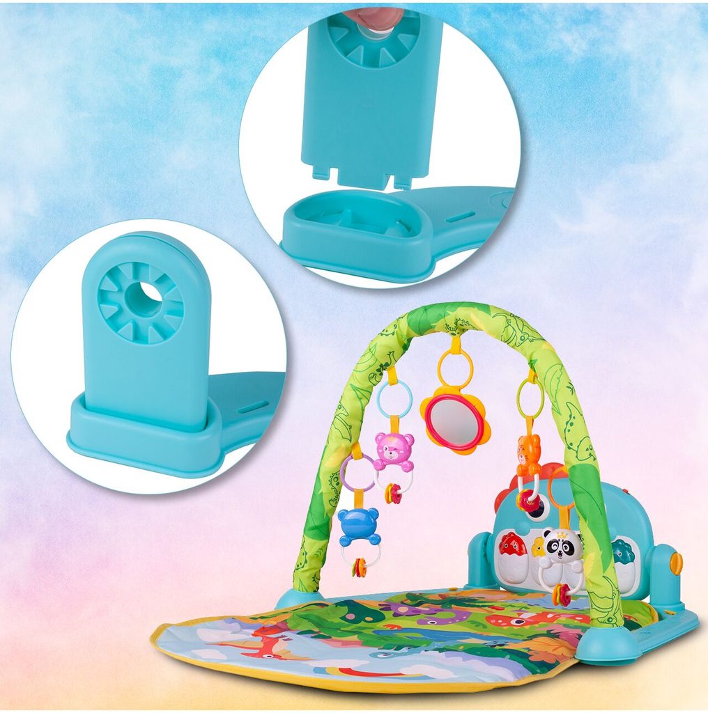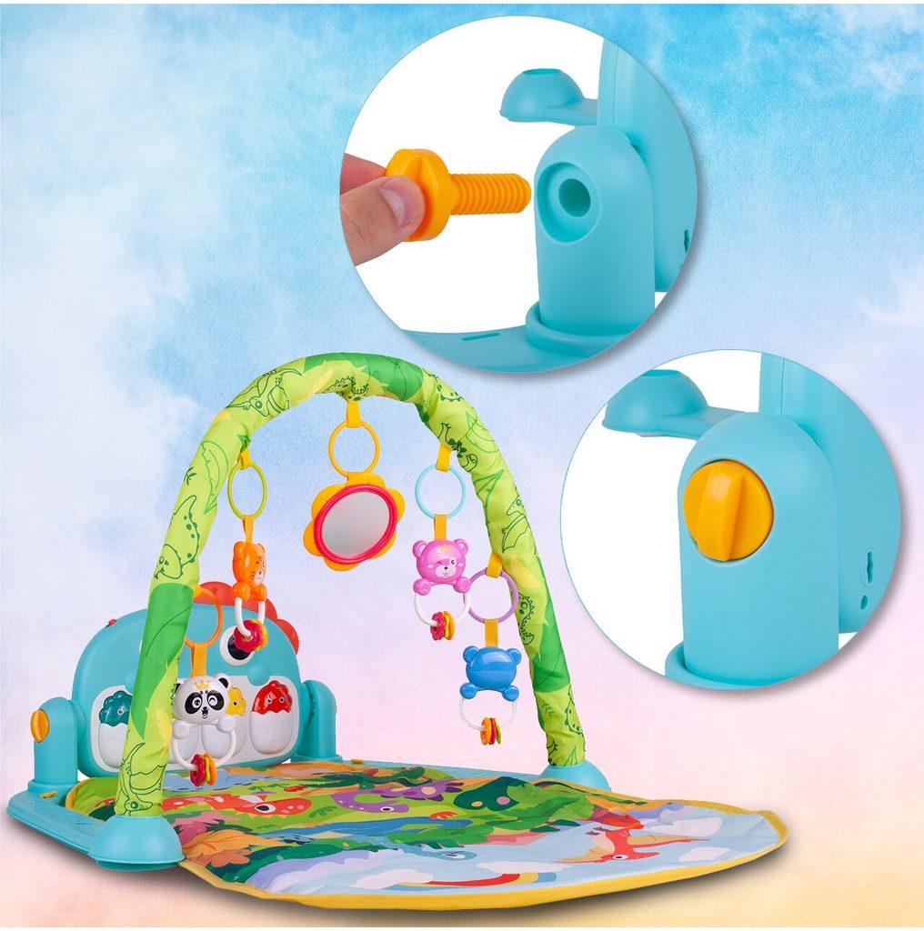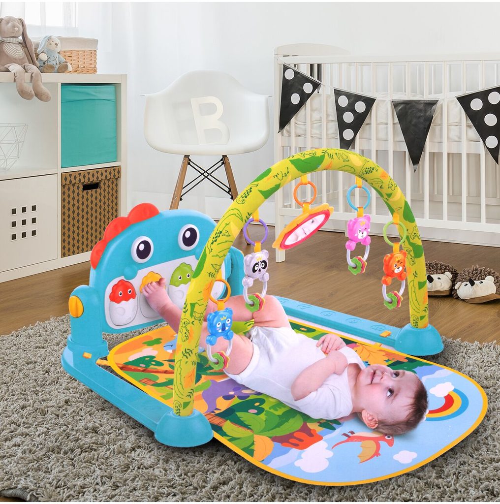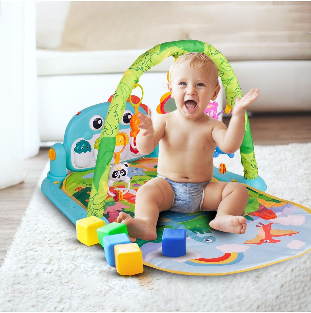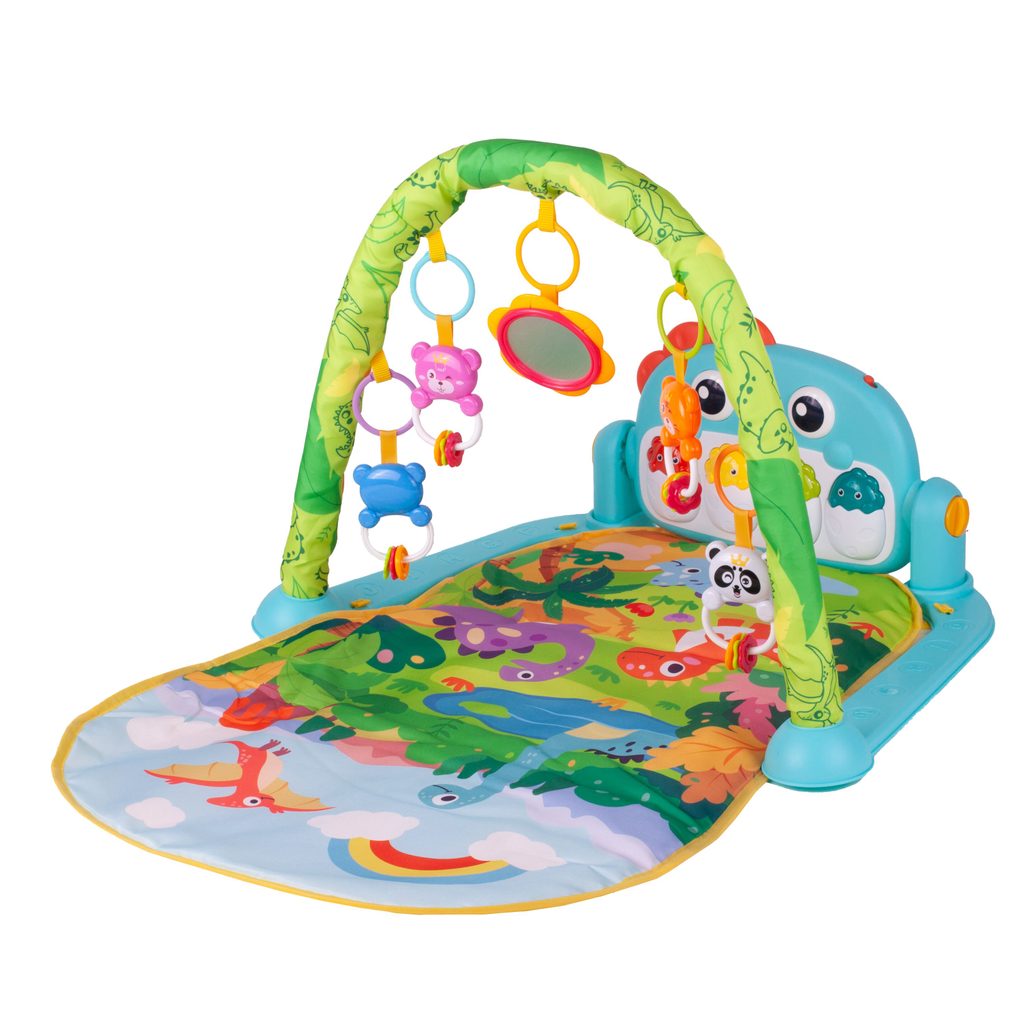 Barevná hrací deka Haunger 3v1 Dino je určena Vašemu dítěti už od narození. Součástí deky je hrazdička se zavěšenými chrastítky a malinkým zrcadlem a také pianko, které svítí a hraje melodie. Dítě si může v leže hrát s chrastítky a sledovat se u toho v zrcátku a pianko může být využito jako uspávací melodie (0-12 měsíců). Na břiše se dítě naučí zvedat hlavičku a pozorovat věci kolem sebe, pomůže mu k prvním krůčkům a zároveň odděluje dítě od chladné podlahy (6-18 měsíců). Pokud již dítě samostatně sedí může hrát na pianko nebo ho využít jako interaktivní stoleček. Zároveň se tím prohlubuje motorika dítěte, rozvíjí se sluch a zrak (6-36 měsíců).