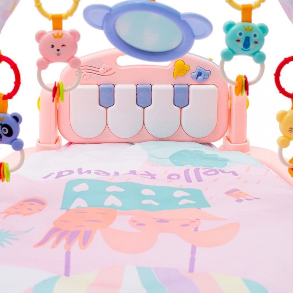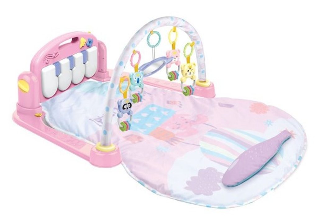 Barevná hrací deka Haunger Fitness Frame je určena Vašemu dítěti už od narození. Součástí deky je hrazdička se zavěšenými chrastítky a malinkým zrcadlem a také pianko, které svítí a hraje melodie. Dítě si může v leže hrát s chrastítky a sledovat se u toho v zrcátku a pianko může být využito jako uspávací melodie (0-12 měsíců). Na břiše se dítě naučí zvedat hlavičku a pozorovat věci kolem sebe, pomůže mu k prvním krůčkům a zároveň odděluje dítě od chladné podlahy (6-18 měsíců). Pokud již dítě samostatně sedí může hrát na pianko nebo ho využít jako interaktivní stoleček. Zároveň se tím prohlubuje motorika dítěte, rozvíjí se sluch a zrak (6-36 měsíců).