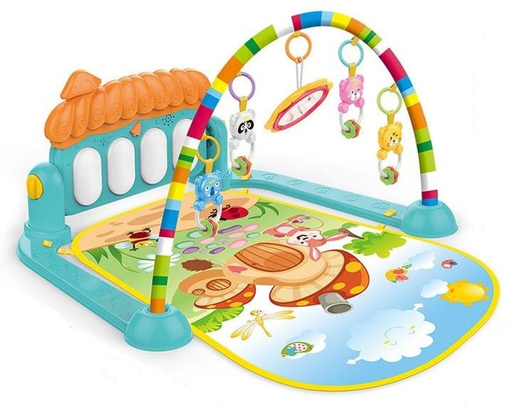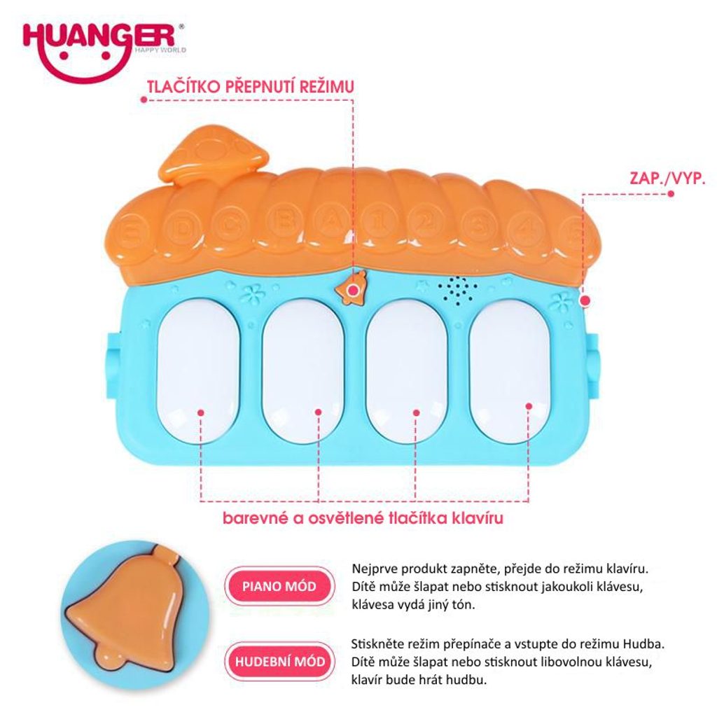 Barevná hrací deka Haunger 3v1 Hříbeček je určena Vašemu dítěti už od narození. Součástí deky je hrazdička se zavěšenými chrastítky a malinkým zrcadlem a také pianko, které svítí a hraje melodie. Dítě si může v leže hrát s chrastítky a sledovat se u toho v zrcátku a pianko může být využito jako uspávací melodie (0-12 měsíců). Na břiše se dítě naučí zvedat hlavičku a pozorovat věci kolem sebe, pomůže mu k prvním krůčkům a zároveň odděluje dítě od chladné podlahy (6-18 měsíců). Pokud již dítě samostatně sedí může hrát na pianko nebo ho využít jako interaktivní stoleček. Zároveň se tím prohlubuje motorika dítěte, rozvíjí se sluch a zrak (6-36 měsíců).