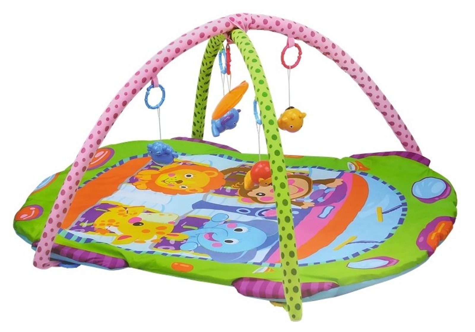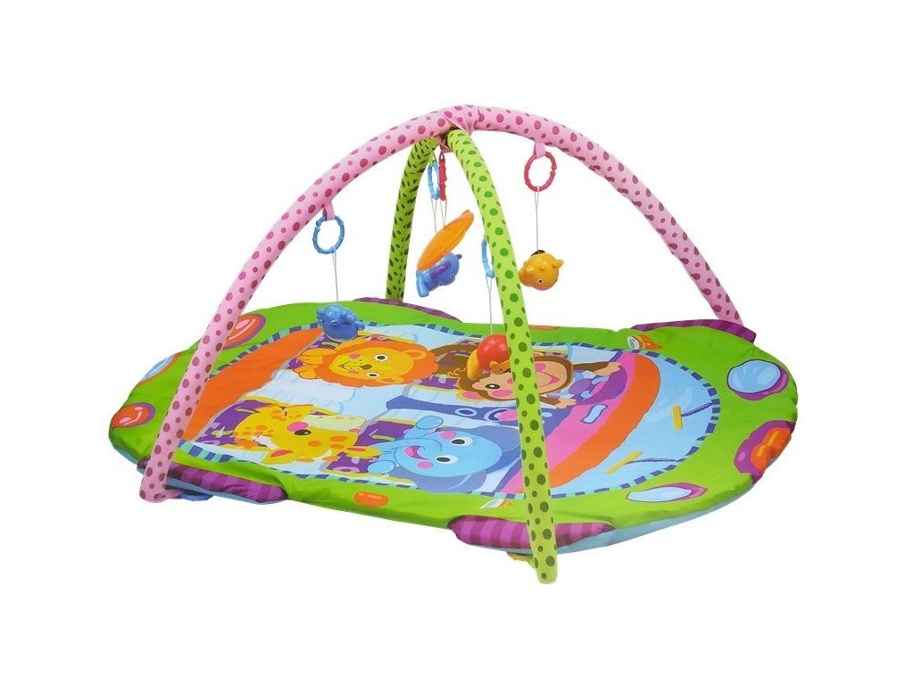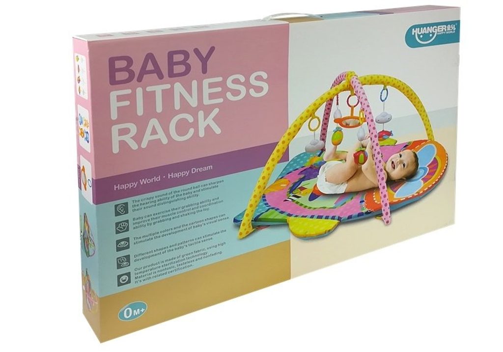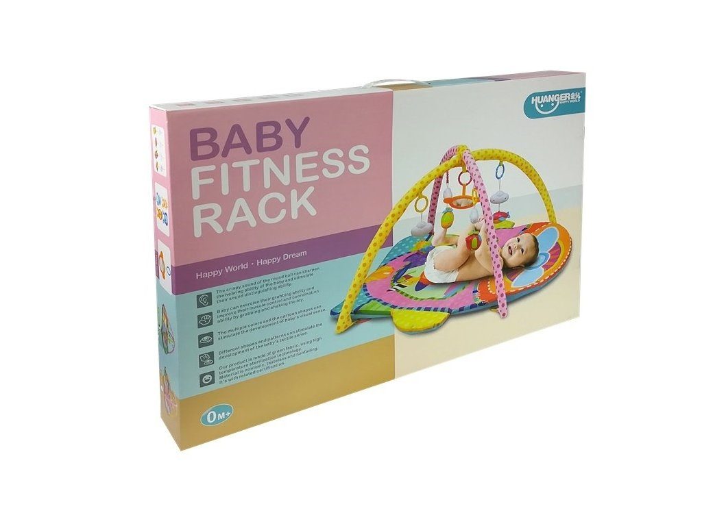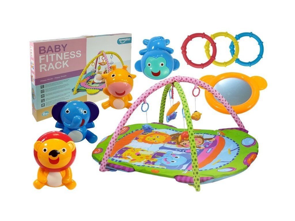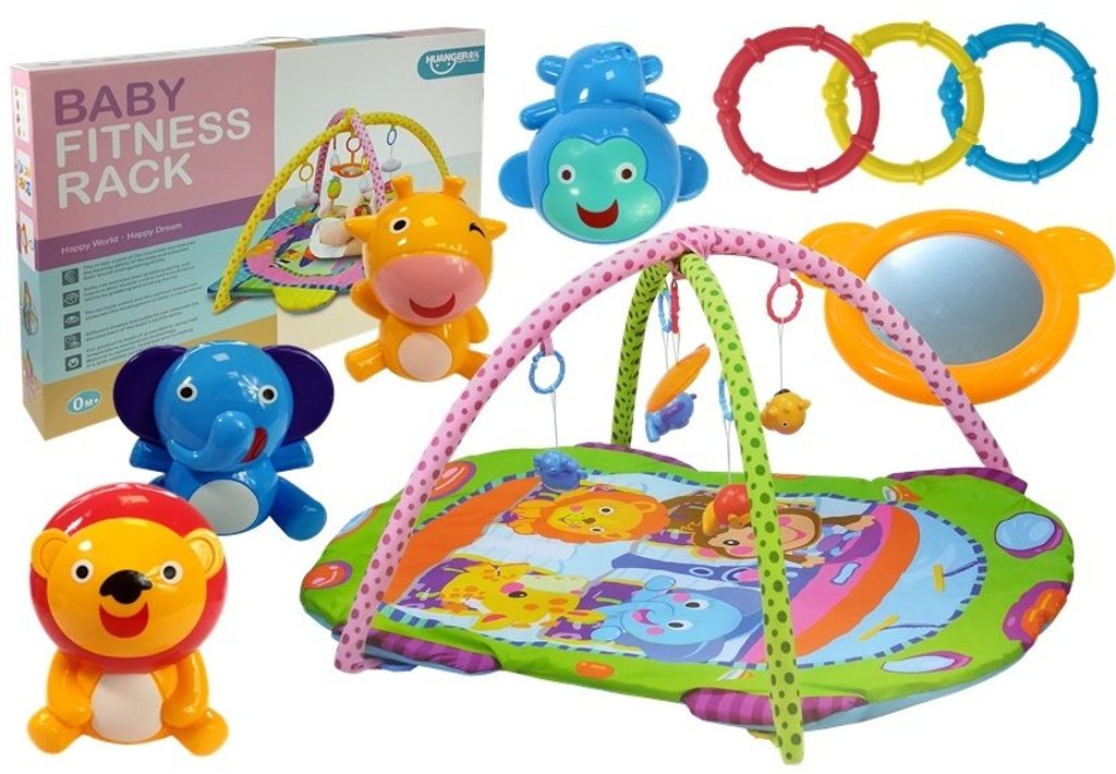 Haunger pestrobarevná hrací deka Fitness Rack je určena Vašemu dítěti už od narození. Součástí deky jsou dvě hrazdičky se zavěšenými hračkami a bezpečným zrcátkem pro sebepozorování. Hračky jsou ve tvaru zvířátek a to lvíčka, opičky, slona a žirafy. Lze je odejmout a dítě si s nimi může hrát samostatně. Deka je vyrobena ze stálobarevného materiálu a jsou na ní vyobrazeny obrázky zvířátek stejné jako připojené hračky.