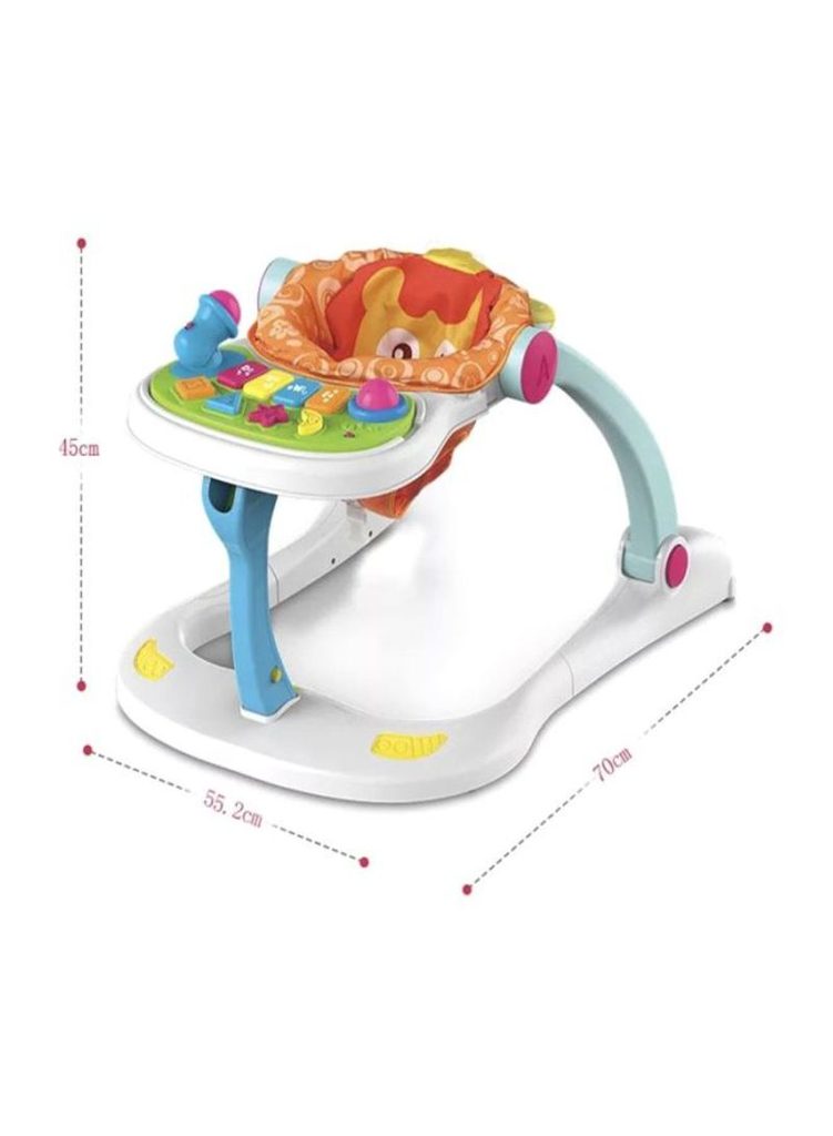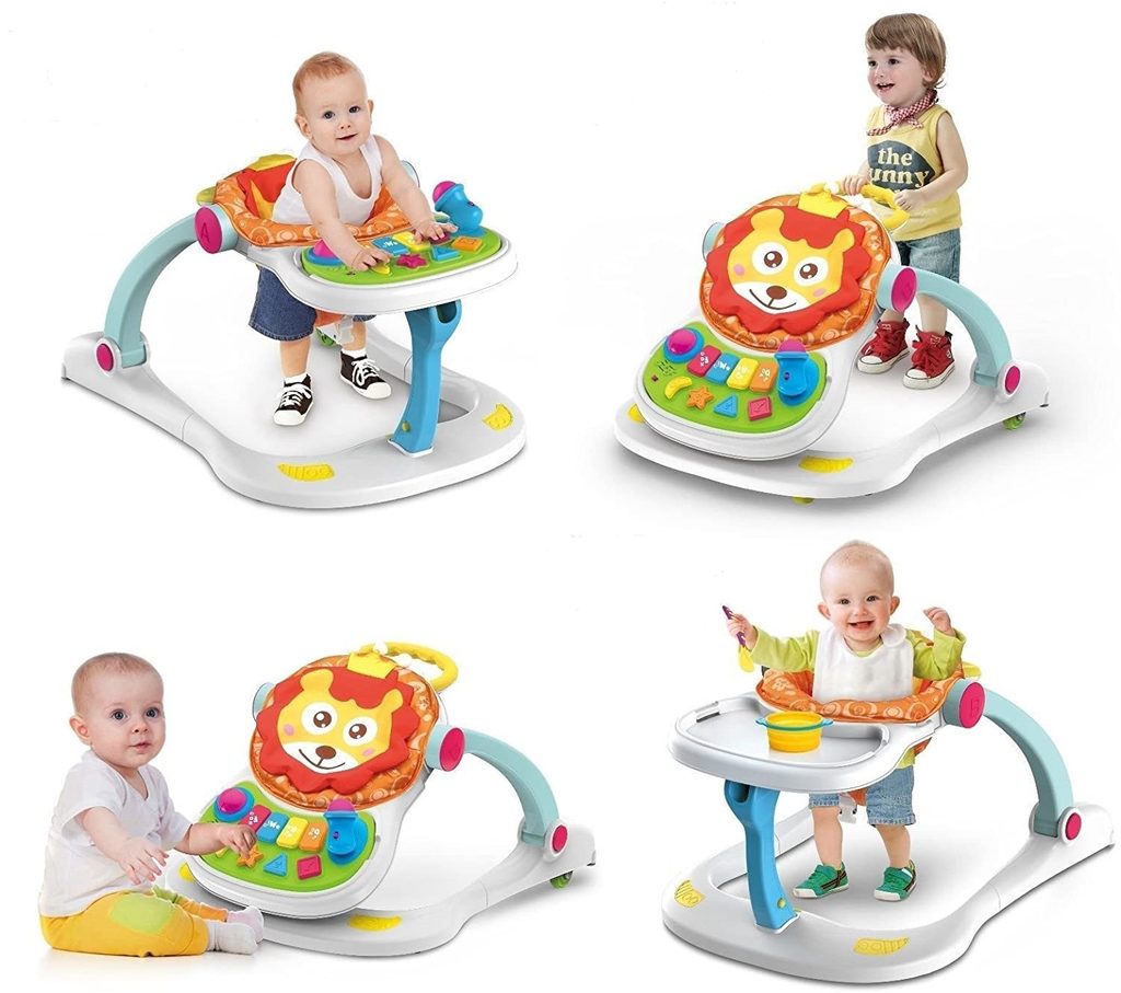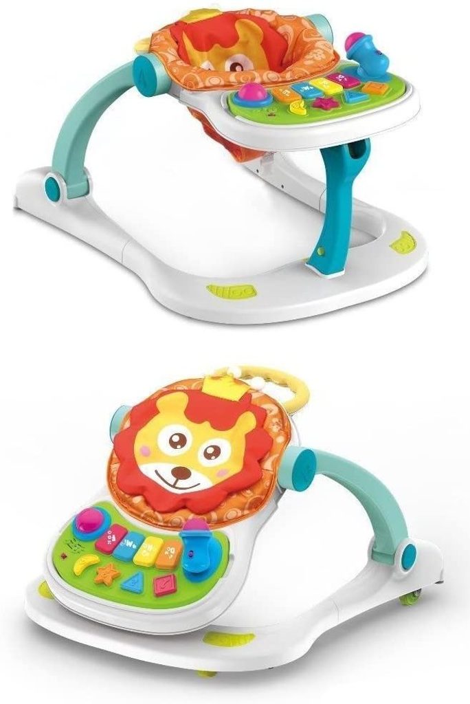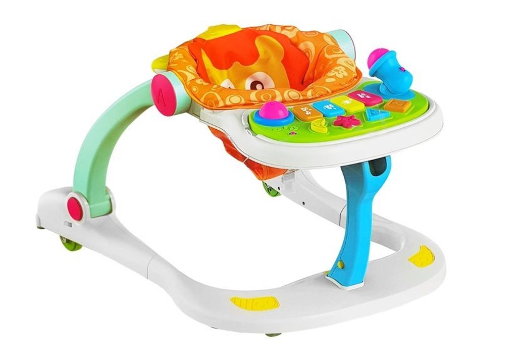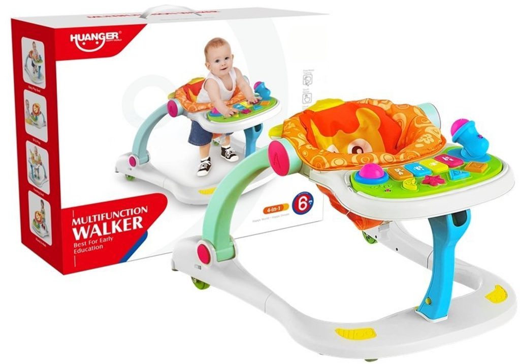 Dětské multifunkční chodítko 4v1 Haunger Lion Walker pro ty nejmenši děti, edukační centrum. Chodítko lze využít celkem 4 způsoby dle věku dítěte a to jako samostatné chodítko, jídelní židličku se stolečkem, hrací stoleček se židličkou nebo hrací stoleček kdy dítě sedí na zemi. Je vybaveno odnímatelným multifunkčním panelem se zvukovými a světelnými efekty. Zadní kolečko má blokaci. Určeno pro děti od 6 měsíců věku.