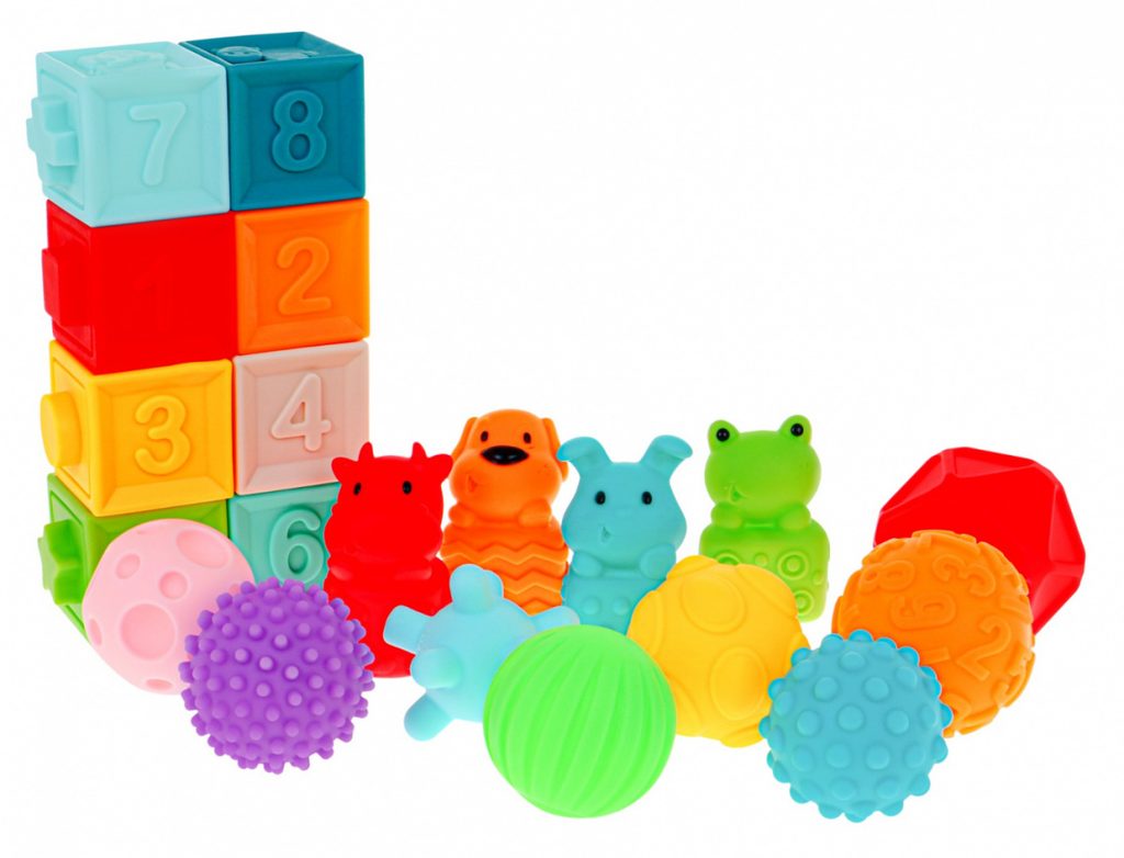 Haunger sada měkkých senzorických hraček Blocks Balls je určena pro ty nejmenší děti. Stimuluje u nich představivost, mysl, zrak a sluch. Zmáčknutím hračky se ozve zvuk a navíc tímto dítě posiluje ruce. V sadě najdete celkem 20 kusů. 8 míčků, 8 kostek a 4 zvířátka v různých barvách, tvarech a velikostech vyrobených ze zcela bezpečného materiálu. Hračka je určena pro děti od 6 měsíců věku.