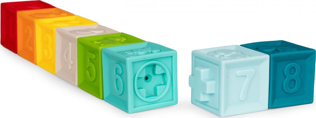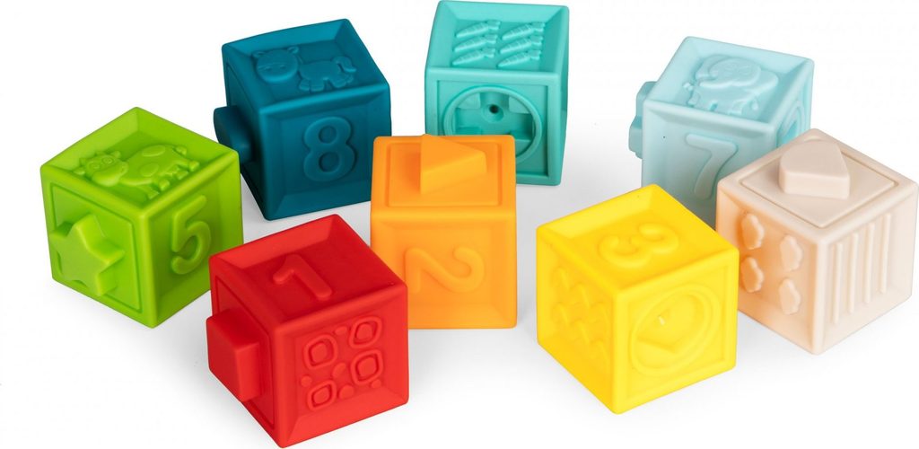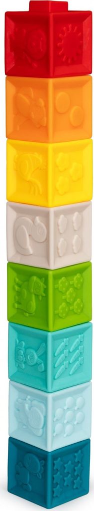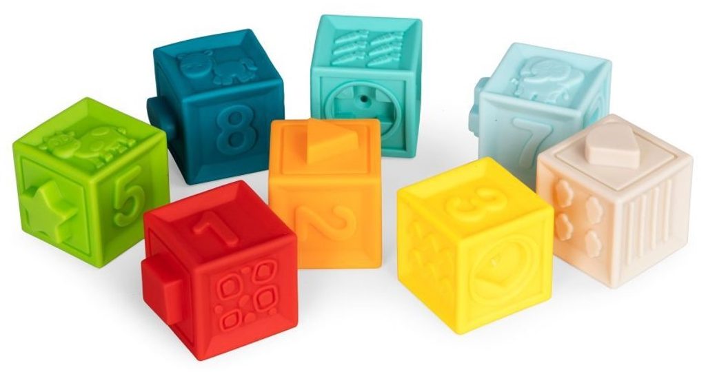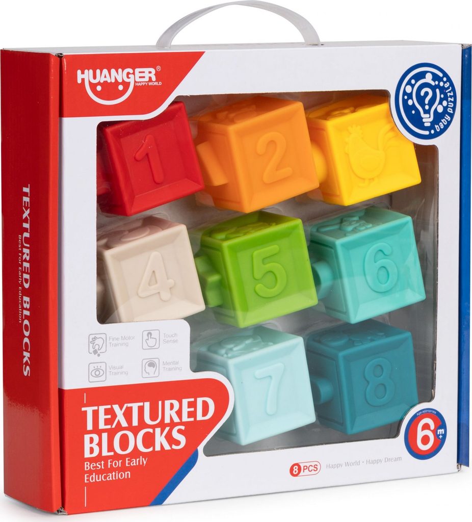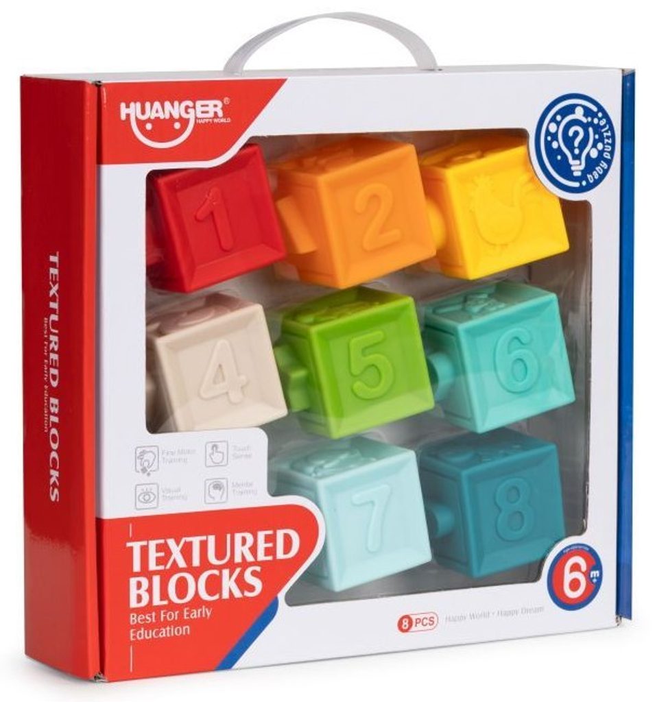 Haunger sada měkkých senzorických kostek Textured Blocks je určena pro ty nejmenší děti. Stimuluje u nich představivost, mysl, zrak a sluch. Zmáčknutím se ozve zvuk a navíc tímto dítě posiluje ruce. V sadě najdete celkem 8 kostek míčků v různých barvách s vyobrazením číslic, zvířátek a tvarů vyrobených ze zcela bezpečného materiálu. Hračka je určena pro děti od 6 měsíců věku.
