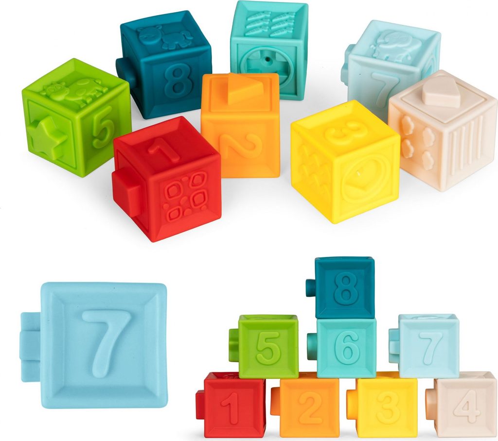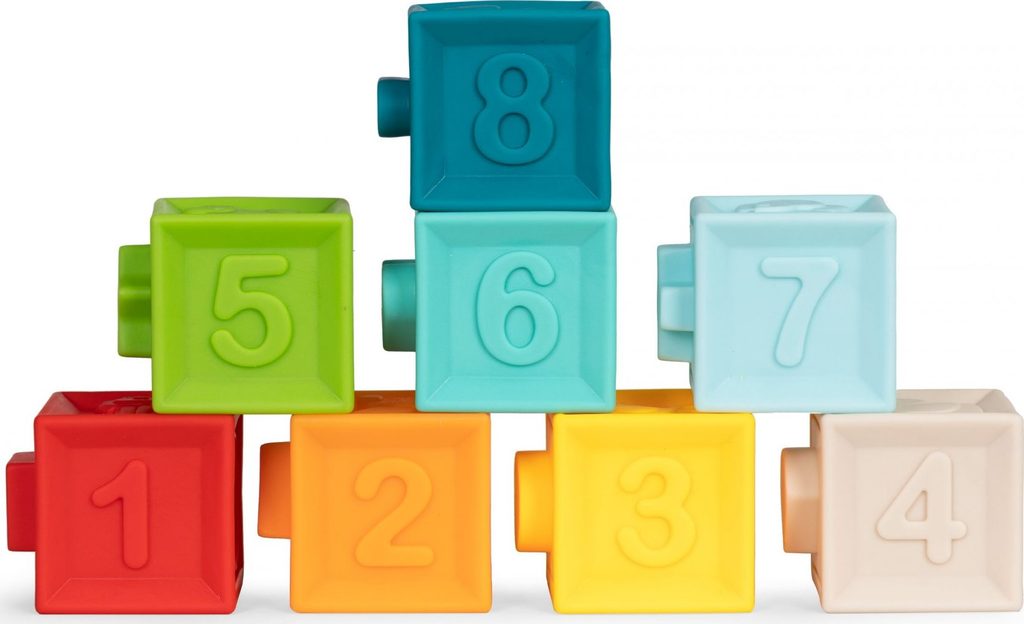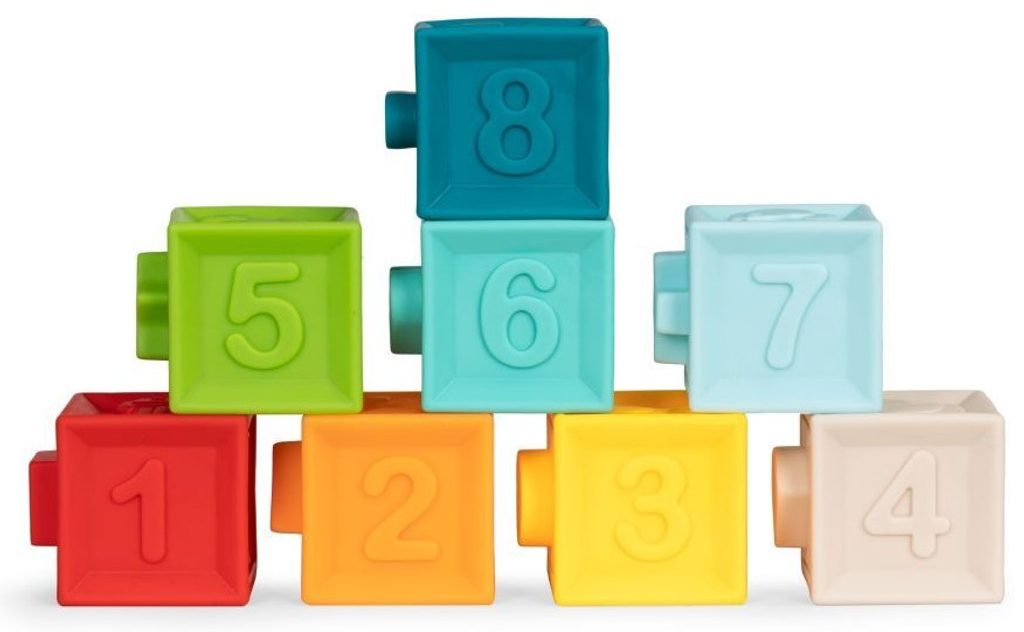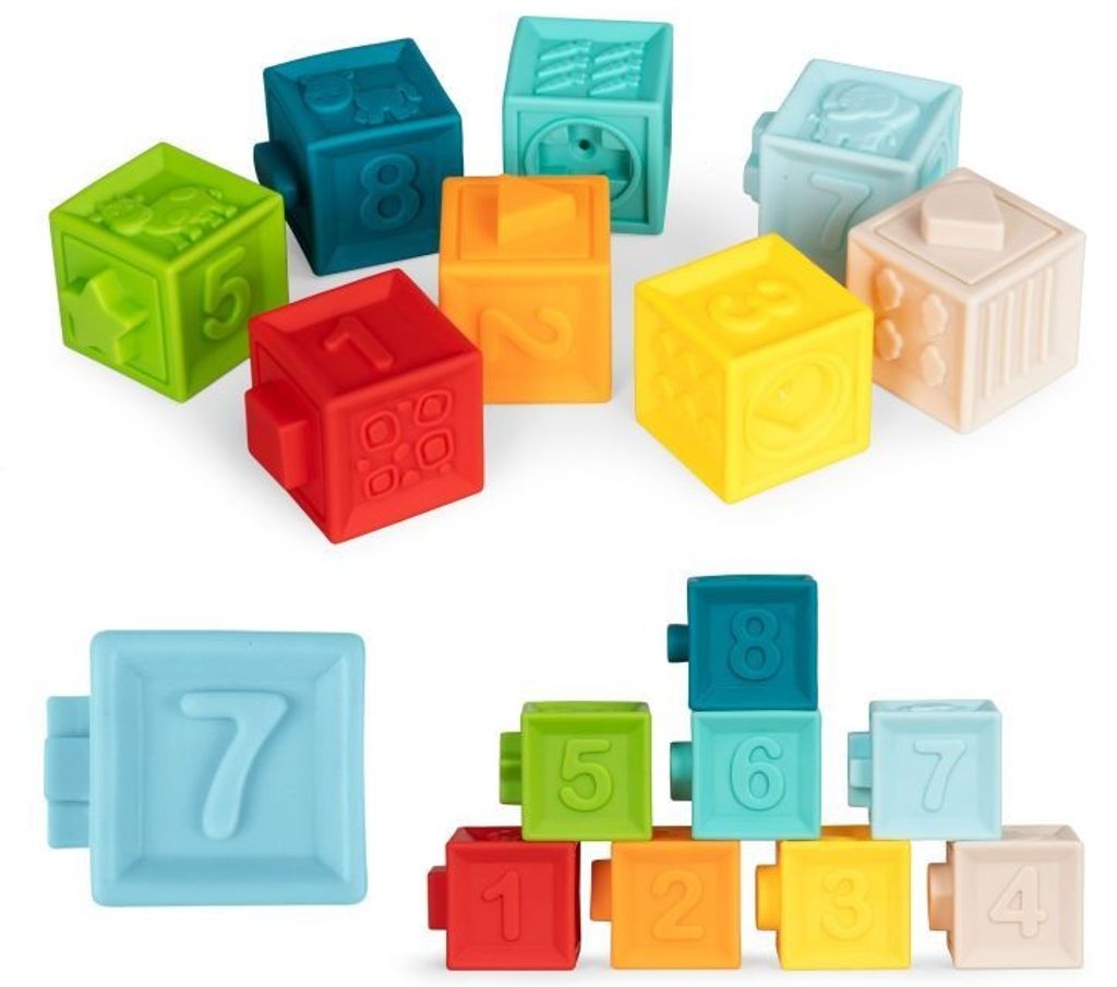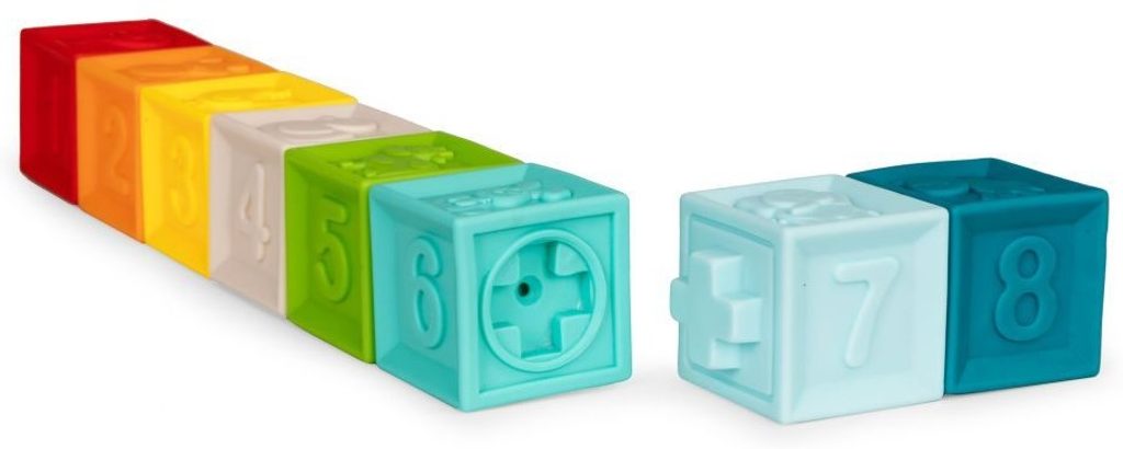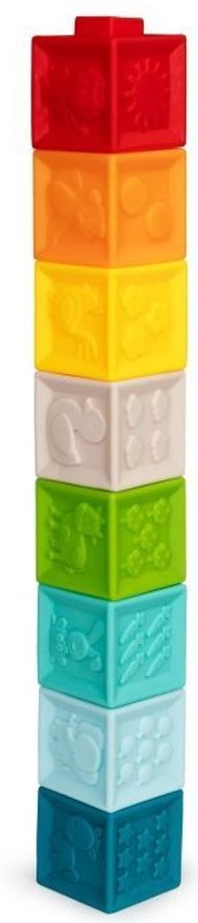 Haunger sada měkkých senzorických kostek Textured Blocks je určena pro ty nejmenší děti. Stimuluje u nich představivost, mysl, zrak a sluch. Zmáčknutím se ozve zvuk a navíc tímto dítě posiluje ruce. V sadě najdete celkem 8 kostek míčků v různých barvách s vyobrazením číslic, zvířátek a tvarů vyrobených ze zcela bezpečného materiálu. Hračka je určena pro děti od 6 měsíců věku.