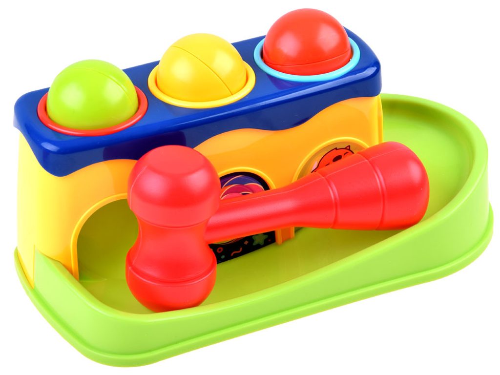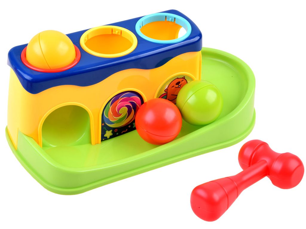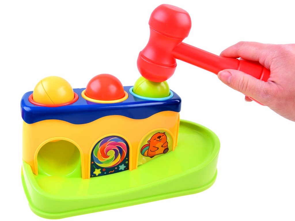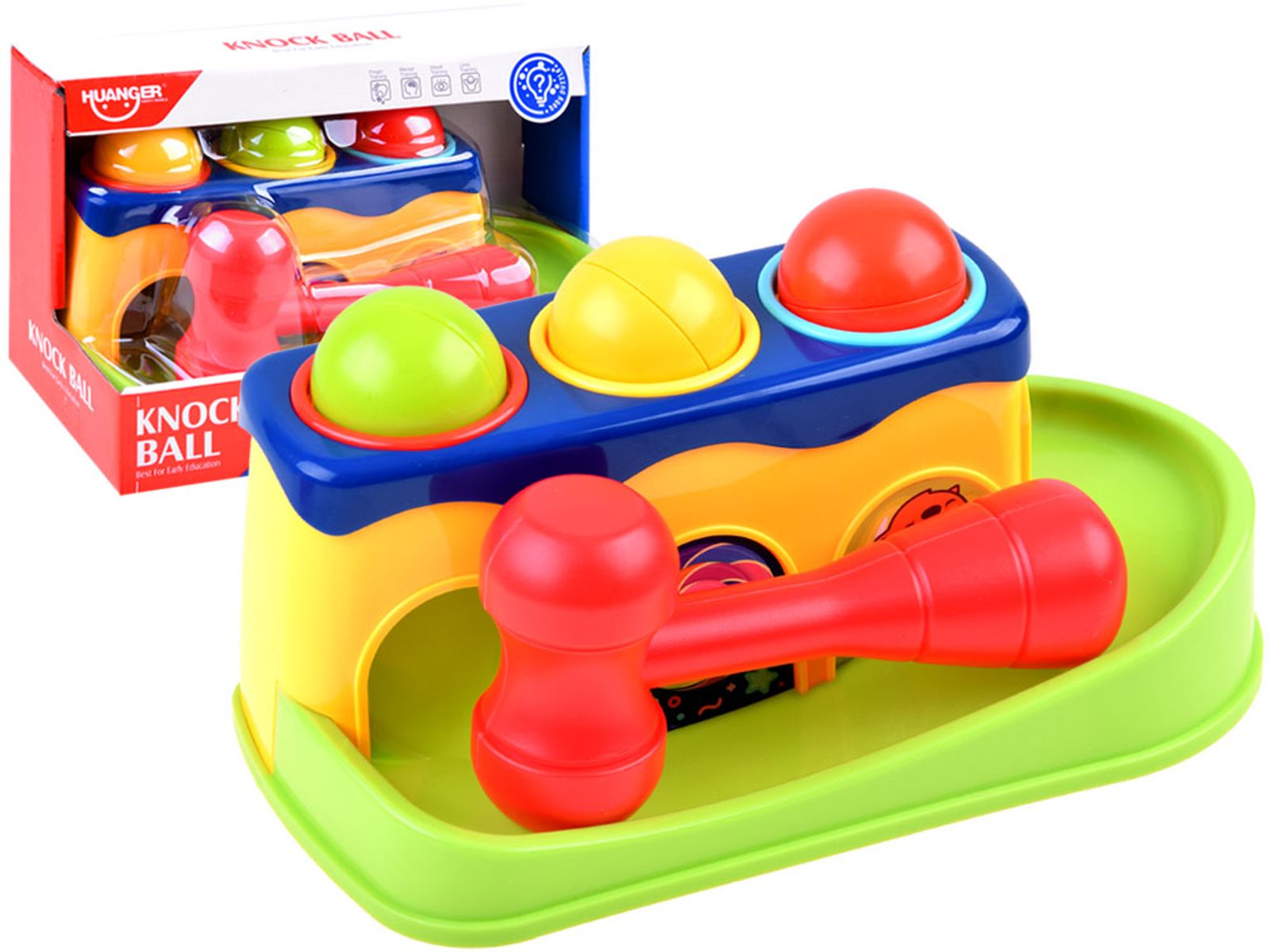 Haunger zatloukání míčků Knock Ball je určena pro ty nejmenší děti. Stimuluje u nich hmat, koordinaci, představivost a učí je rozpoznávat barvy. Pomocí přiloženého kladívko se míčky vtloukají do horních otvorů a po úspěšném zatlučení míčky sjedou po dráze dolů. Hračka je určena pro děti od 12 měsíců věku.