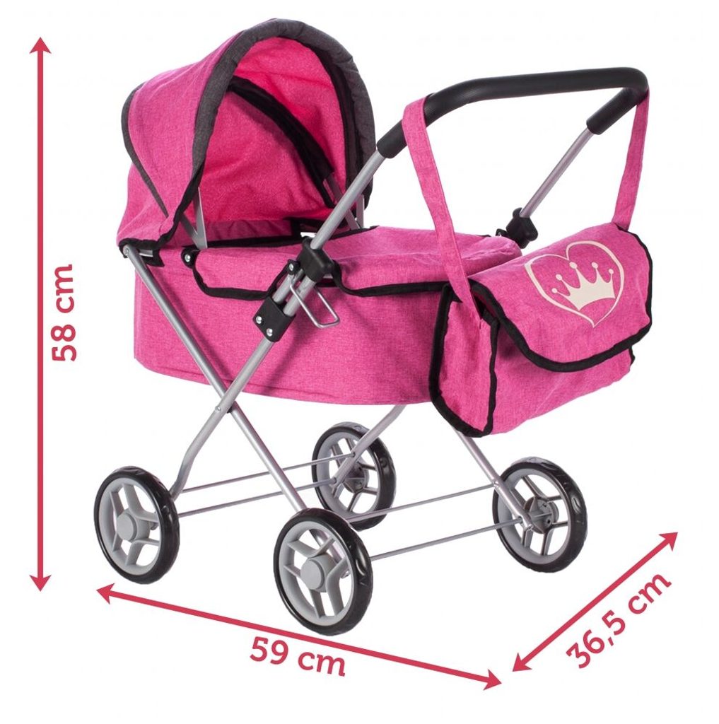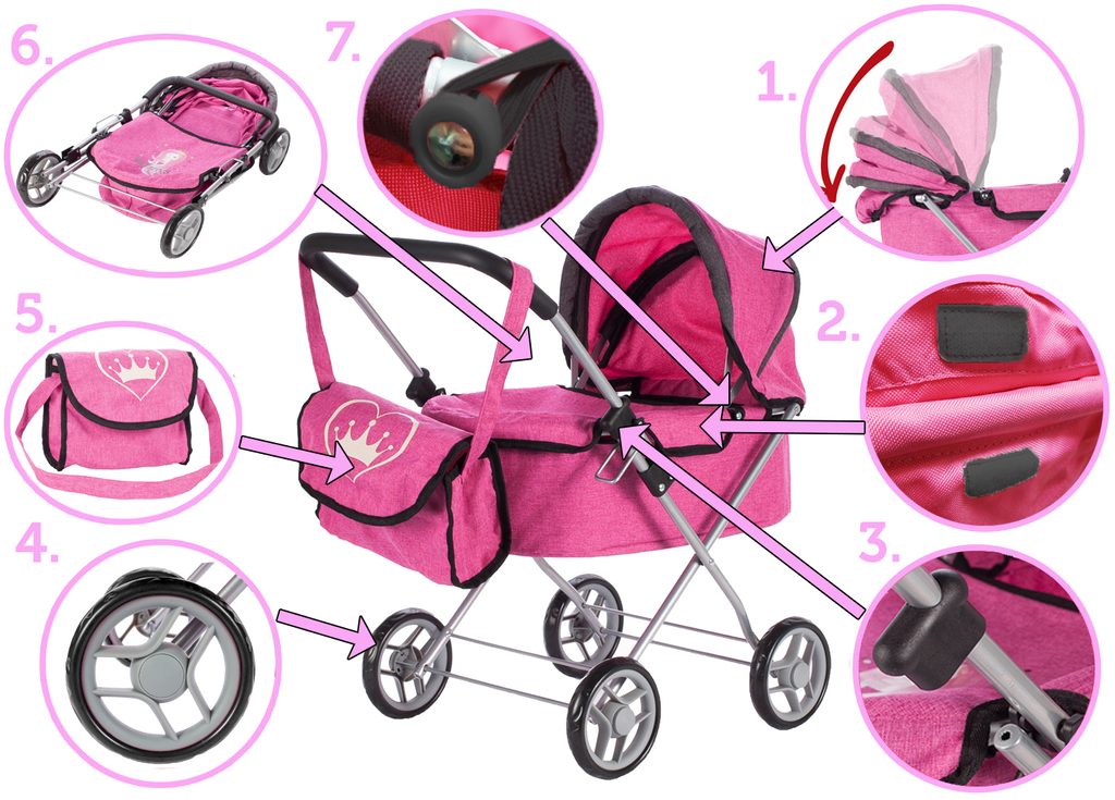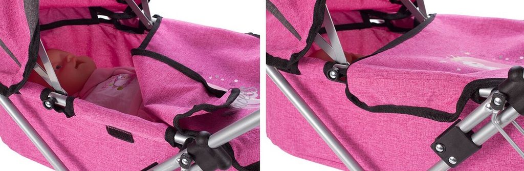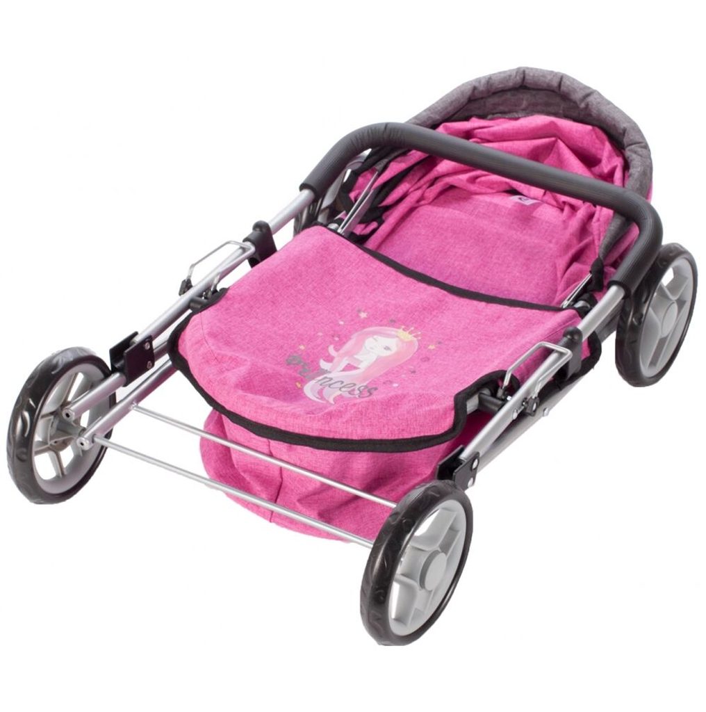 Hluboký kočárek pro panenky Princess má velmi lehkou stabilní konstrukci vyrobenou z hliníkových trubek. Na korbě je umístěna pokrývka s obrázkem princezny. Rukojeť kočárku je měkká, obalená pěnou. Před automatickým složením chrání dítě blokace. Pěnová kola s disky nezanechávají šmouhy na podlaze. Kočárek je určen pro holčičky od 3 let.