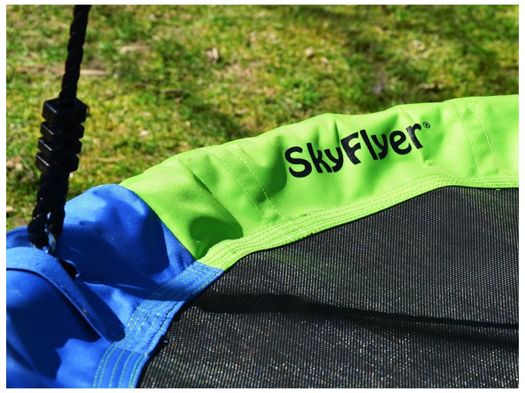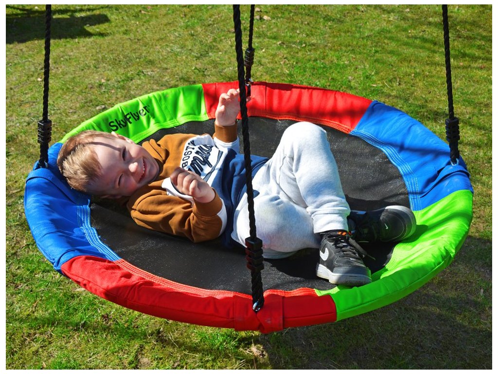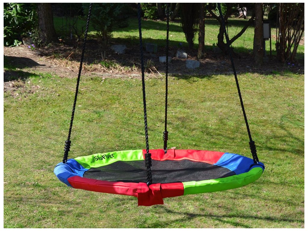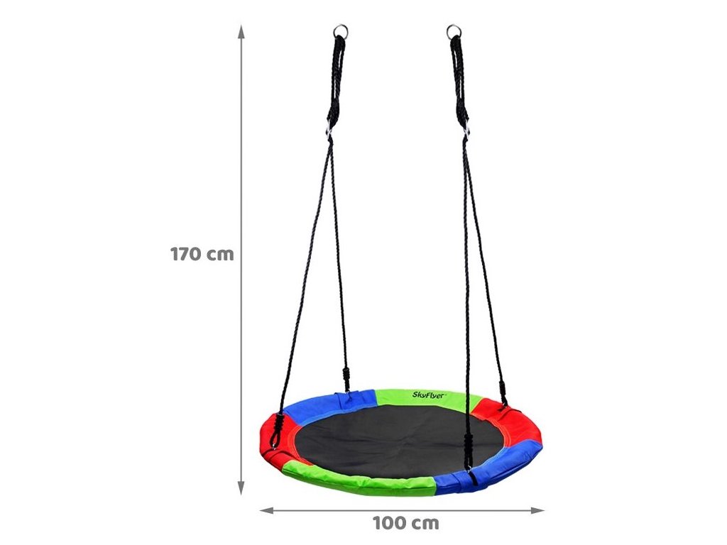 SkyFlyer dětská houpačka Čapí hnízdo je určena pro děti od 3 let věku. Je opatřena širokým sedadlem o průměru 100 cm vyrobeného z odolného pestrobarevného polyesteru. Závěsy jsou nastavitelné až do délky 170 cm a ukotvují se pomocí kovových šroubů. Velmi snadná montáž.