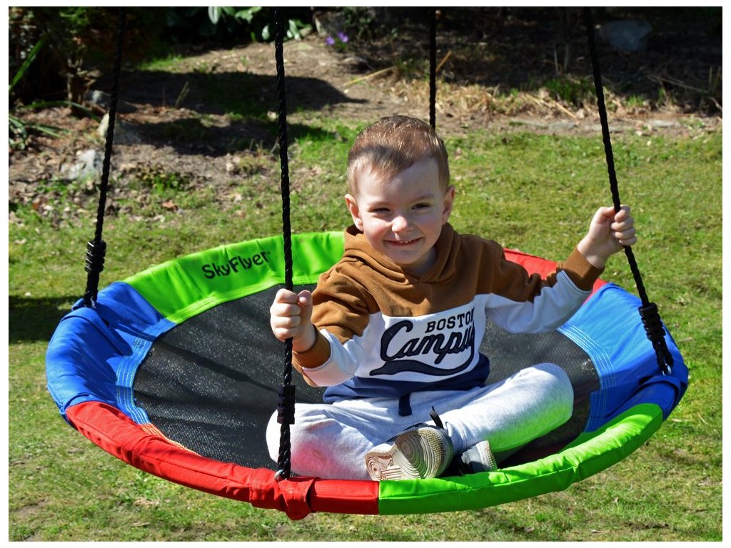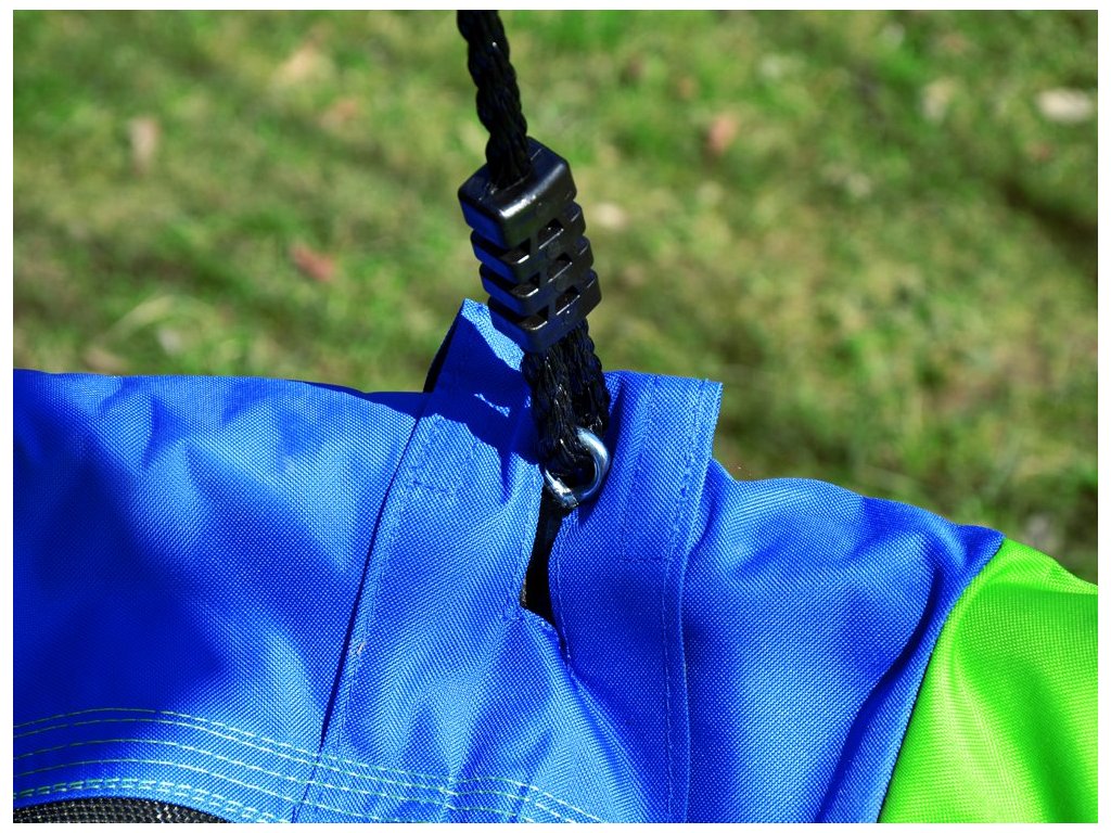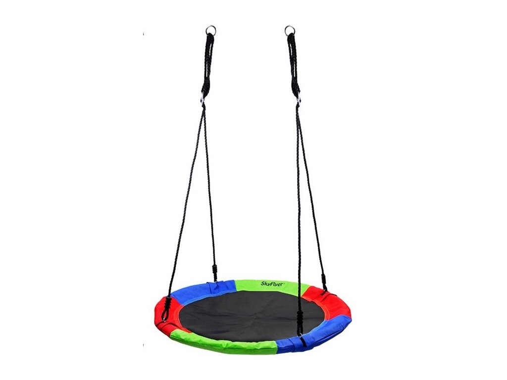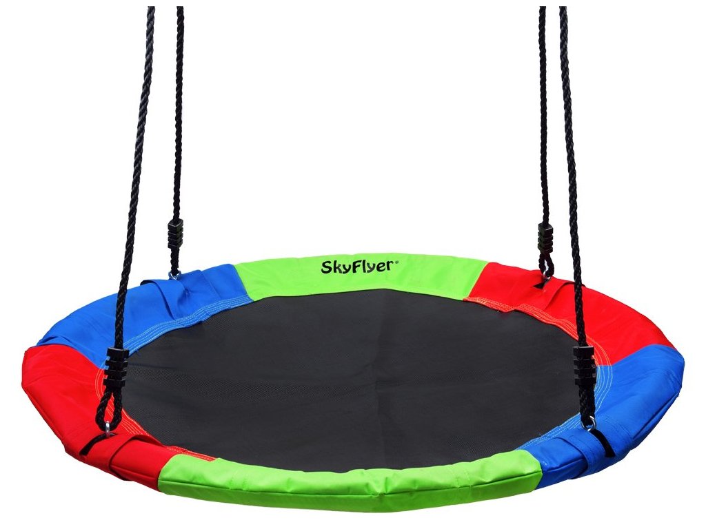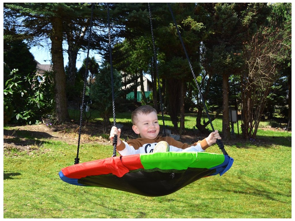 SkyFlyer dětská houpačka Čapí hnízdo je určena pro děti od 3 let věku. Je opatřena širokým sedadlem o průměru 100 cm vyrobeného z odolného pestrobarevného polyesteru. Závěsy jsou nastavitelné až do délky 170 cm a ukotvují se pomocí kovových šroubů. Velmi snadná montáž.