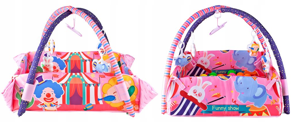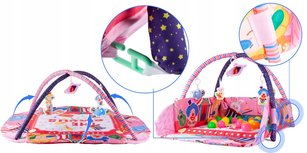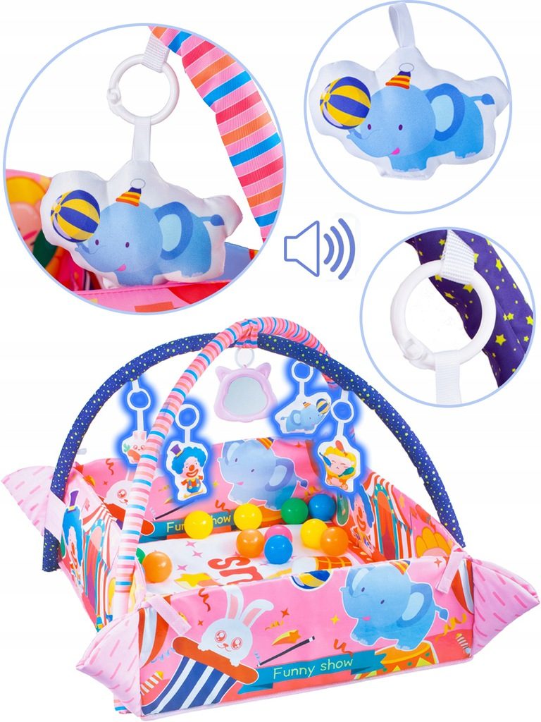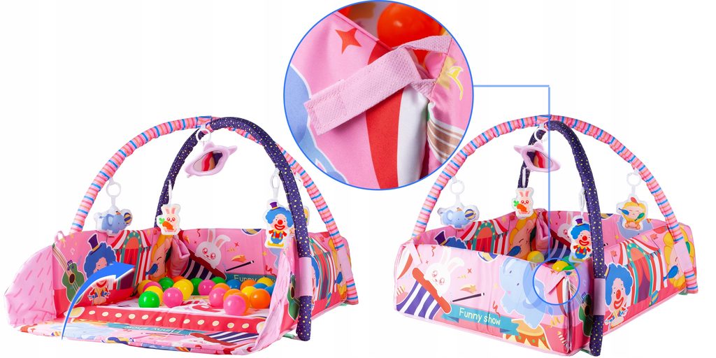 Barevná hrací deka Game Carpet se 30 míčky je určena Vašemu dítěti už od narození. Součástí deky jsou dvě hrazdičky se zavěšenými hračkami s pískátky uvnitř. Pomocí bočních stěn deky lze vytvořit ohrádka. Dítě si hrát několika způsoby dle toho jak rychle roste a má chuť si hrát. V první fázi života si dítě hraje na zádech a může pozorovat zavěšené hračky, které vzbuzují jeho zvědavost. Pro dítě, které již zvládne větší pohyby lze boční  stěny jednoduše zvednout a vytvořit tak bezpečnou ohrádku pro hraní. Lze využít samostatnou deku, samostatnou ohrádku nebo zkombinovat za pomoci hrazdiček. Hračky lze odejmout a dítě si s nimi může hrát samostatně. Deka je vyrobena ze stálobarevného materiálu.