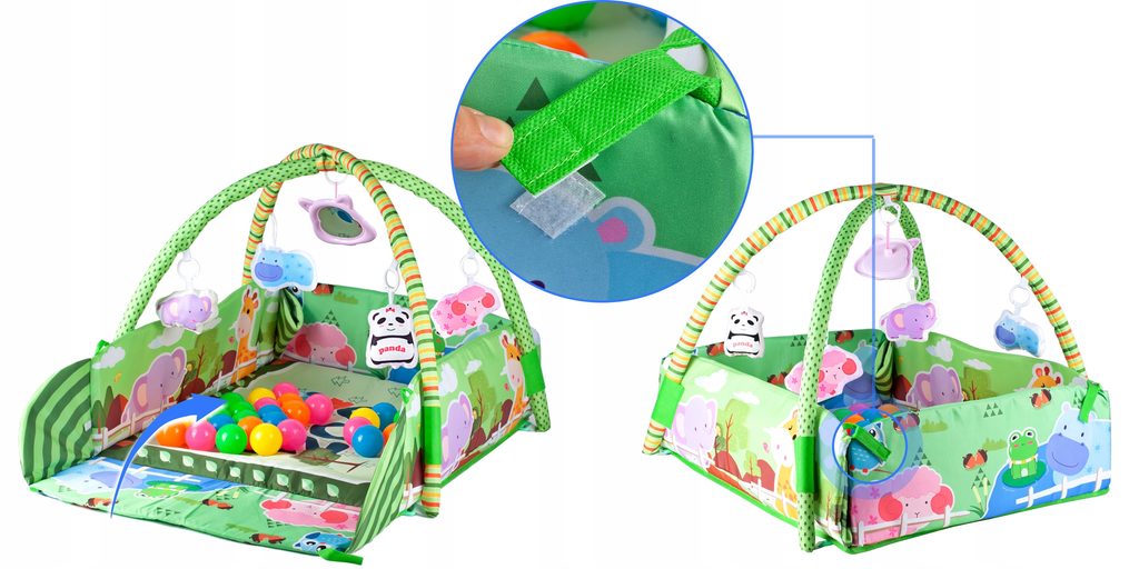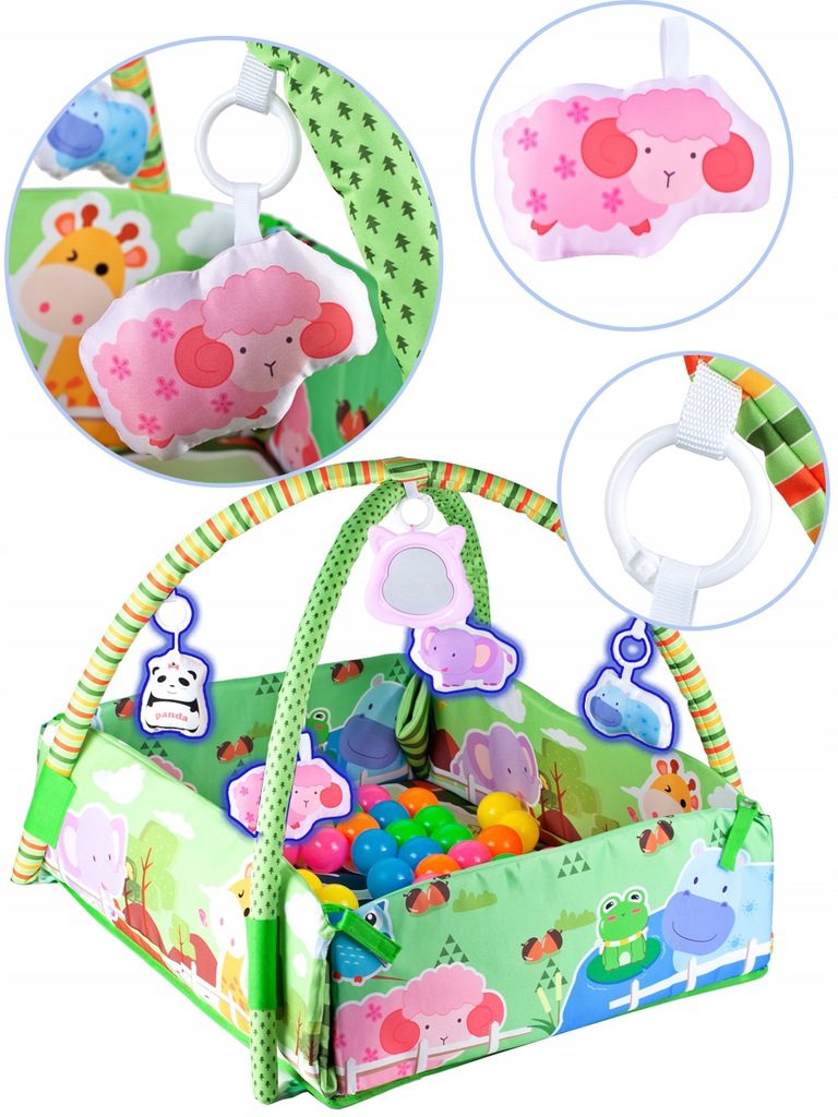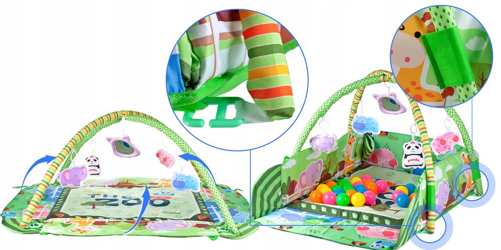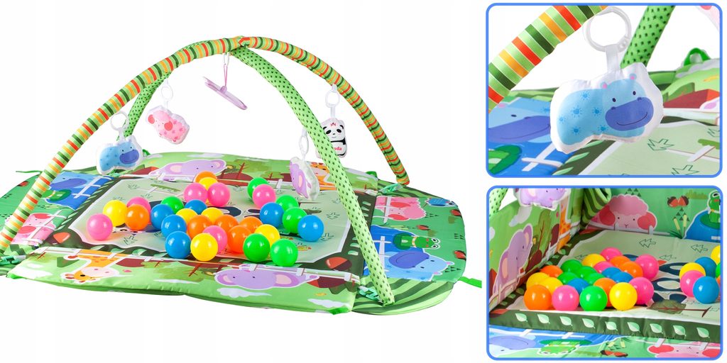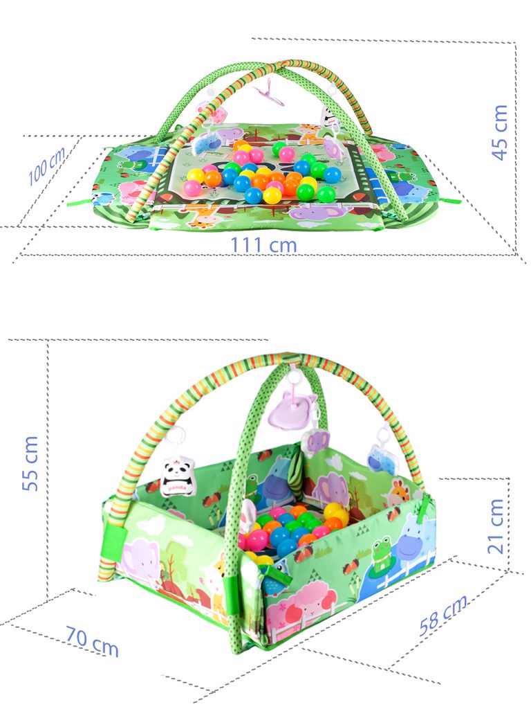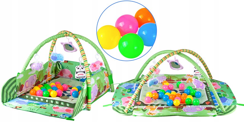 Barevná hrací deka Game Carpet se 30 míčky je určena Vašemu dítěti už od narození. Součástí deky jsou dvě hrazdičky se zavěšenými hračkami s pískátky uvnitř. Pomocí bočních stěn deky lze vytvořit ohrádka. Dítě si hrát několika způsoby dle toho jak rychle roste a má chuť si hrát. V první fázi života si dítě hraje na zádech a může pozorovat zavěšené hračky, které vzbuzují jeho zvědavost. Pro dítě, které již zvládne větší pohyby lze boční stěny jednoduše zvednout a vytvořit tak bezpečnou ohrádku pro hraní. Lze využít samostatnou deku, samostatnou ohrádku nebo zkombinovat za pomoci hrazdiček. Hračky lze odejmout a dítě si s nimi může hrát samostatně. Deka je vyrobena ze stálobarevného materiálu.
