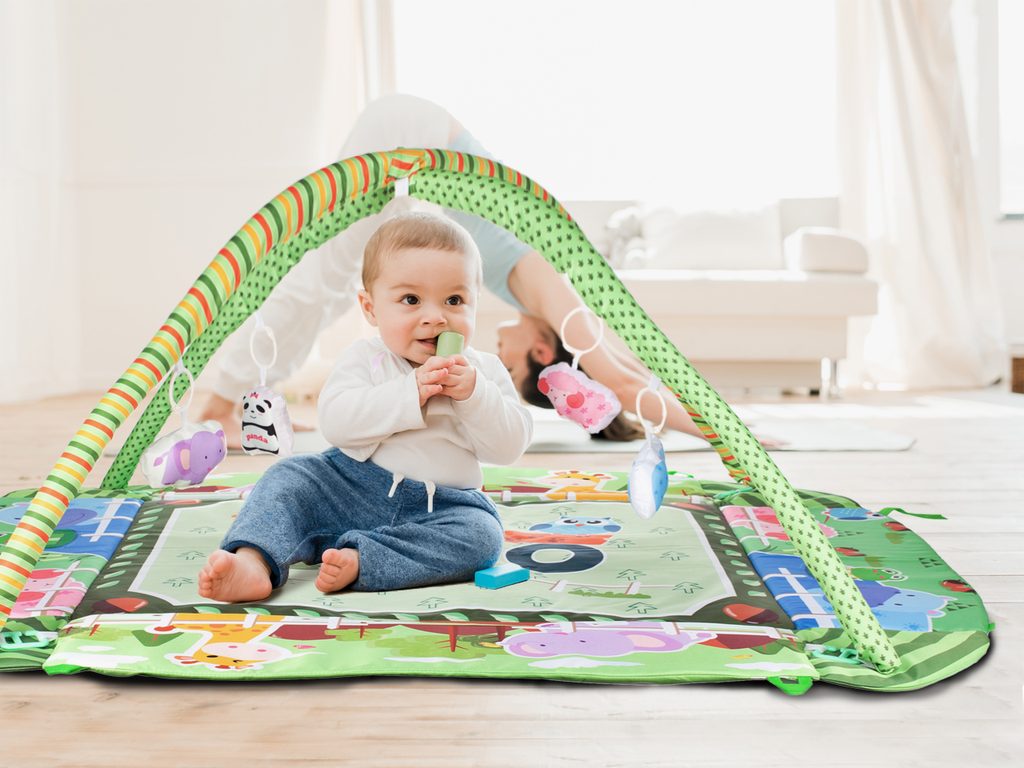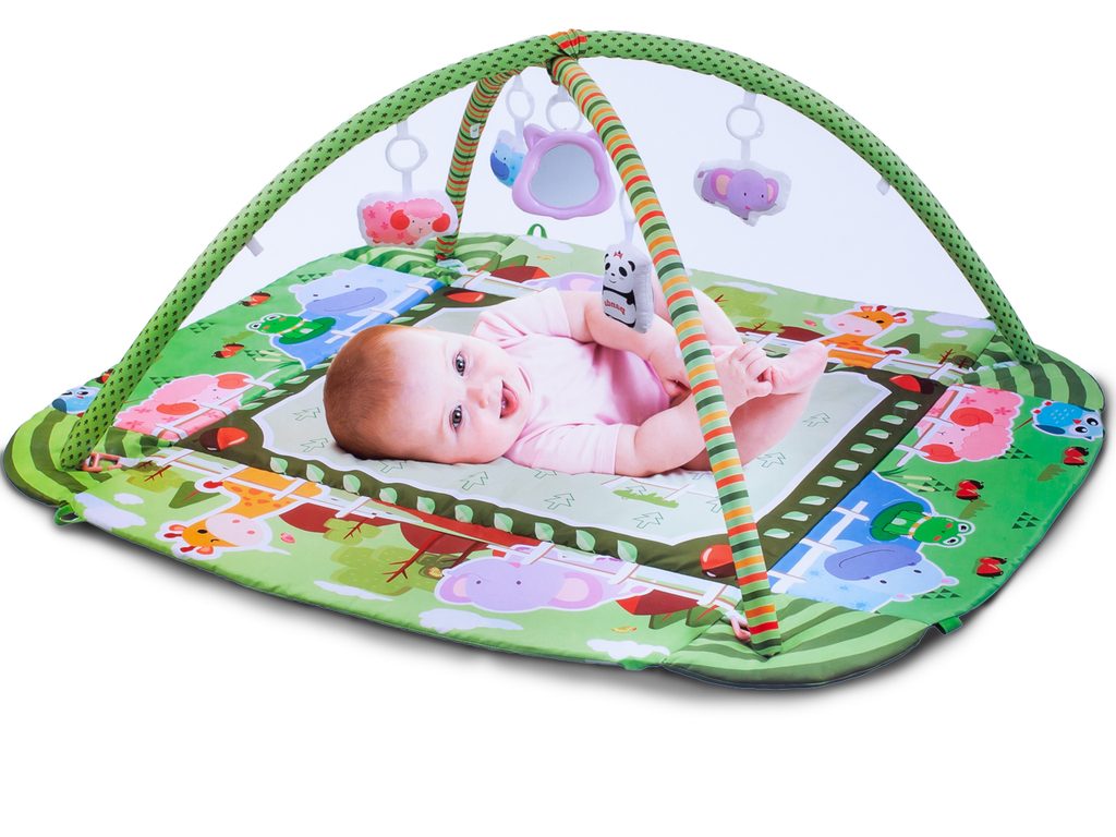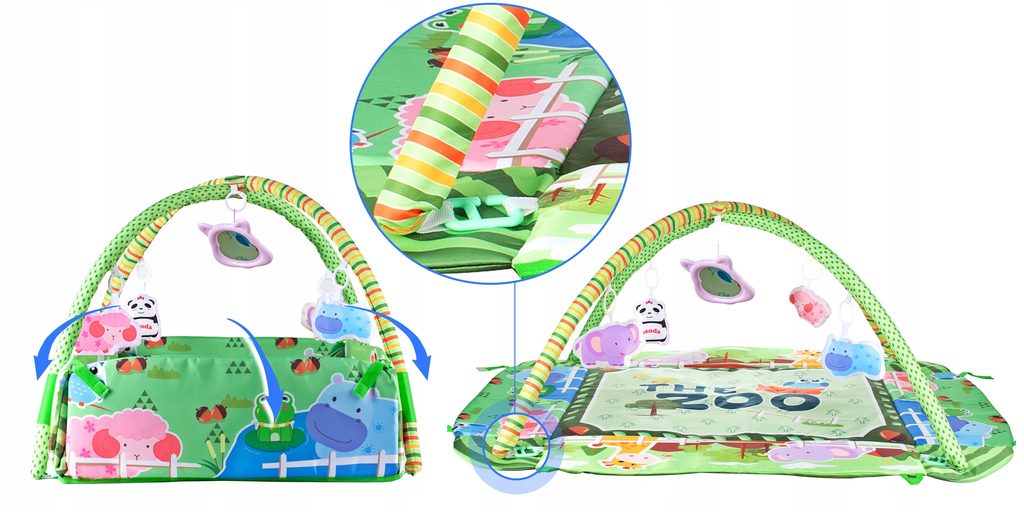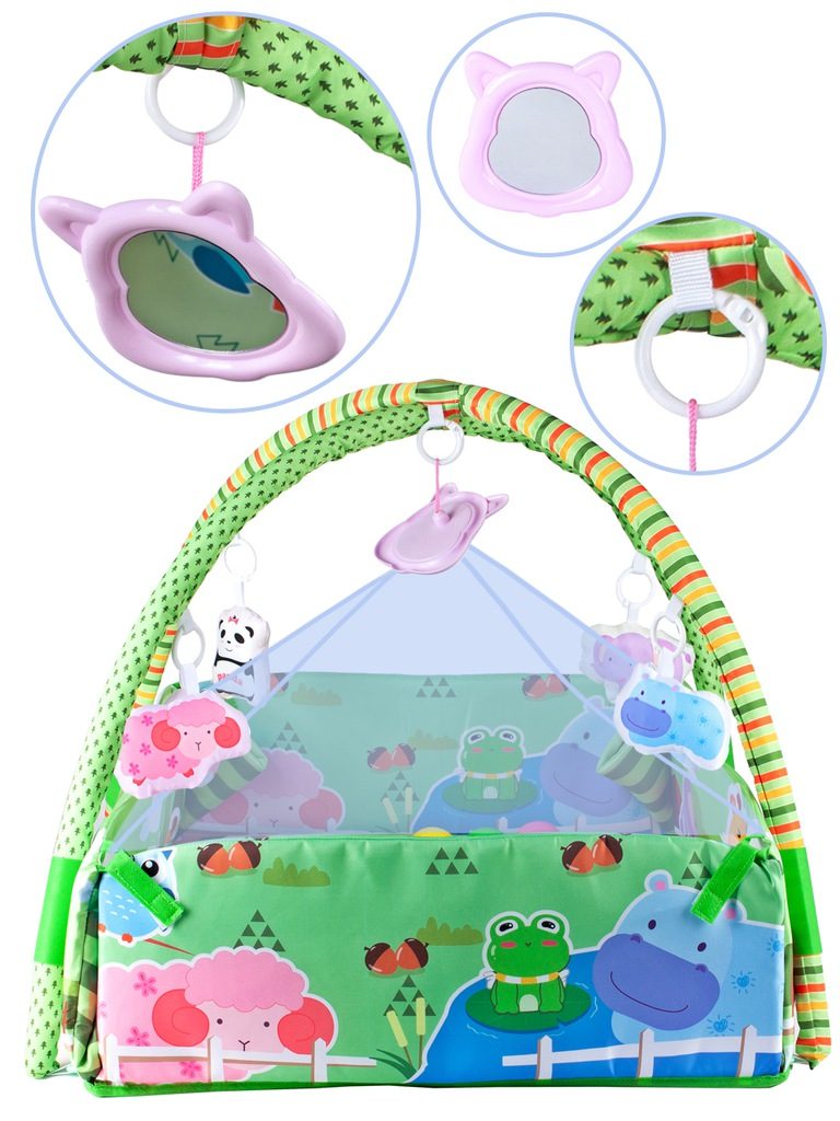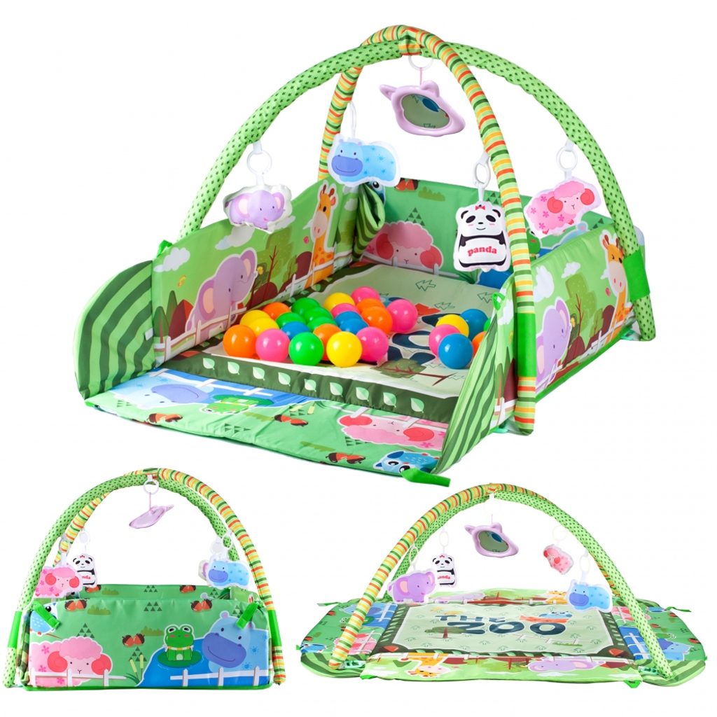 Barevná hrací deka Game Carpet se 30 míčky je určena Vašemu dítěti už od narození. Součástí deky jsou dvě hrazdičky se zavěšenými hračkami s pískátky uvnitř. Pomocí bočních stěn deky lze vytvořit ohrádka. Dítě si hrát několika způsoby dle toho jak rychle roste a má chuť si hrát. V první fázi života si dítě hraje na zádech a může pozorovat zavěšené hračky, které vzbuzují jeho zvědavost. Pro dítě, které již zvládne větší pohyby lze boční stěny jednoduše zvednout a vytvořit tak bezpečnou ohrádku pro hraní. Lze využít samostatnou deku, samostatnou ohrádku nebo zkombinovat za pomoci hrazdiček. Hračky lze odejmout a dítě si s nimi může hrát samostatně. Deka je vyrobena ze stálobarevného materiálu.