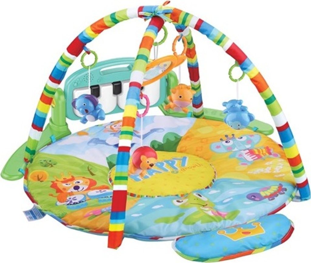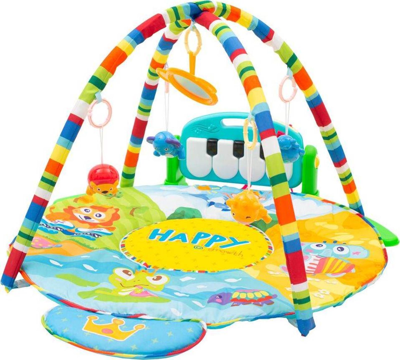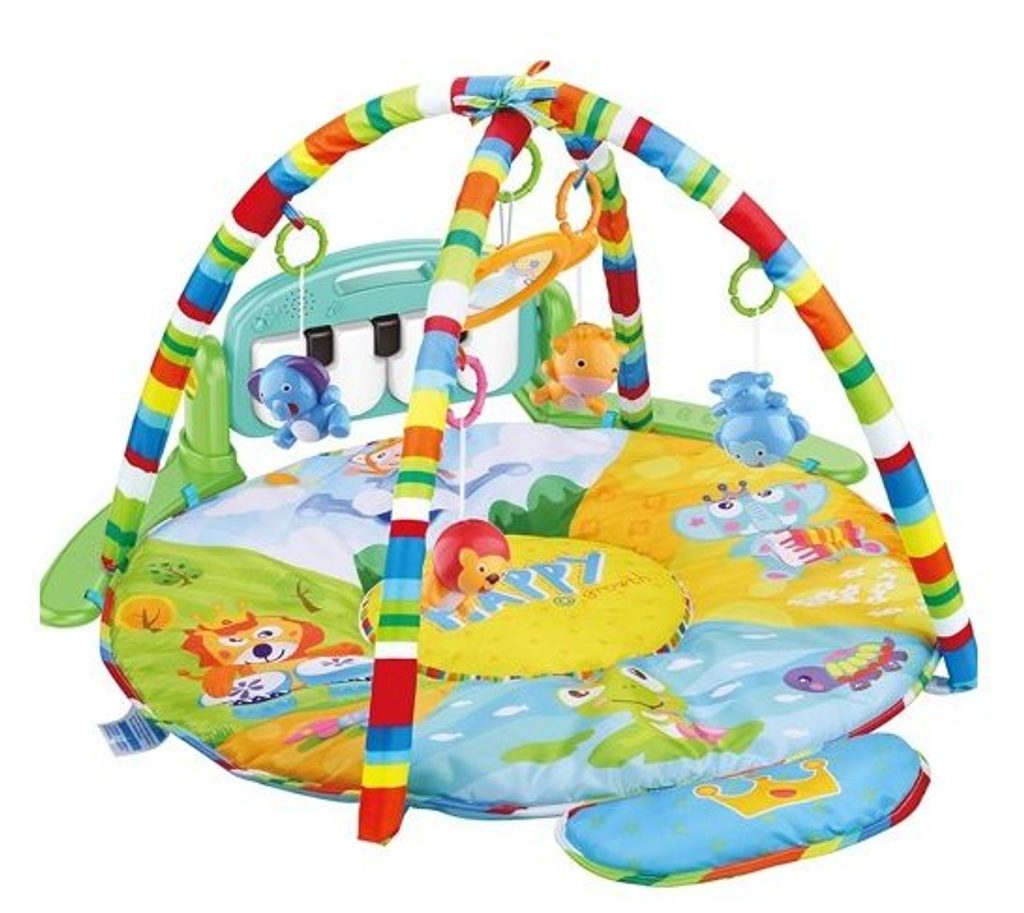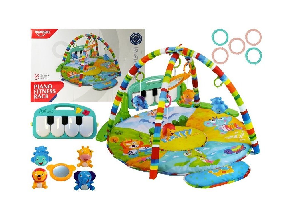 Barevná hrací deka Haunger 3v1 je určena Vašemu dítěti už od narození. Součástí deky jsou 2 hrazdičky se zavěšenými chrastítky a malinkým zrcadlem a také pianko, které svítí a hraje melodie. Dítě si může v leže hrát s chrastítky a sledovat se u toho v zrcátku a pianko může být využito jako uspávací melodie (0-12 měsíců). Na břiše se dítě naučí zvedat hlavičku a pozorovat věci kolem sebe, pomůže mu k prvním krůčkům a zároveň odděluje dítě od chladné podlahy (6-18 měsíců). Pokud již dítě samostatně sedí může hrát na pianko nebo ho využít jako interaktivní stoleček. Zároveň se tím prohlubuje motorika dítěte, rozvíjí se sluch a zrak (6-36 měsíců). Pianko můžete zavěsit také nad postýlku.