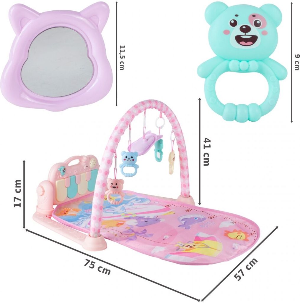 Barevná hrací deka Dráček je určena Vašemu dítěti už od narození. Součástí deky je hrazdička se zavěšenými chrastítky a malinkým zrcadlem a také pianko, které svítí a hraje melodie. Dítě si může v leže hrát s chrastítky a sledovat se u toho v zrcátku a pianko může být využito jako uspávací melodie (0-12 měsíců). Na břiše se dítě naučí zvedat hlavičku a pozorovat věci kolem sebe, pomůže mu k prvním krůčkům a zároveň odděluje dítě od chladné podlahy (6-18 měsíců). Pokud již dítě samostatně sedí může hrát na pianko nebo ho využít jako interaktivní stoleček. Zároveň se tím prohlubuje motorika dítěte, rozvíjí se sluch a zrak (6-36 měsíců).