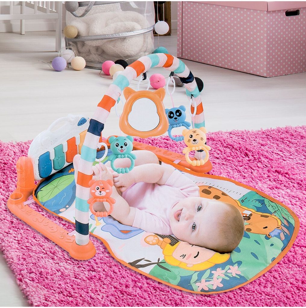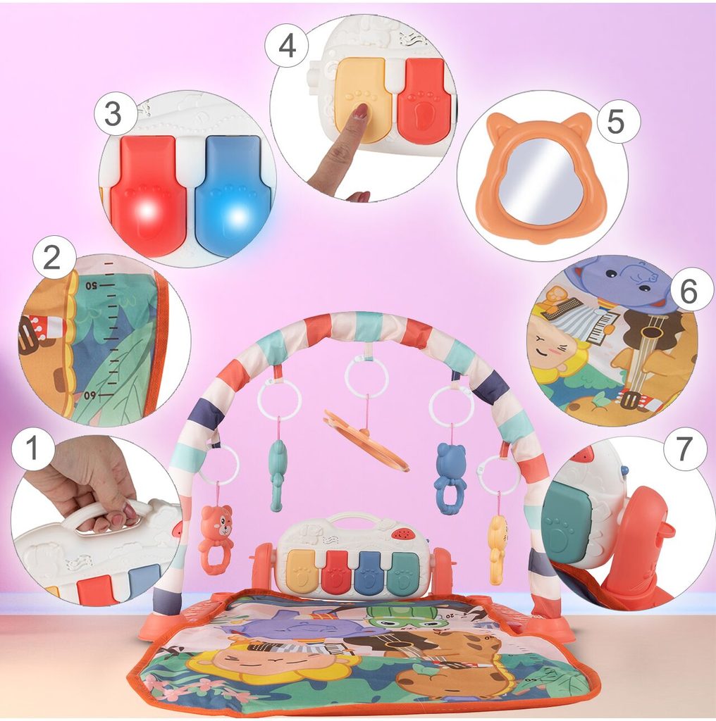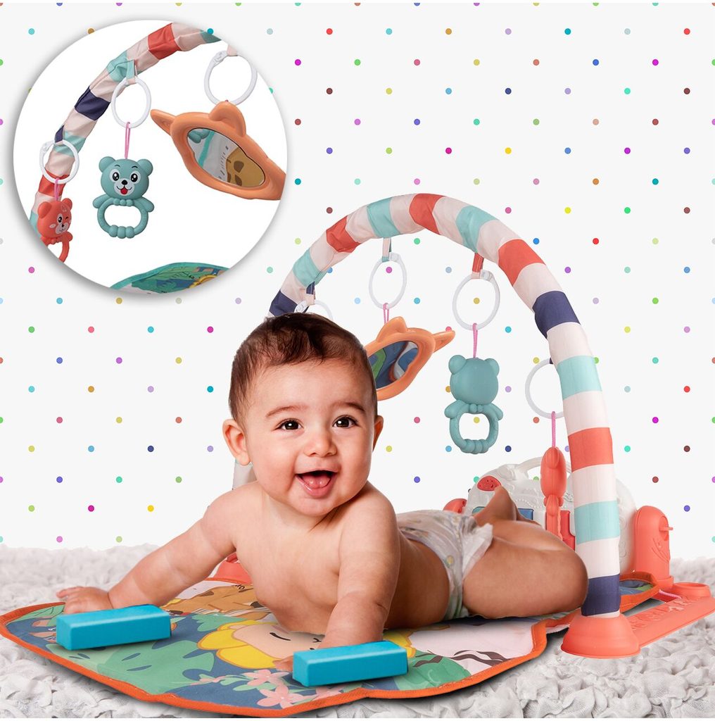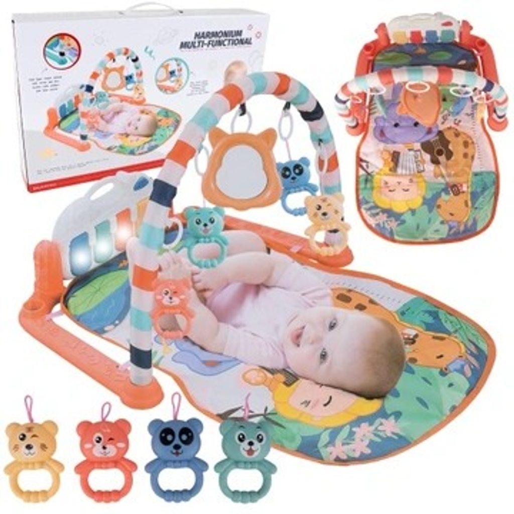 Barevná hrací deka Medvídek je určena Vašemu dítěti už od narození. Součástí deky je hrazdička se zavěšenými chrastítky a malinkým zrcadlem a také pianko, které svítí a hraje melodie. Dítě si může v leže hrát s chrastítky a sledovat se u toho v zrcátku a pianko může být využito jako uspávací melodie (0-12 měsíců). Na břiše se dítě naučí zvedat hlavičku a pozorovat věci kolem sebe, pomůže mu k prvním krůčkům a zároveň odděluje dítě od chladné podlahy (6-18 měsíců). Pokud již dítě samostatně sedí může hrát na pianko nebo ho využít jako interaktivní stoleček. Zároveň se tím prohlubuje motorika dítěte, rozvíjí se sluch a zrak (6-36 měsíců).
