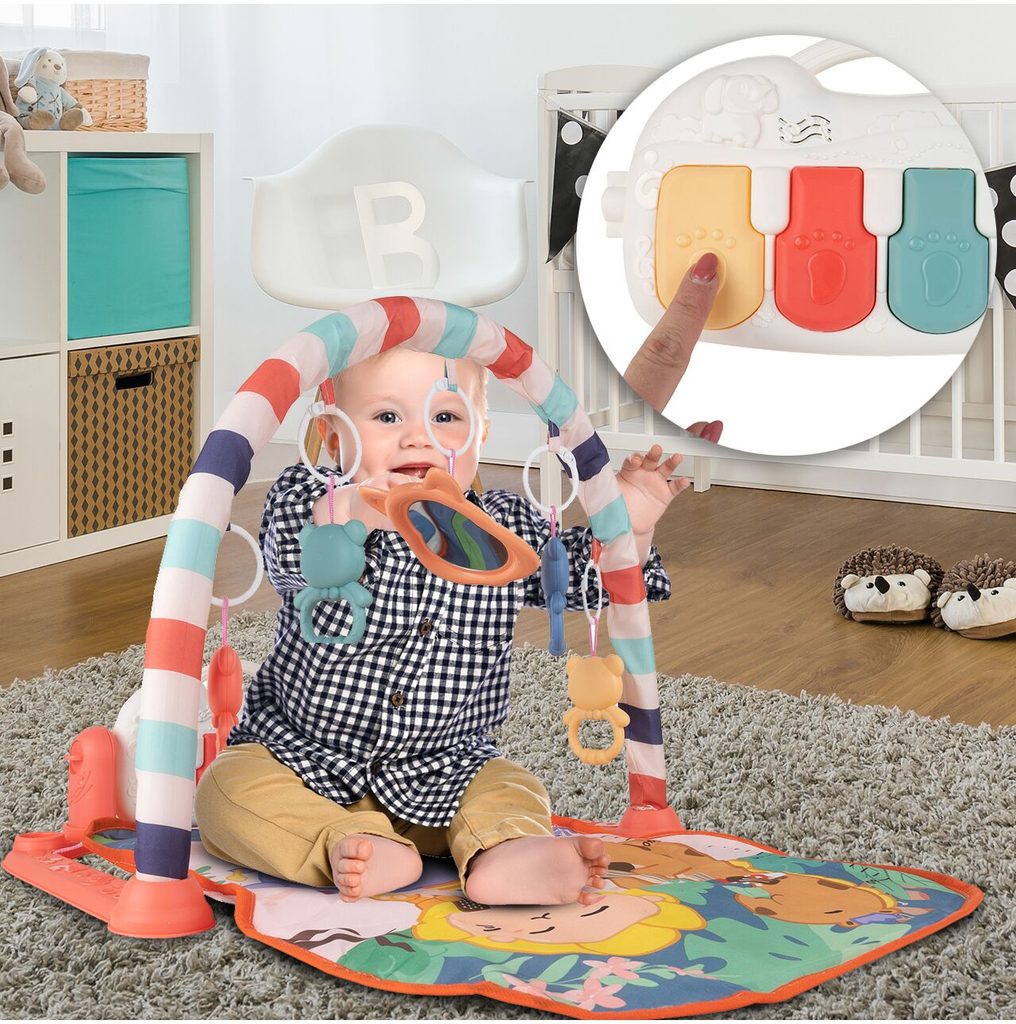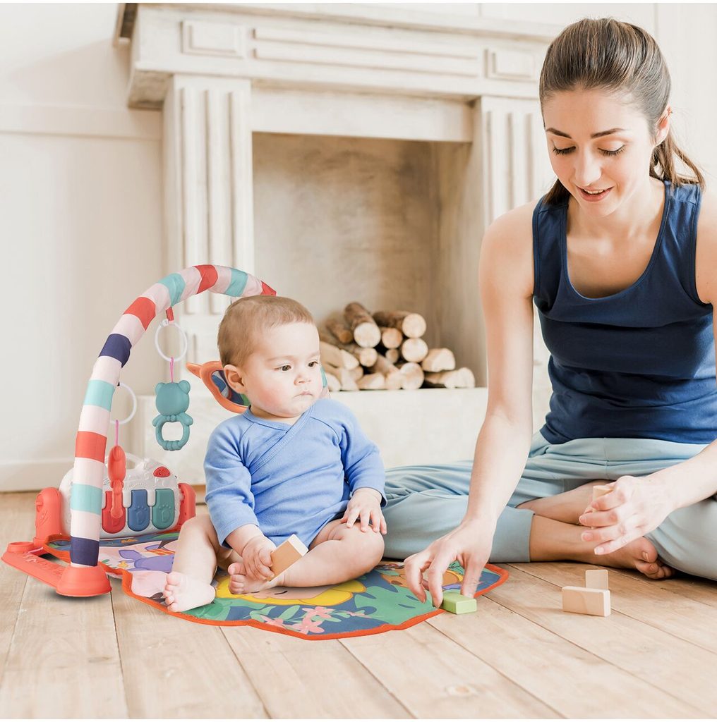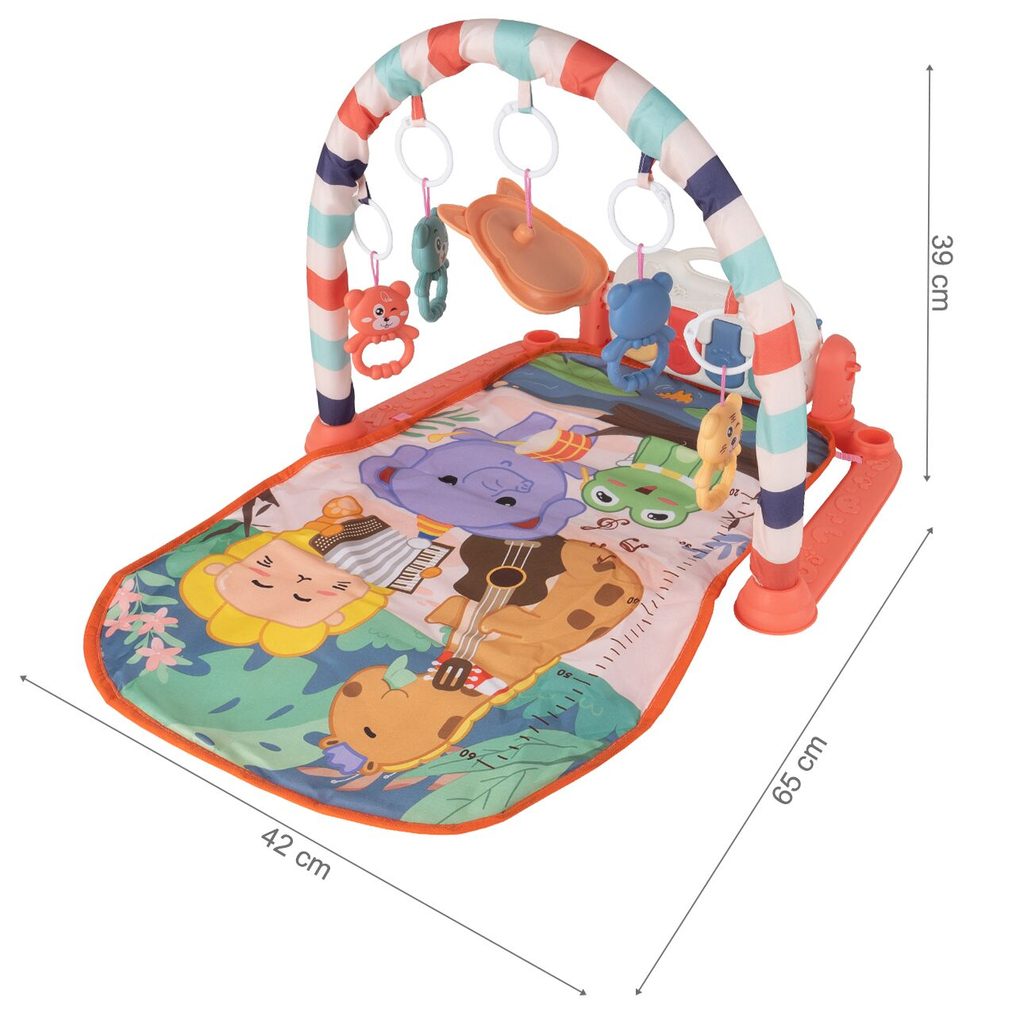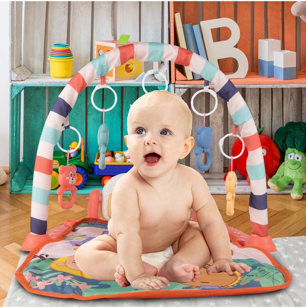 Barevná hrací deka Medvídek je určena Vašemu dítěti už od narození. Součástí deky je hrazdička se zavěšenými chrastítky a malinkým zrcadlem a také pianko, které svítí a hraje melodie. Dítě si může v leže hrát s chrastítky a sledovat se u toho v zrcátku a pianko může být využito jako uspávací melodie (0-12 měsíců). Na břiše se dítě naučí zvedat hlavičku a pozorovat věci kolem sebe, pomůže mu k prvním krůčkům a zároveň odděluje dítě od chladné podlahy (6-18 měsíců). Pokud již dítě samostatně sedí může hrát na pianko nebo ho využít jako interaktivní stoleček. Zároveň se tím prohlubuje motorika dítěte, rozvíjí se sluch a zrak (6-36 měsíců).