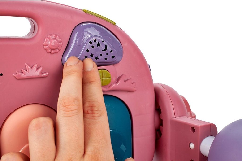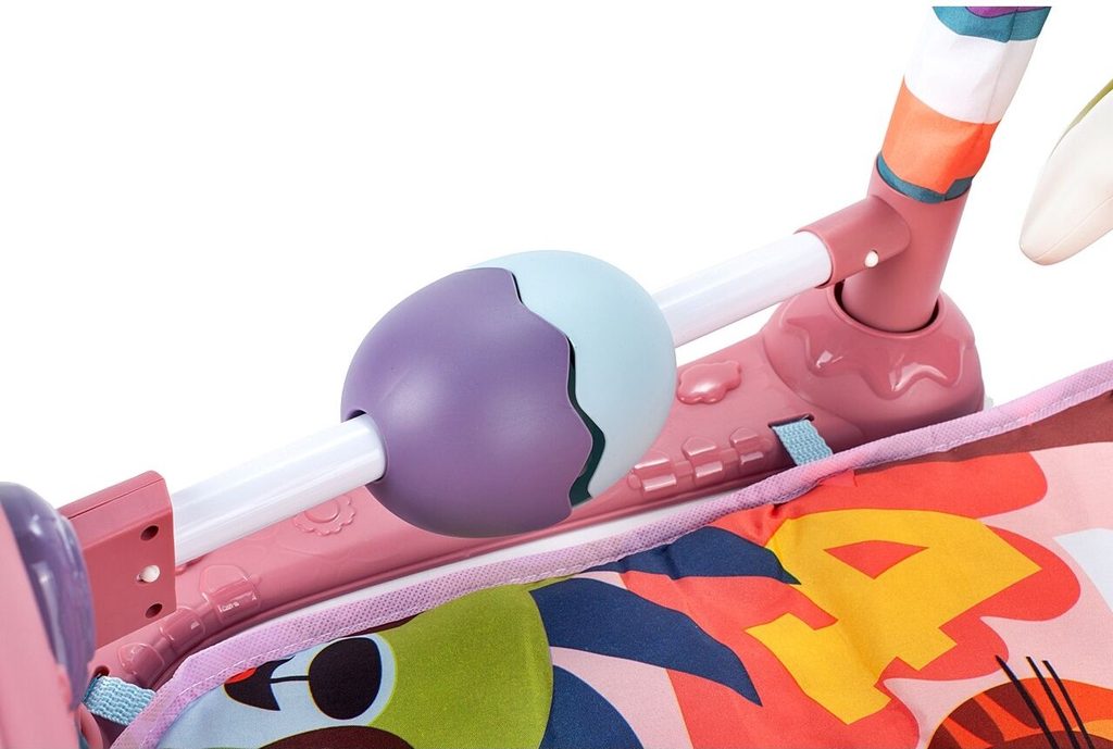 • na hrazdičce jsou zavěšeny chrastítka ve tvaru zvířátek a malinké zrcadlo