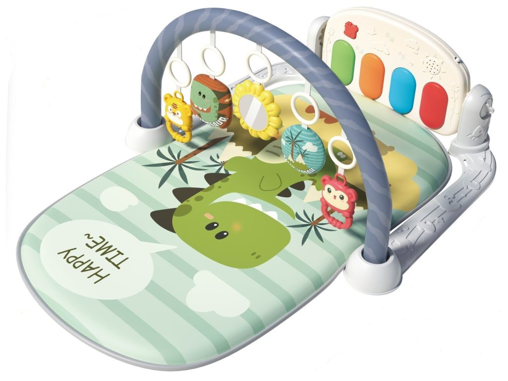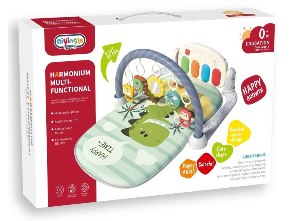 Barevná hrací deka Dinosaurus je určena Vašemu dítěti už od narození. Součástí deky je hrazdička se zavěšenými kousátky, hračkami a malinkým zrcadlem a také pianko, které svítí a hraje melodie. Dítě si může v leže hrát s chrastítky a sledovat se u toho v zrcátku a pianko může být využito jako uspávací melodie (0-12 měsíců). Na břiše se dítě naučí zvedat hlavičku a pozorovat věci kolem sebe, pomůže mu k prvním krůčkům a zároveň odděluje dítě od chladné podlahy (6-18 měsíců). Pokud již dítě samostatně sedí může hrát na pianko nebo ho využít jako interaktivní stoleček. Zároveň se tím prohlubuje motorika dítěte, rozvíjí se sluch a zrak (6-36 měsíců).