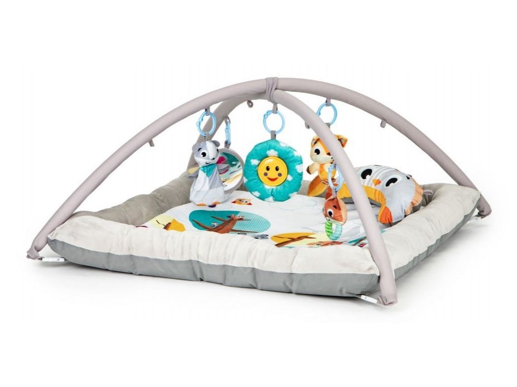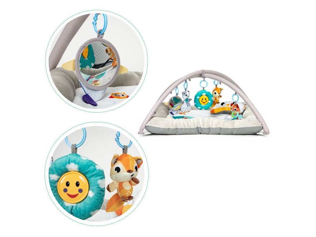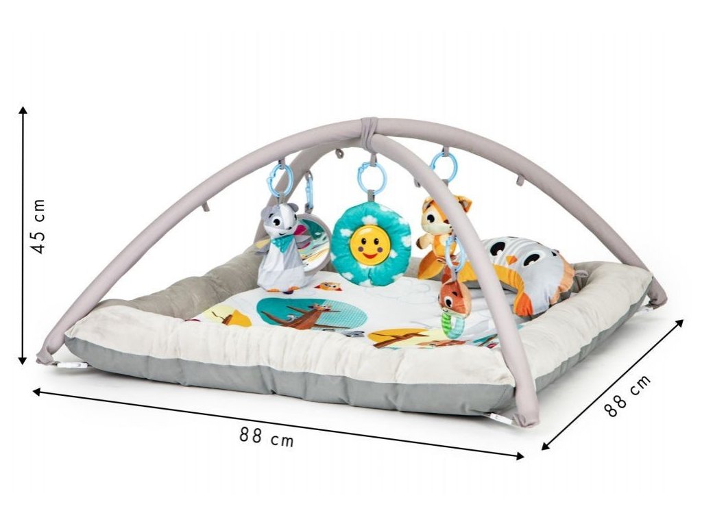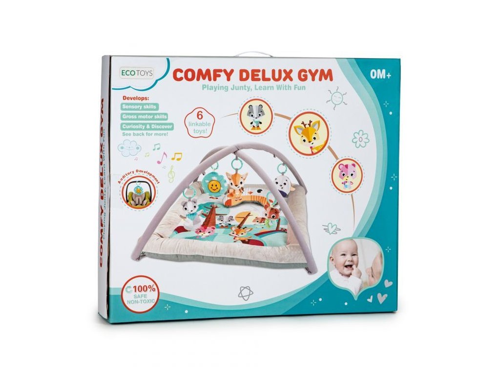 Ecotoys barevná hrací deka Deluxe Gym s vysokými okraji je určena Vašemu dítěti už od narození. Součástí deky jsou dvě hrazdičky se zavěšenými hračkami z nichž jedna je napájena bateriemi a vydává melodie a také polštářek. V první fázi života si dítě hraje na zádech a může pozorovat zavěšené hračky, které vzbuzují jeho zvědavost. Pro dítě, které již zvládne větší pohyby lze využít pouze samostatnou deku. Hračky lze odejmout a dítě si s nimi může hrát samostatně. Deka je vyrobena ze stálobarevného materiálu a její velkou výhodou jsou vysoké měkké okraje.