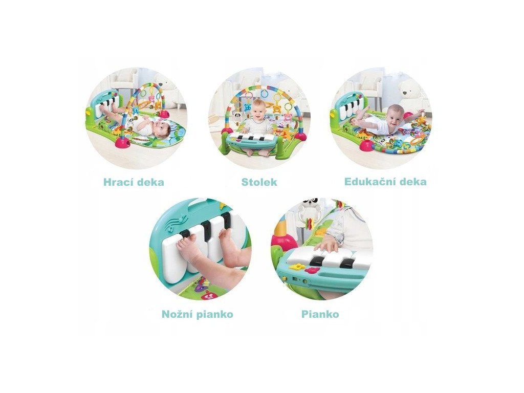 Barevná hrací deka Haunger 3v1 je určena Vašemu dítěti už od narození. Součástí deky je hrazdička se zavěšenými chrastítky a malinkým zrcadlem a také pianko, které svítí a hraje melodie. Dítě si může v leže hrát s chrastítky a sledovat se u toho v zrcátku a pianko může být využito jako uspávací melodie (0-12 měsíců). Na břiše se dítě naučí zvedat hlavičku a pozorovat věci kolem sebe, pomůže mu k prvním krůčkům a zároveň odděluje dítě od chladné podlahy (6-18 měsíců). Pokud již dítě samostatně sedí může hrát na pianko nebo ho využít jako interaktivní stoleček. Zároveň se tím prohlubuje motorika dítěte, rozvíjí se sluch a zrak (6-36 měsíců).