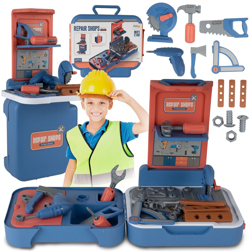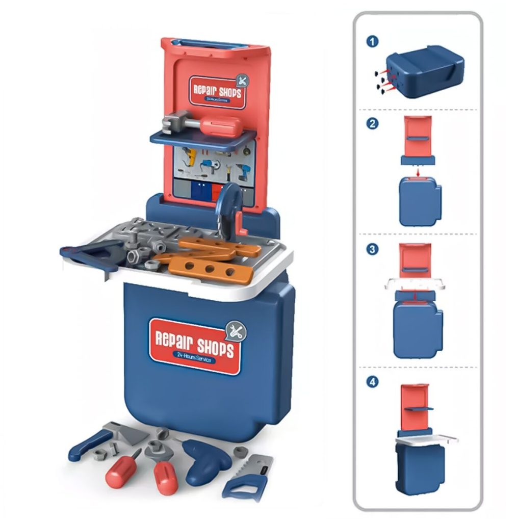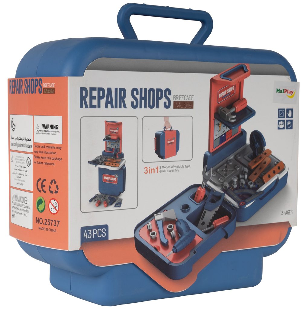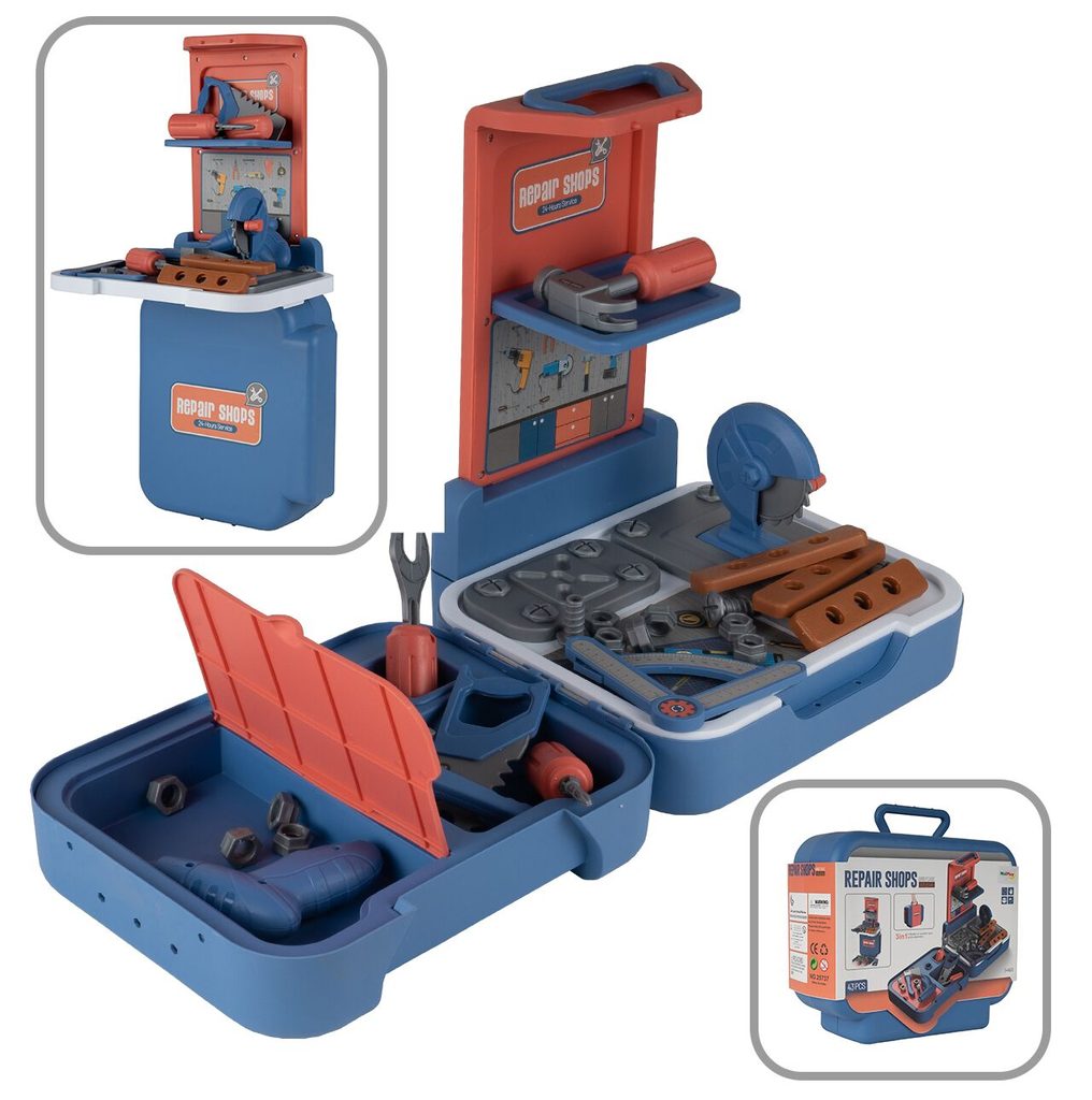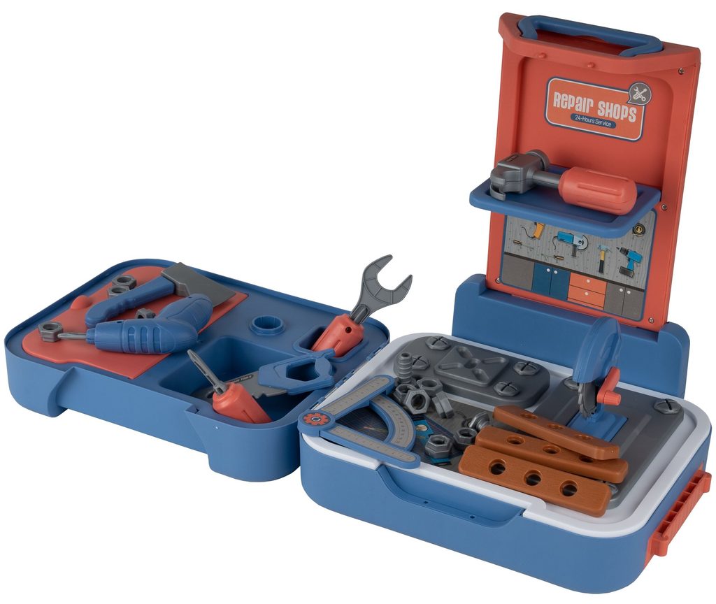 Skládací dětská dílna v kufříčku Repair Shop je určen pro děti od 3 let věku. Je vybavena příslušenstvím jako je kladívko, klíč, šroubovák, matice a šrouby, polička, konstrukční díly a další.. Vaše dítě se určitě s touto hračkou nudit nebude. Nespornou výhodou je možnost složení salónu do kufříku s úchytem. Dítě si ji tak může vzít všude sebou. Je vyroben z plastu v pestrobarevném provedení.