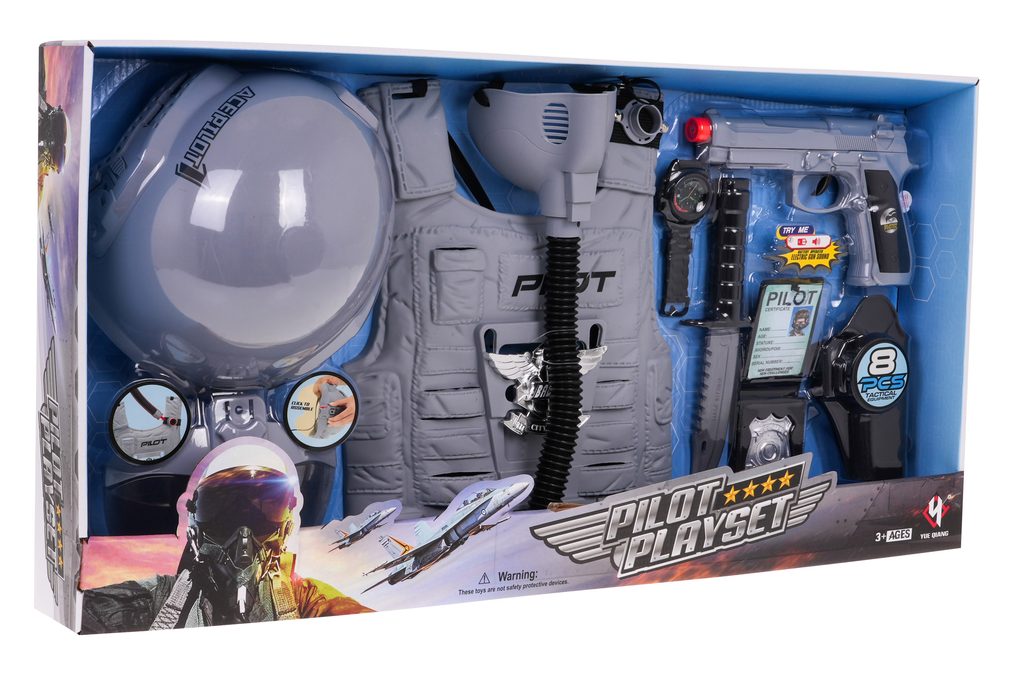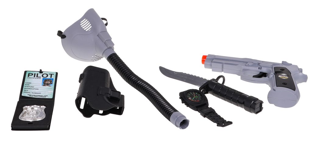 Sestava Pilot Playset s maskou a kompletním příslušenstvím je ideální hračkou pro každého malého pilota. V sestavě najdete vše co bude potřebovat. Vestu s odznakem, průkaz pilota, hodinky, pouzdro, kyslíkovou masku, nůž a také pistoli na baterie, která vydává zvuky. Hračka je určena pro děti od 36 měsíců věku.