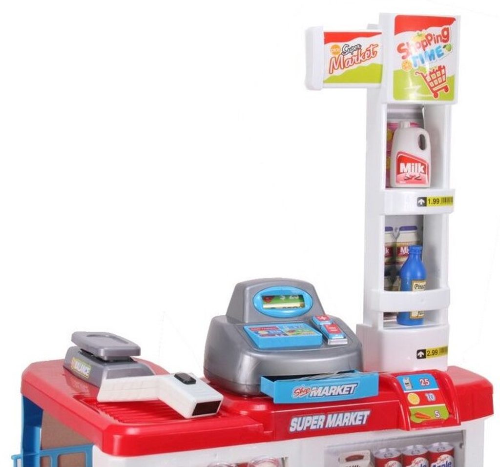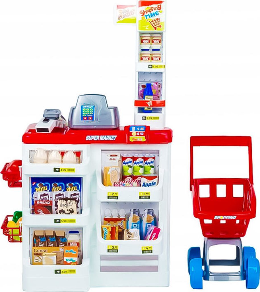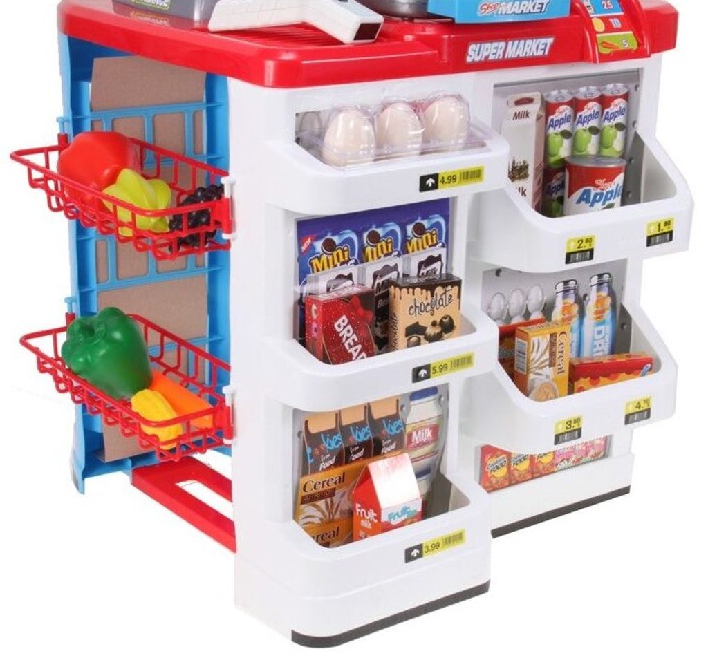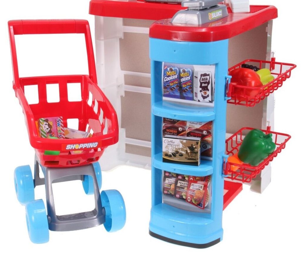 Dětský obchůdek Ecotoys s nákupním vozíčkem přemění Vaše dítě ve skutečného prodavače. Je vybaven vším důležitým co takový malý obchodník potřebuje. Najdete zde pokladnu s tlačítky, váhu, čtečku čárových kodu, která svítí a vydává charakteristický zvuk, imitace ovoce zeleniny, bankovky a také různé balení potravin. Obchůdek má samozřejmě police, kde může být vše přehledně vystaveno. Hračka je určena pro děti od 36 měsíců věku.