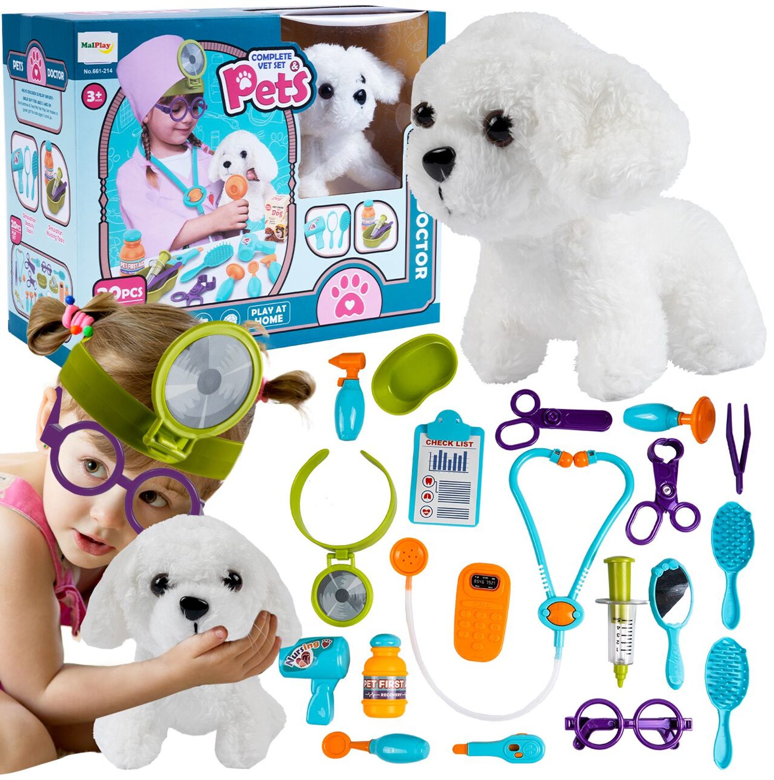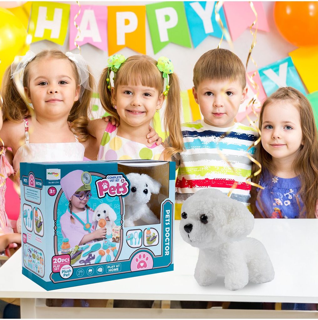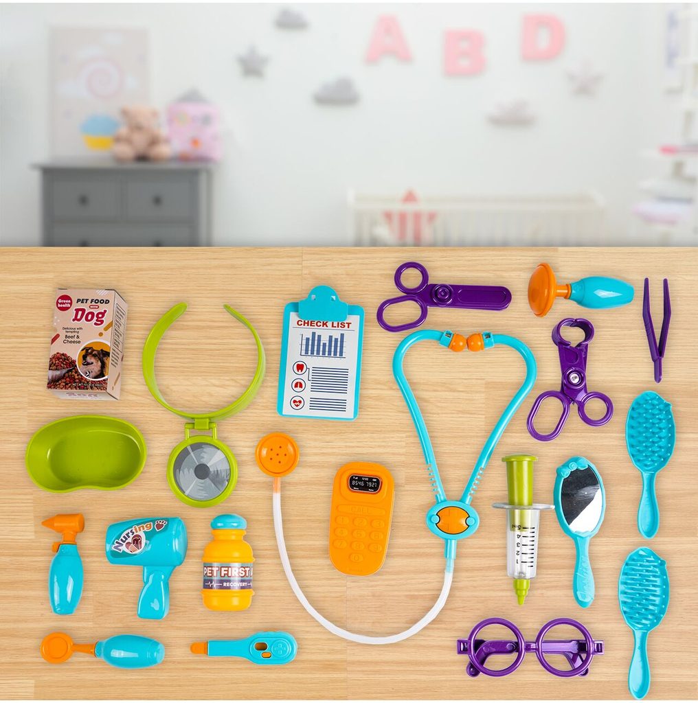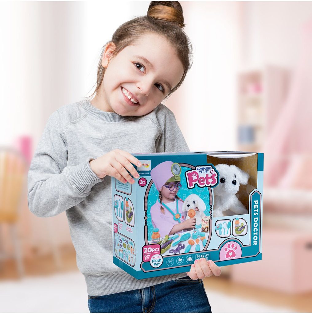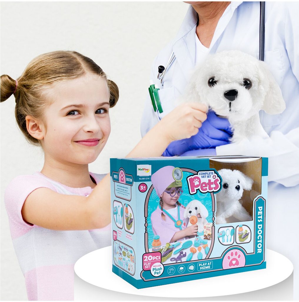 Sestava Malý veterinář je určena pro děti od 36 měsíců věku. Je vybavena celkem 20 součástmi. Kromě plyšového pejska, který spouží jako pacient zde najdete stetoskop, teploměr, přístroj na vyšetření uší, lékařské brýle, misku na léky, zrcátko, lékařské nůžky a další příslušenství. Vaše dítě se určitě s touto hračkou nudit nebude. Vše je vyrobeno z plastu v pestrobarevném provedení.