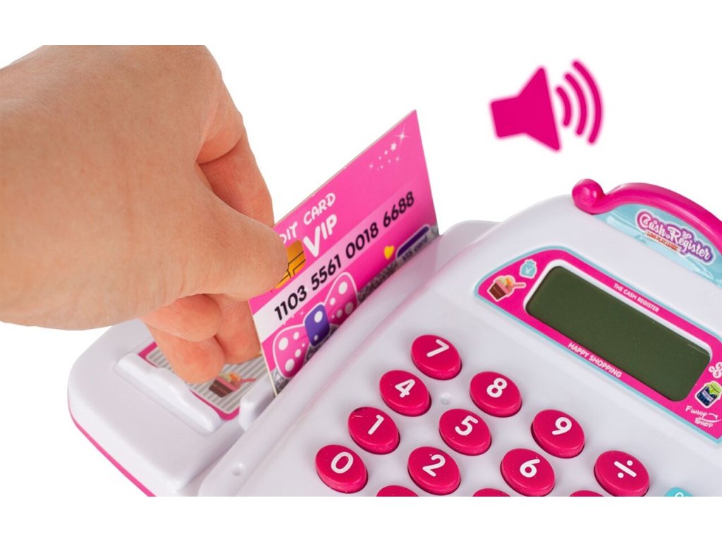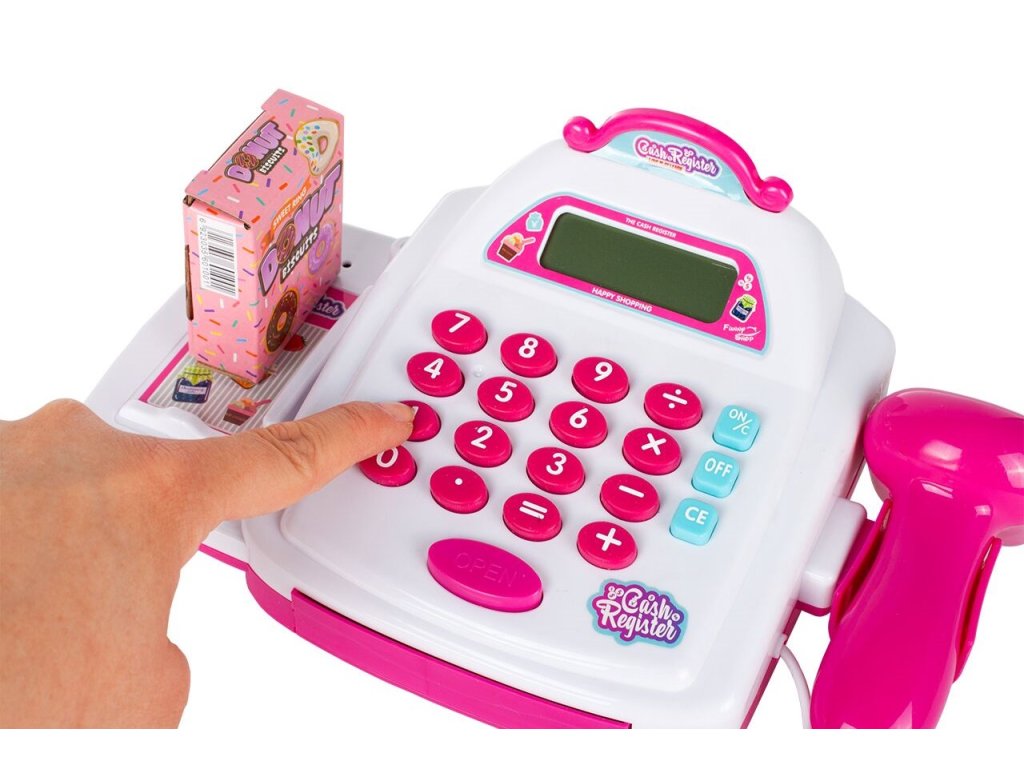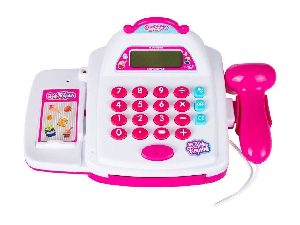 Dětská elektronická pokladna s displejem přemění Vaše dítě ve skutečného prodavače. Je vybavena LCD displejem, který funguje jako skutečná kalkulačka. Ve spodní části je umístěna výsuvná přihrádka na bankovky a mince, které jsou také součástí balení. Otevírá se zmáčknutím tlačítka a dá se uzamknout klíčkem. Součástí balení jsou také nákupní košíček, vozíček a imitace potravin. Hračka je určena pro děti od 36 měsíců věku.
