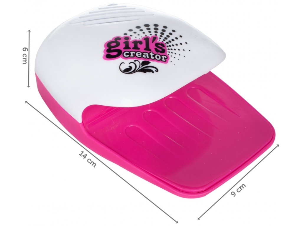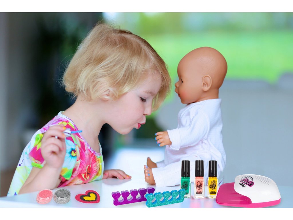 Kompletní nehtové studio Nail Glam salon obsahuje vše potřebné k péči o dětské nehty. Holčičky zde najdou laky a třpyty na nehty, oddělovače, pilníček ve tvaru srdce, nálepky na nehty a také sušičku na baterie pod kterou si mohou hotové nehty hned usušit. Sada je vyrobena z bezpečných netoxických materiálů. Po nalakování lze lak jednoduše odloupnout bez použití odlakovače.Hračka je vyrobená z plastu v pestrobarevném provedení a určena pro děti od 5 let.