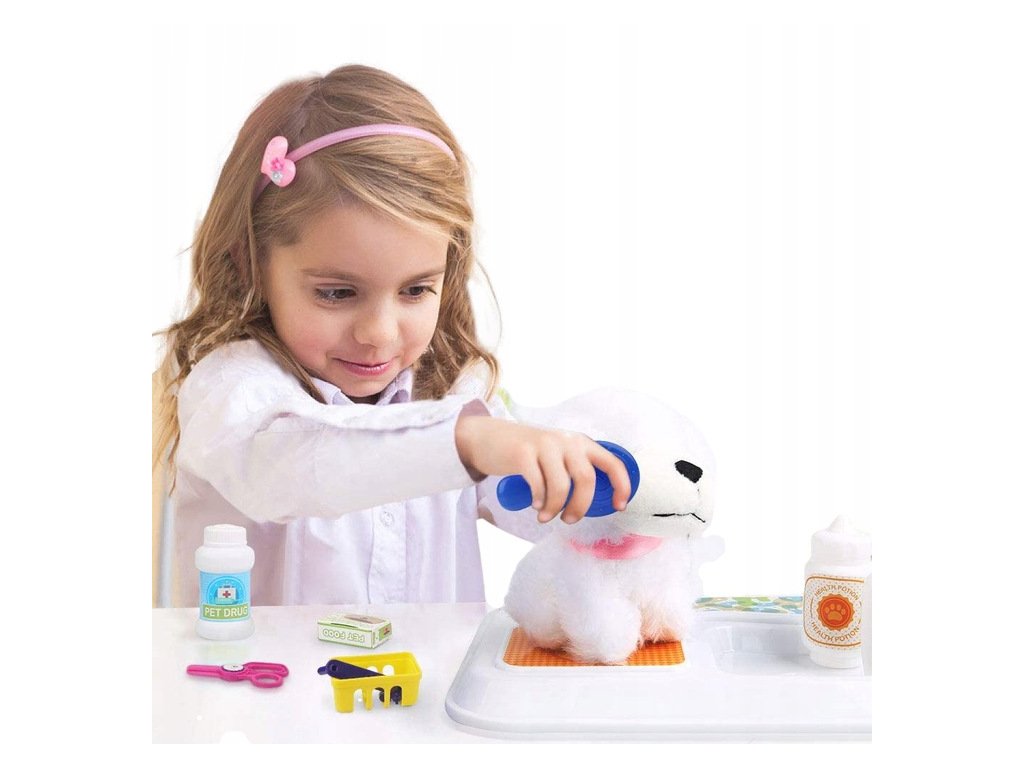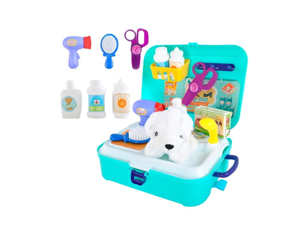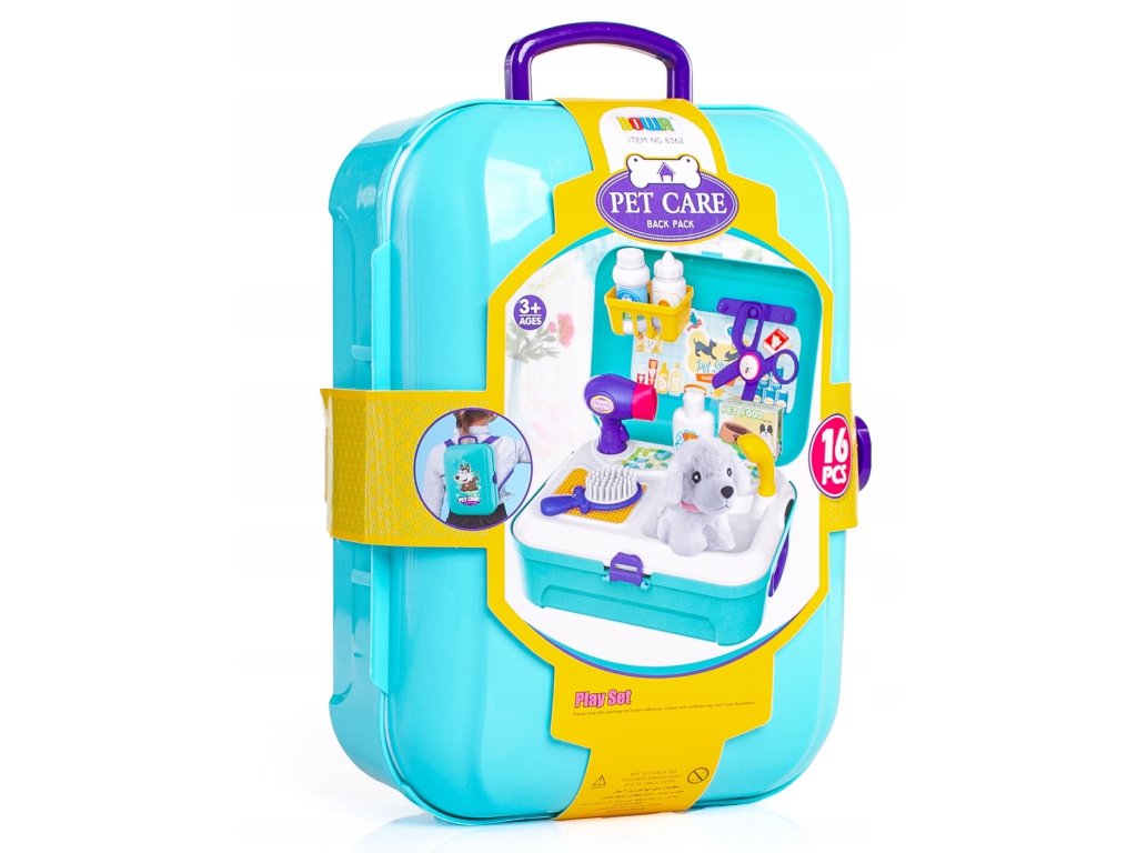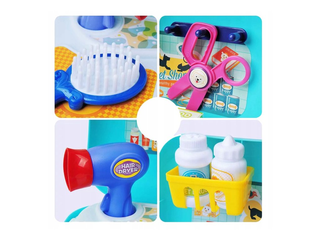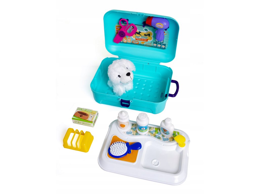 Rozkládací kosmetický salón pro pejska Pet Care obsahuje vše potřebné pro péči o své oblíbené zvířátko. Lze ho jednoduše složit a rozložit a díky přiloženým popruhům ho lze jednoduše přenášet. Součástí salónu jsou kromě plyšového pejska také kartáč, hřeben, dřez, šampón, atrapa fénu, polička, věšák a jídlo pejska. Hračka je vyrobená z plastu v pestrobarevném provedení a určena pro děti od 3 let.