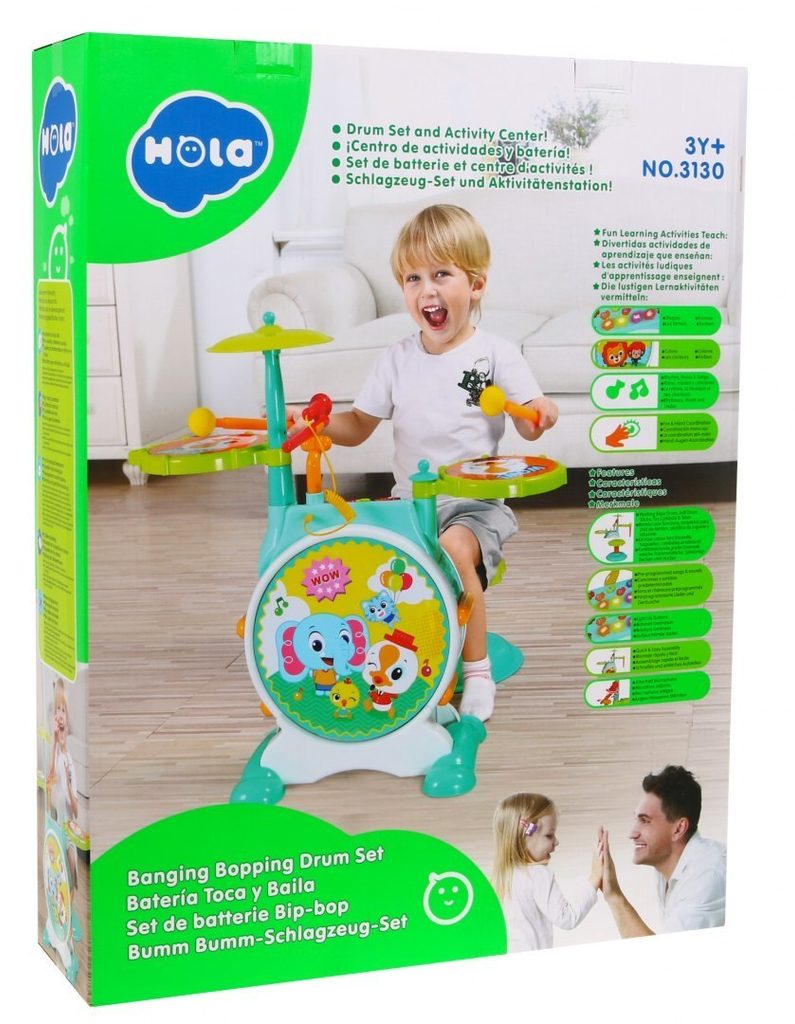 Sestava bicích nástrojů Huile Toys je ideální hračkou pro ty nejmenší děti. Umožní dítěti rozvíjet smysl pro rytmus a koordinaci. Hračka vydává úderem paliček reálné zvuky hudebních nástrojů. Velký buben se ovládá nožním pedálem. Hudební panel je vybaven světelnými efekty a tlačítkem s hudebním pozadím (10 různých melodií a 3 rytmy). Hlasitost lze regulovat. Součástí balení je praktická židilička. Hračka je určena pro děti od 36 měsíců věku.