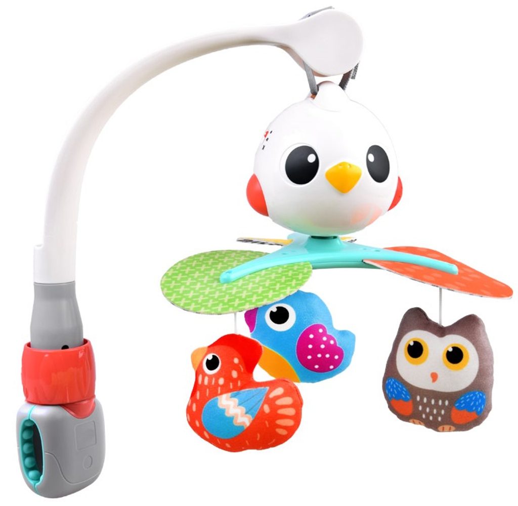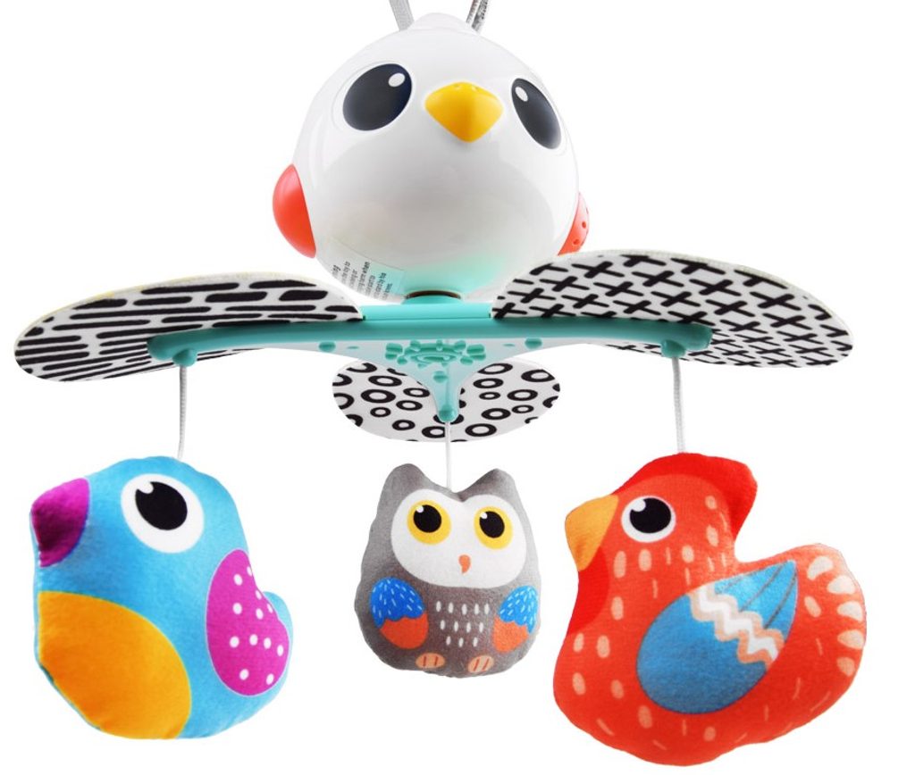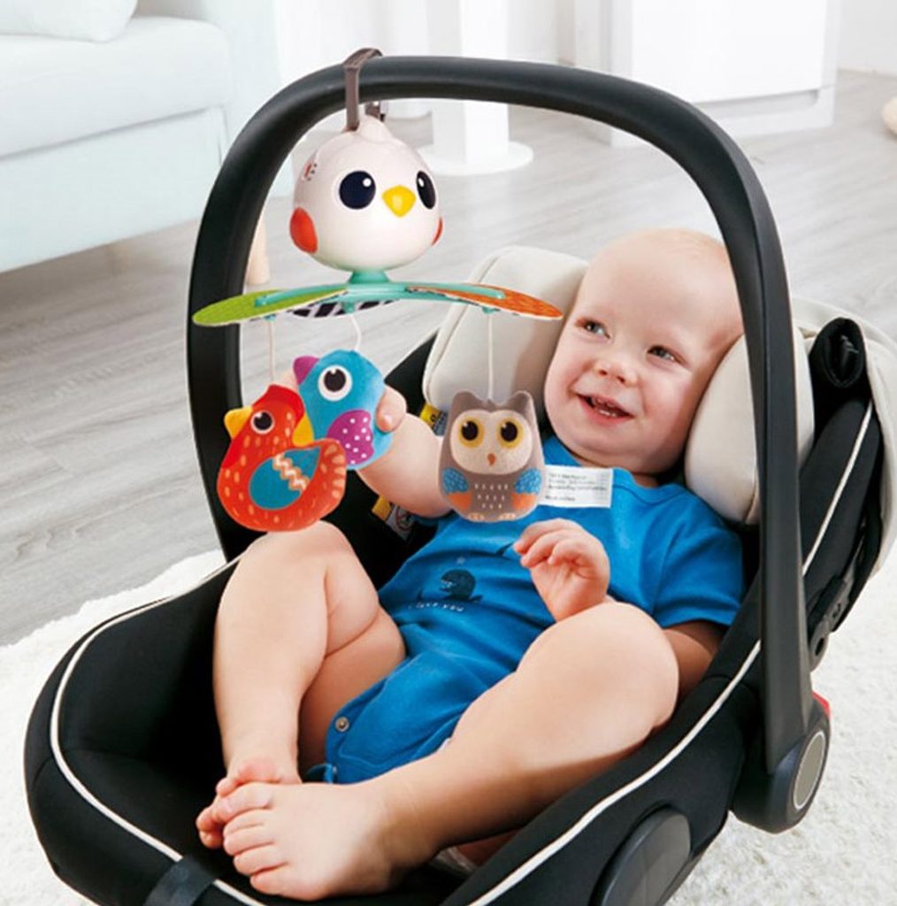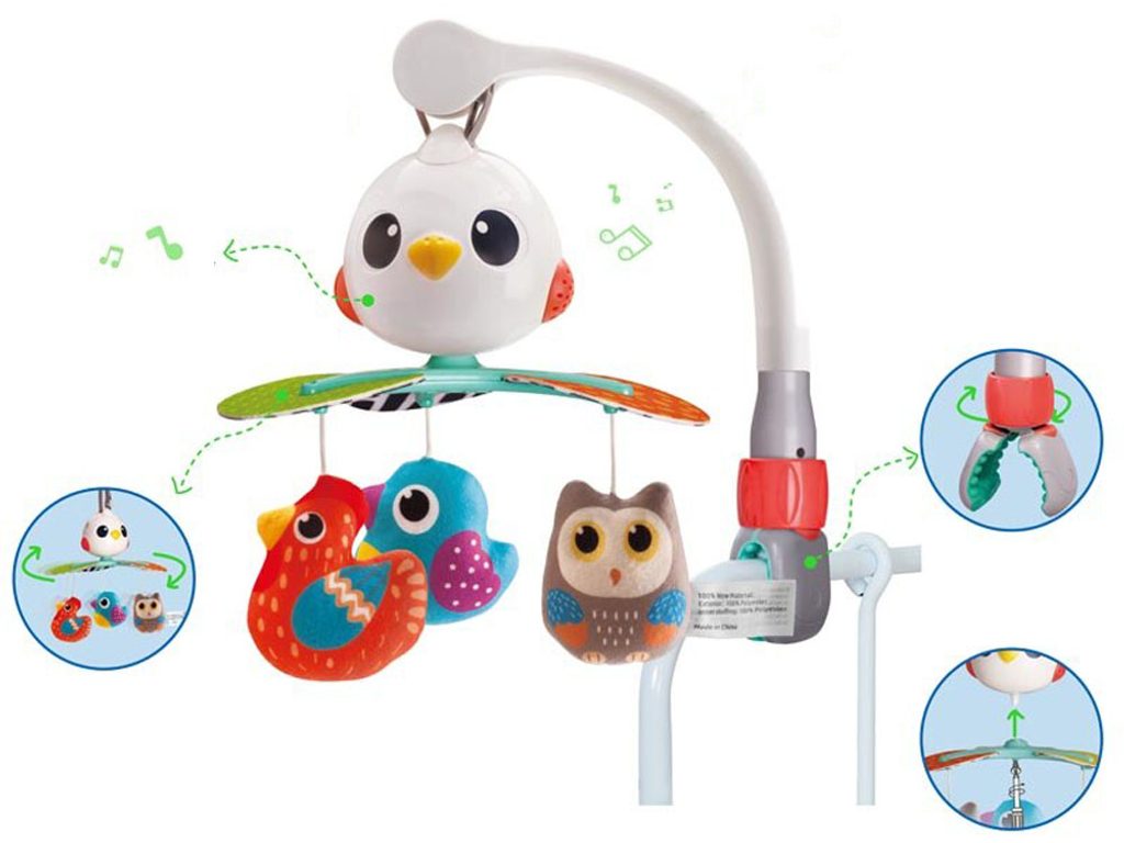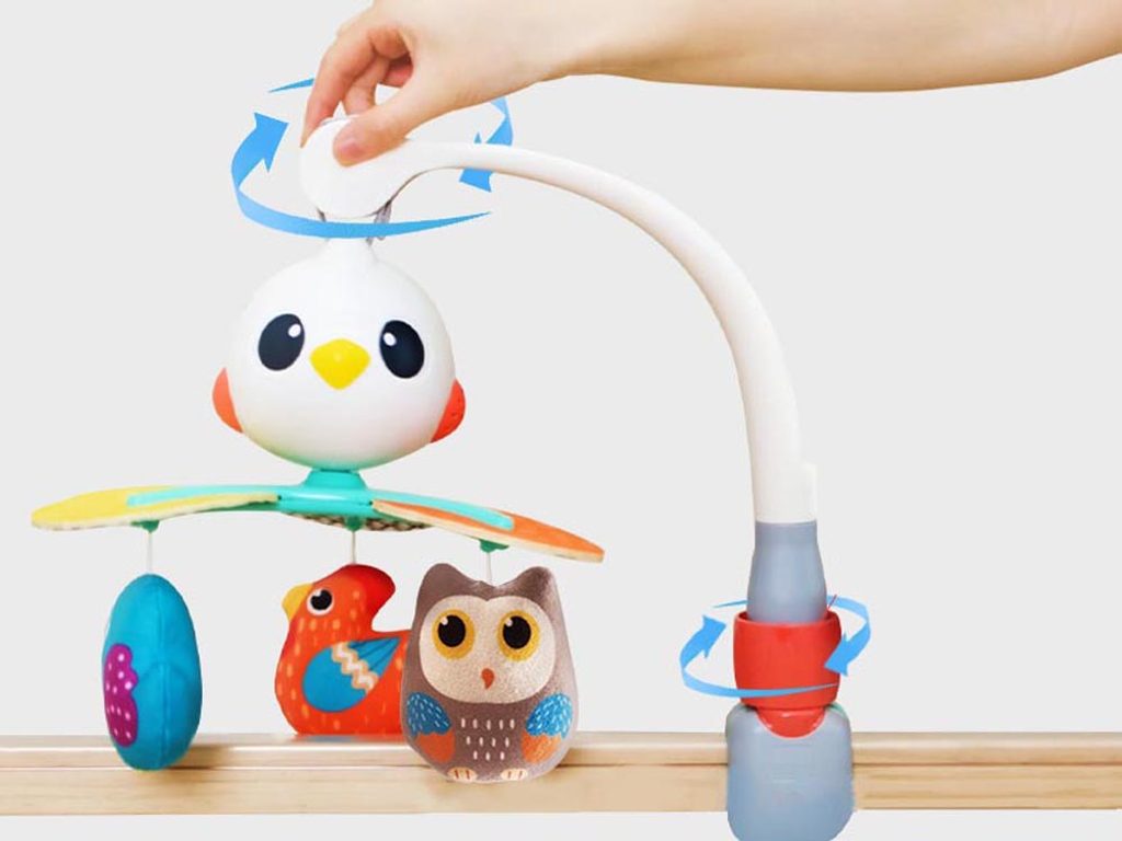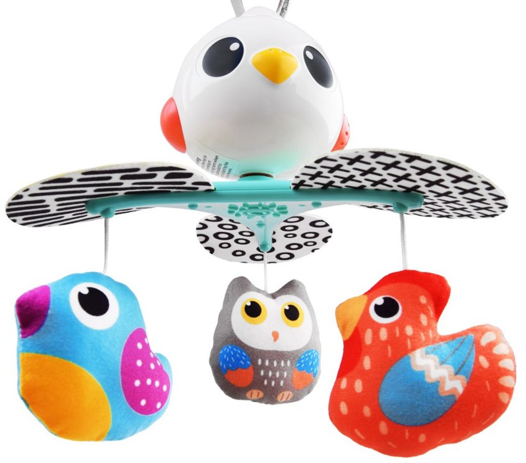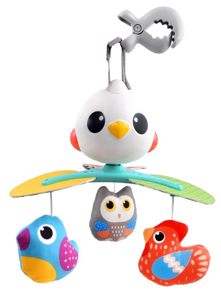 Nádherný dětský kolotoč Huile Toys Bird Toys se 3 zavěšenými plyšovými hračkami ve tvaru ptáčků je ideální pro děti od narození. Díky univerzálnímu úchytu se snadno umístí nad autosedačku, kočárek nebo nad postýlku. Je vybaven uklidňujícími melodiemi, které lze vypnout a kolotoč se tak otáčí bez zvuku.