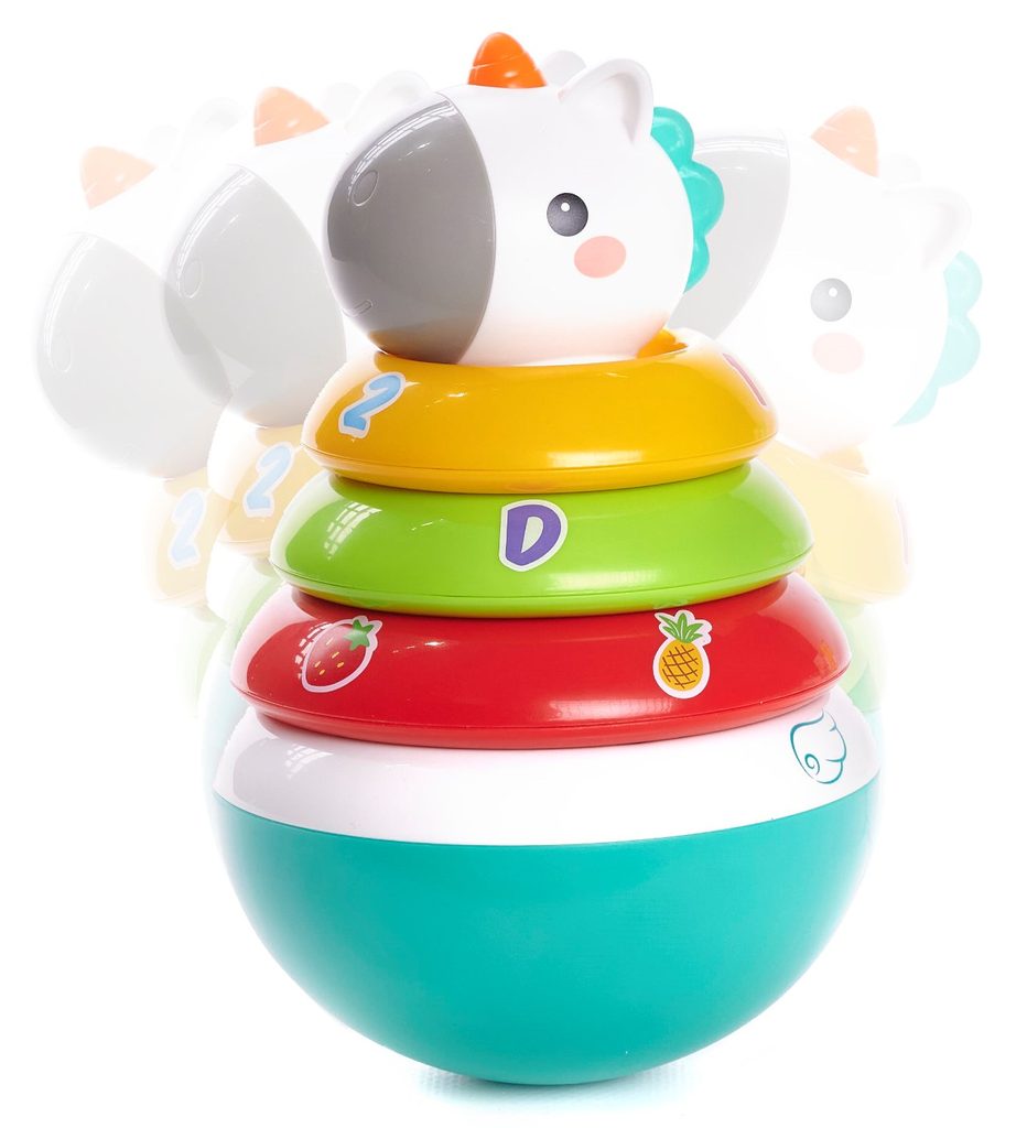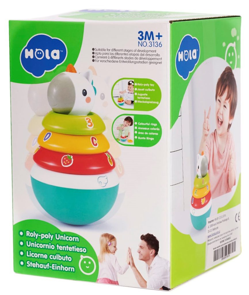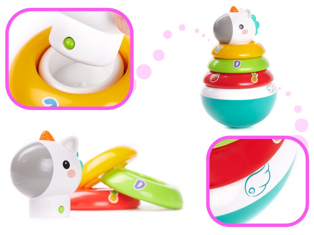 Multifunkční hračka Huile Toys pro nejmenší děti ve tvaru pyramidy Roly Poly Unicorn je ideální hračkou pro ty nejmenší děti. Tato hračka roste spolu s dítětem. Obruče slouží jako chrastítka, stimulují tak zrak, sluch a hmat. Celý jednorožec se také naklání ze strany na stranu, je tak skvělou pomůckou při plazení. Poslední funkcí je uspořádávaní prstenců což podporuje rozvoj manuální zručnosti a učí děti rozpoznávat barvy. Hračka je určena pro děti od 3 měsíců věku.