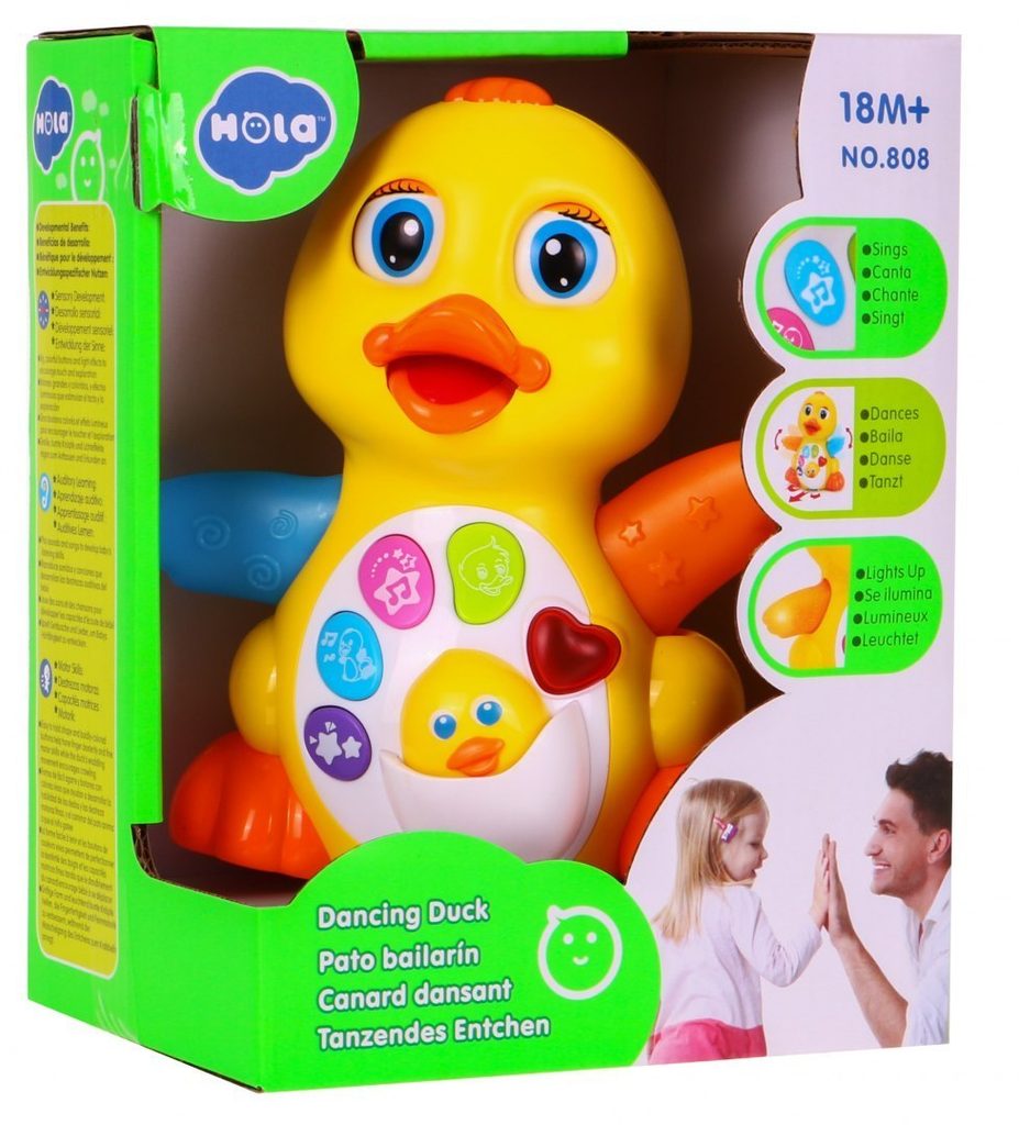 Interaktivní tančící kačenka Dancing Duck je ideální hračkou pro ty nejmenší děti. Umožní dítěti rozvíjet hmat, zrak, sluch, rozpoznávání tvarů a logické myšlení. Tato hračka má spoustu užitečných funkcí. Je vybavena dvoustupňovou regulací hlasitosti, sama se pohybuje a nárazem na překážku změní směr. Po celou dobu pohybu třepotá křidélky, které navíc svítí. Celkem 6 tlačítek vydává různé zvuky a melodie. Hračka je určena pro děti od 18 měsíců věku.