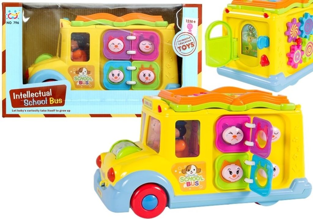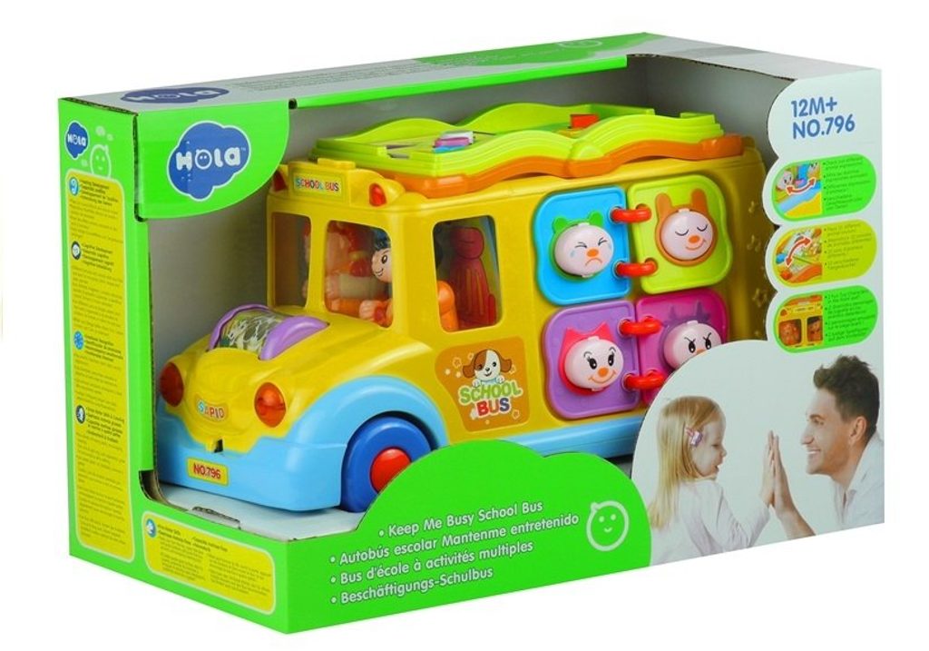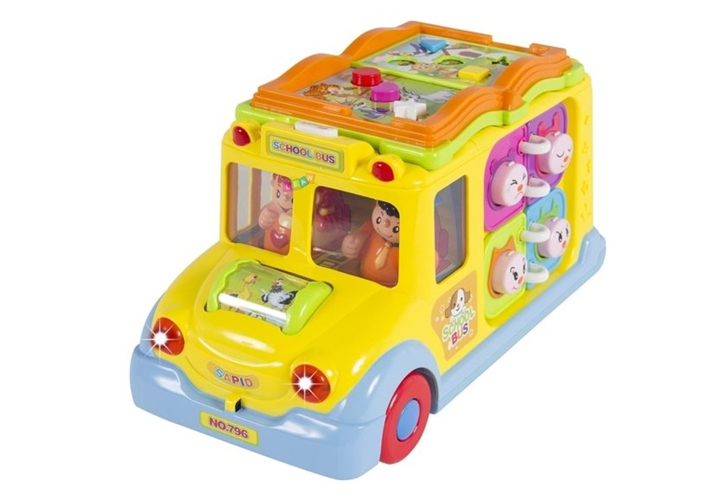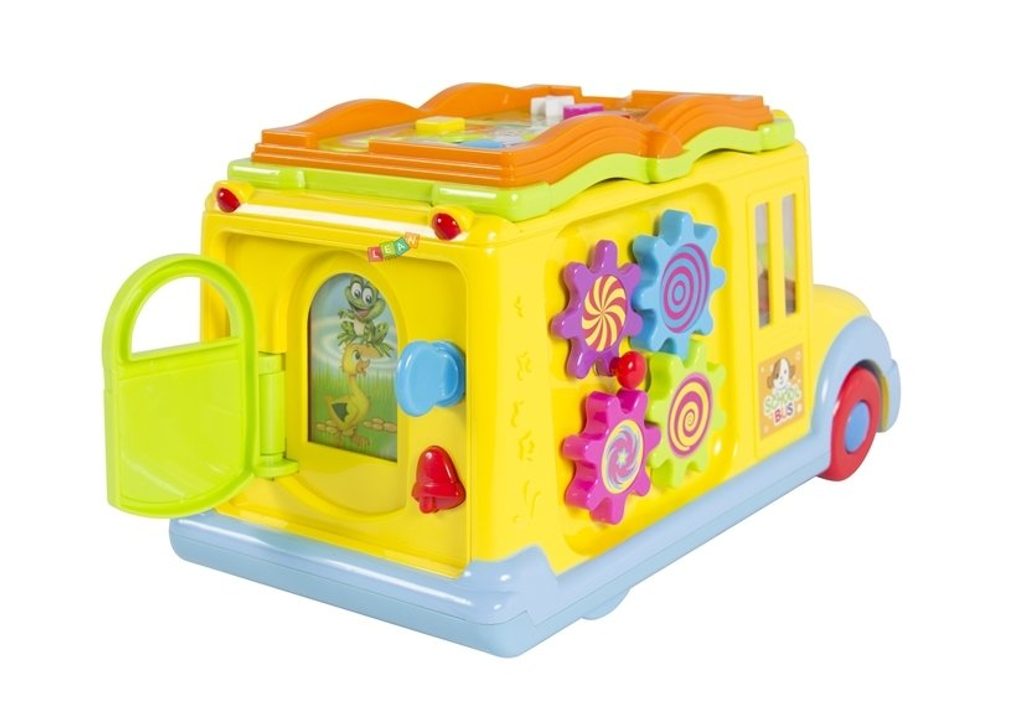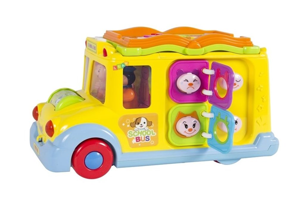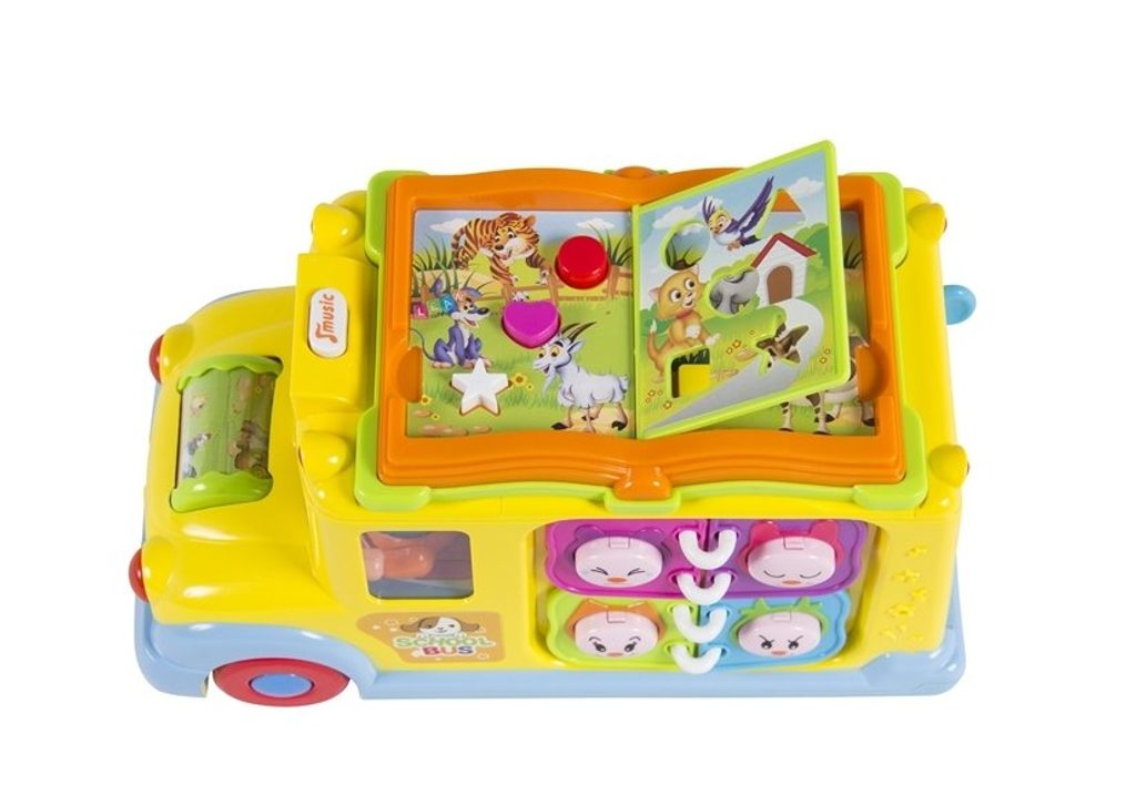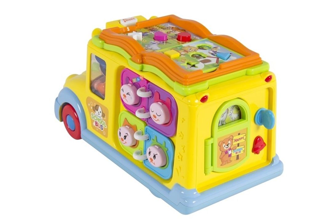 Interaktivní naučný autobus Funny Bus se zvuky Huile Toys je ideální hračkou pro ty nejmenší děti. Umožní dítěti rozvíjet hmat, zrak, sluch a logické myšlení. Autobus jezdí sám a směr mění nárazem na překážku, pohon lze však i vypnout. Během jízdy svítí přední světla a postavičky v kabině se pohybují. Na přední kapotě je umístěný otočný váleček se zvířátky, který otočením vydává zvuky a svítí. Na střeše je umístěna knížečka s obrázky a tlačítky zvířátek, zmáčknutím se ozve hlas zvířátka na obrázku. Boční strana autobusu je vybavena otočnými kolečky, druhá strana má knížeku s obrázky tvářiček v různé náladě. Zadní strana autobusu má zvonek a dvířka, které ukrývají 3 různé obrázky. Hračka je určena pro děti od 12 měsíců věku.
