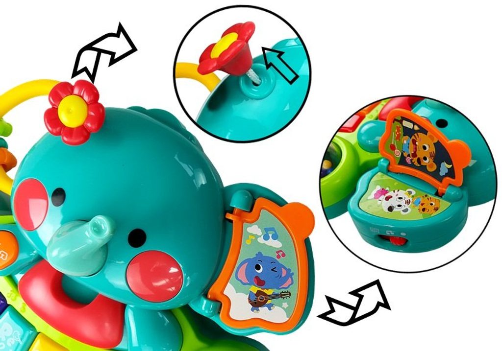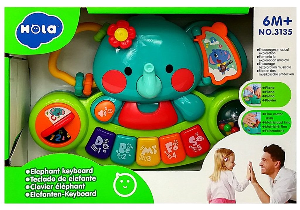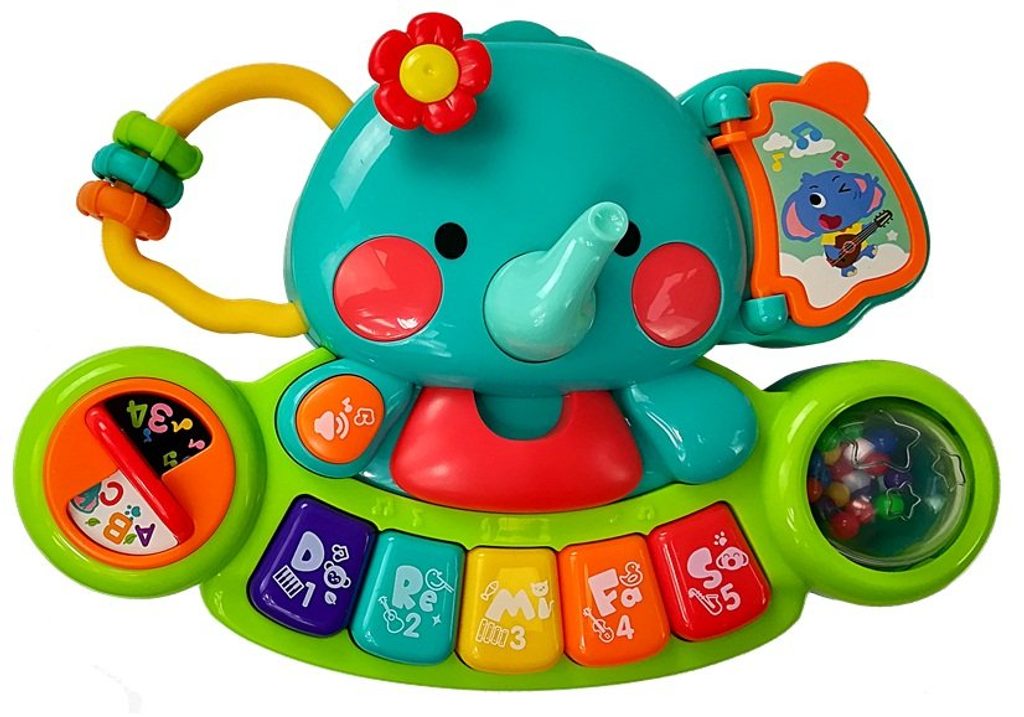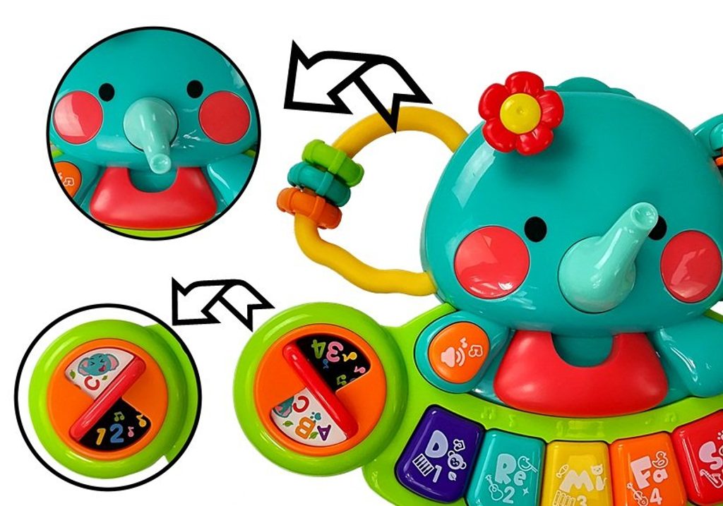 Interaktivní klávesnice ve tvaru sloníka se zvuky a světly Huile Toys je ideální hračkou pro ty nejmenší děti. Umožní dítěti rozvíjet hmat, zrak, a sluch. Jsou vybaveny klávesami, kdy se mačkáním přehrávají zvuky čísel od 1 do 5 v angličtině nebo zvuky různých zvířátek. Klávesnice jsou vybaveny otočným chobotem, knížečkou s obrázky a také malinkým chrastítkem. Hlasitost lze regulovat. Hračka je určena pro děti od 6 měsíců věku.