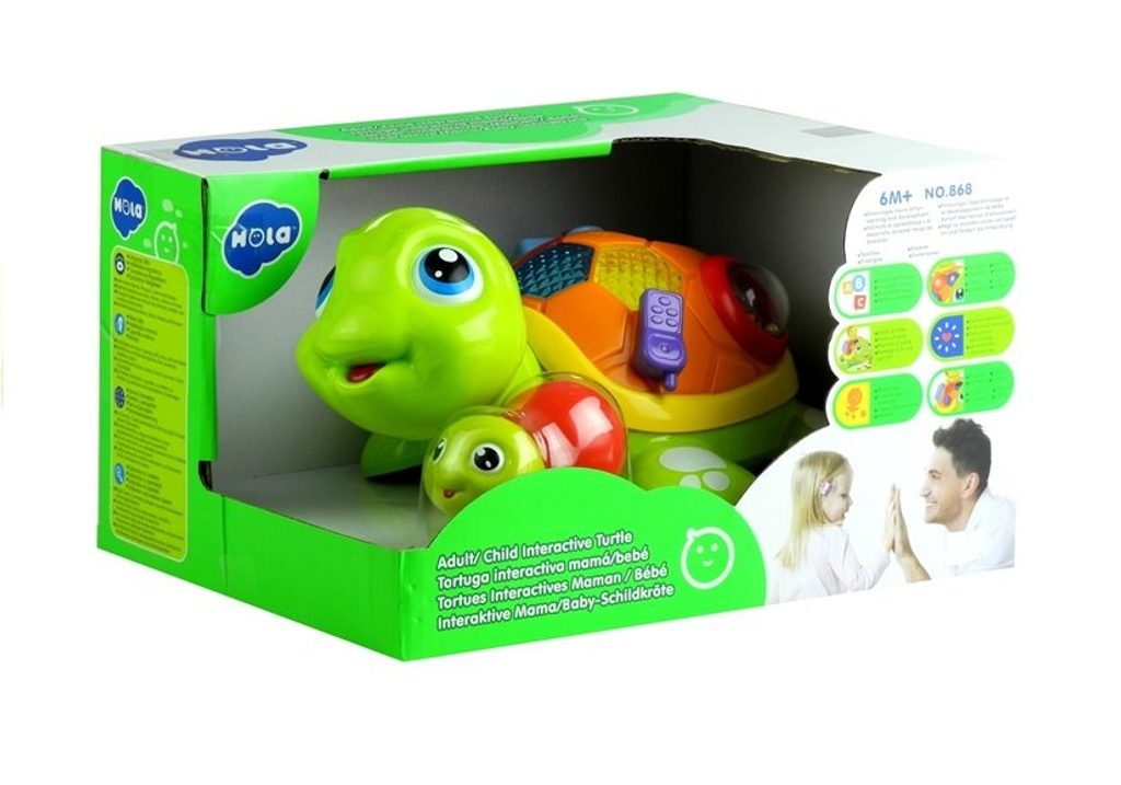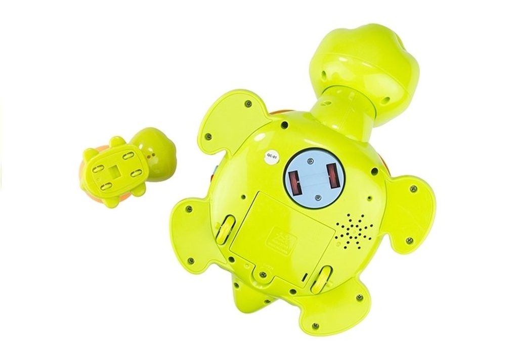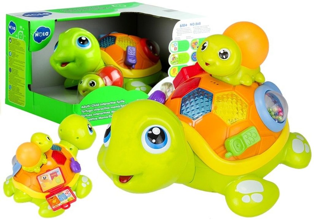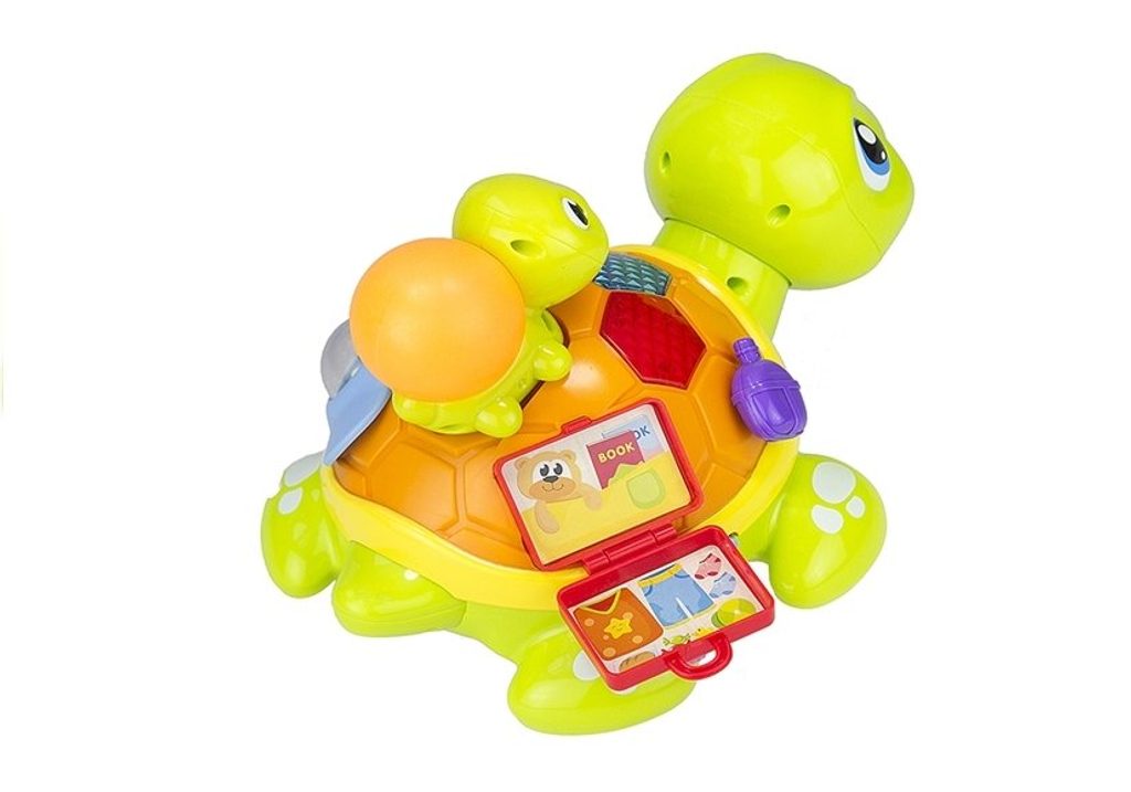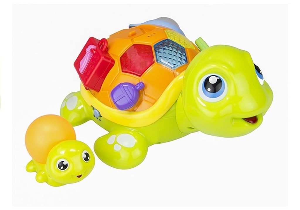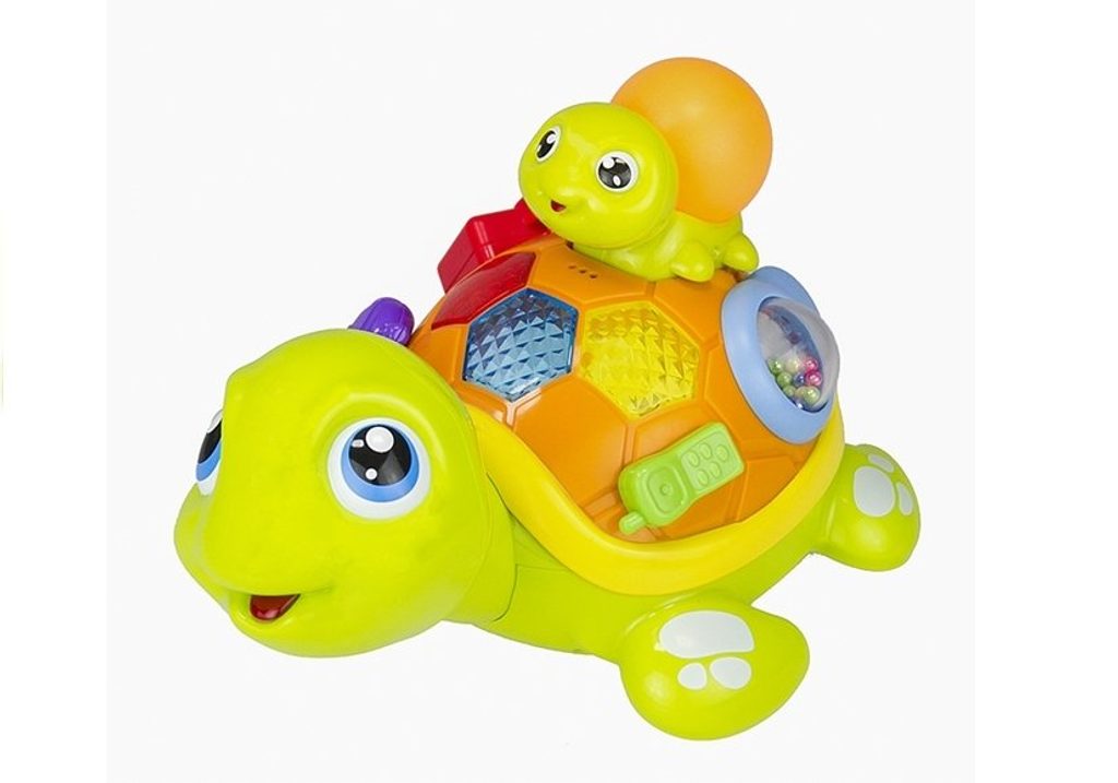 Interaktivní hračka Želvičky se zvuky a světly Huile Toys je ideální hračkou pro ty nejmenší děti. Umožní dítěti rozvíjet hmat, zrak a sluch. Malá želvička lze jednoduchým způsobem nasadit na krunýř větší želvičky a tvořří tak nádherný celek. Větší želvička má na hlavičce a nožičkách pohybové senzory. Sama tak jezdí a odráží se od překážek. V horní části najdete také malinký otevíratelný kufřík s obrázky, průhledné chrastítko a telefon. Po zapnutí se želvičky pohybují a vydávají veselé melodie. Jejich hlasitost lze regulovat nebo můžete hračku zcela vypnout tlačítkem zapnuto/vypnuto. Hračka je určena pro děti od 6 měsíců věku